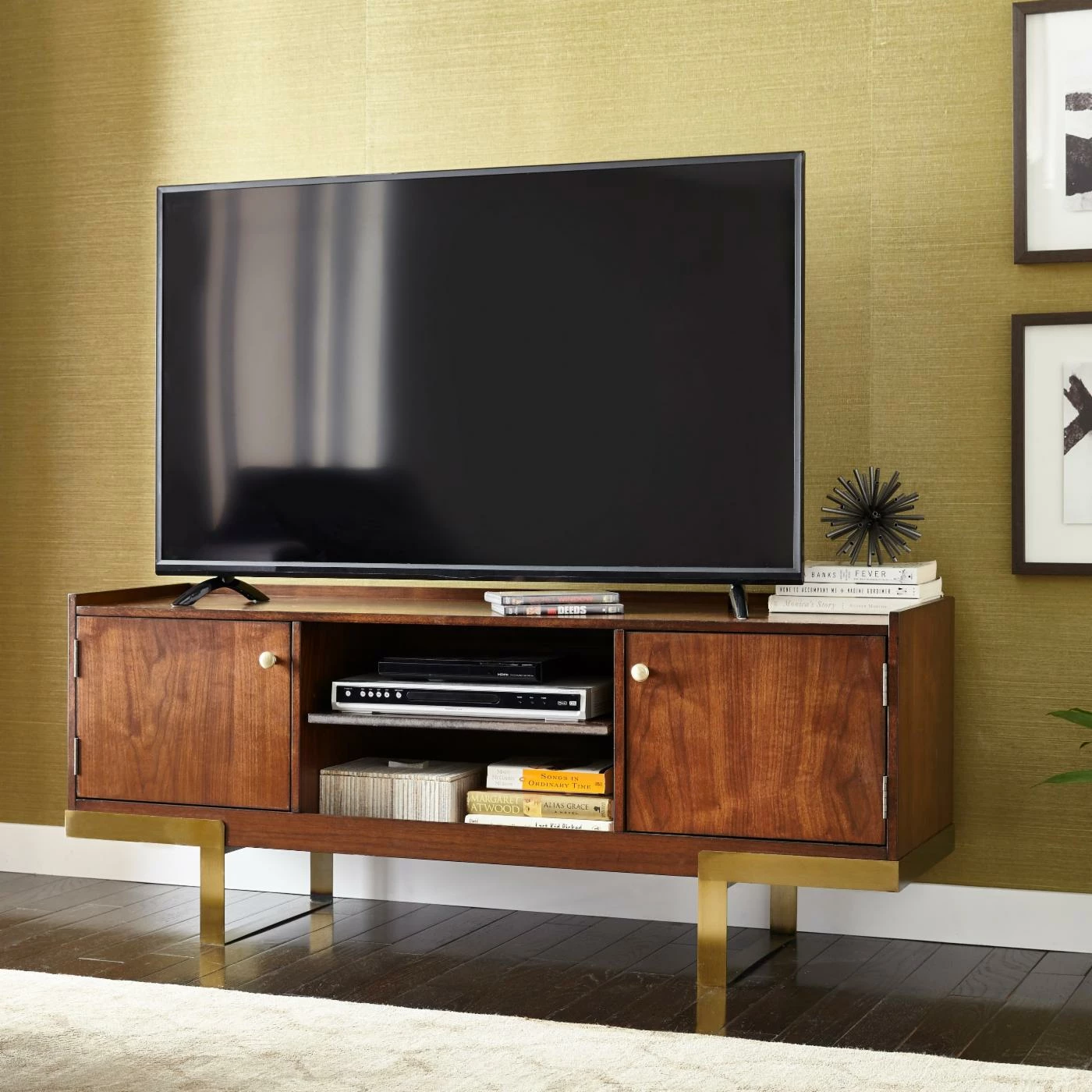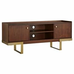 The angelo:HOME Luther TV Stand provides your new TV with a magnificent contrasting base. This TV stand is modeled after classic mid-century pieces, featuring metal L-shaped legs and a blocky cabinet. The cabinet is built from durable engineered wood that’s topped by wood-grain veneers and a walnut brown finish. Two single-door cabinets provide ample storage space for all your media and remotes while two open shelves offer wide, deep space for game consoles, cable boxes, and more. A handsome gold finish accents the legs.