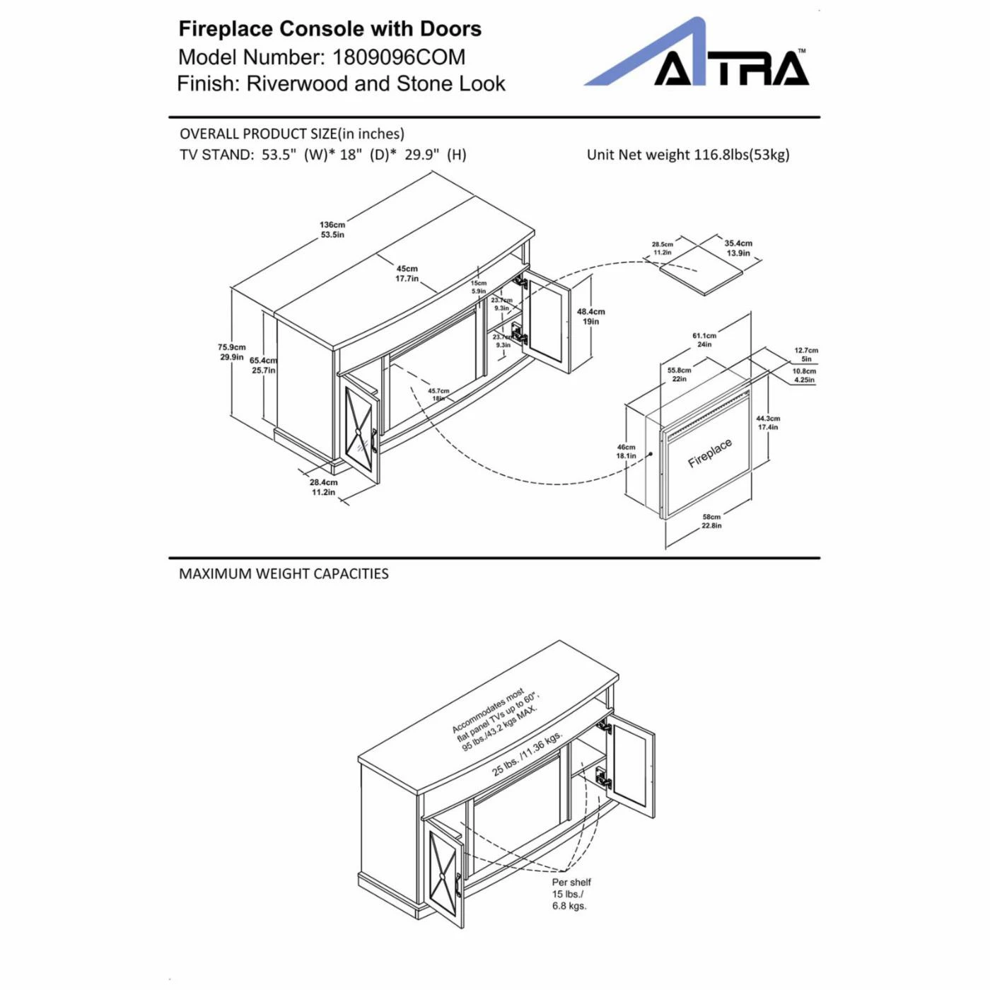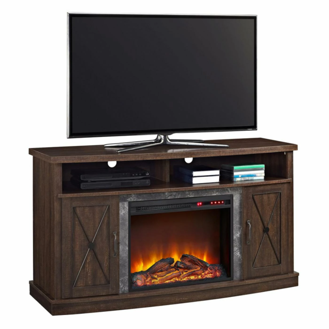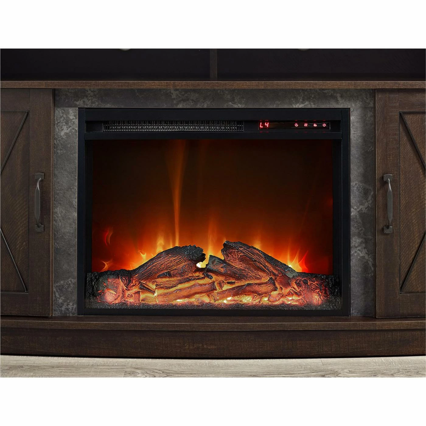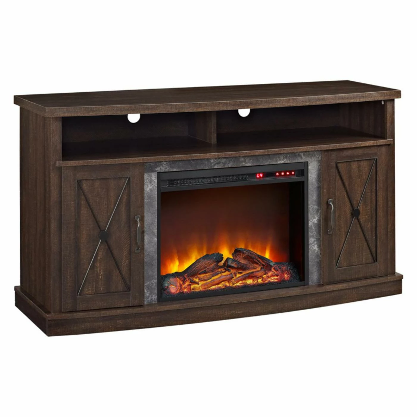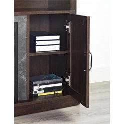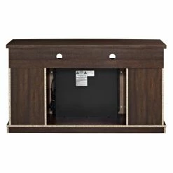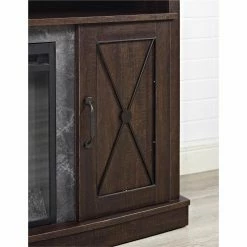 Banish the chill in your room with the Altra Barrow Creek Electric Fireplace 60 in. Console – Espresso.. It will support up to a 60 inch television and includes a large shelf for components. Your videos and remotes can be hidden behind the two doors that are enhanced with decorative crossbars and metal handles. The ventless electric flame insert with reflective back creates a realistic effect, with or without heat. Adjustments are easy with the four setting touch panel or the remote.
