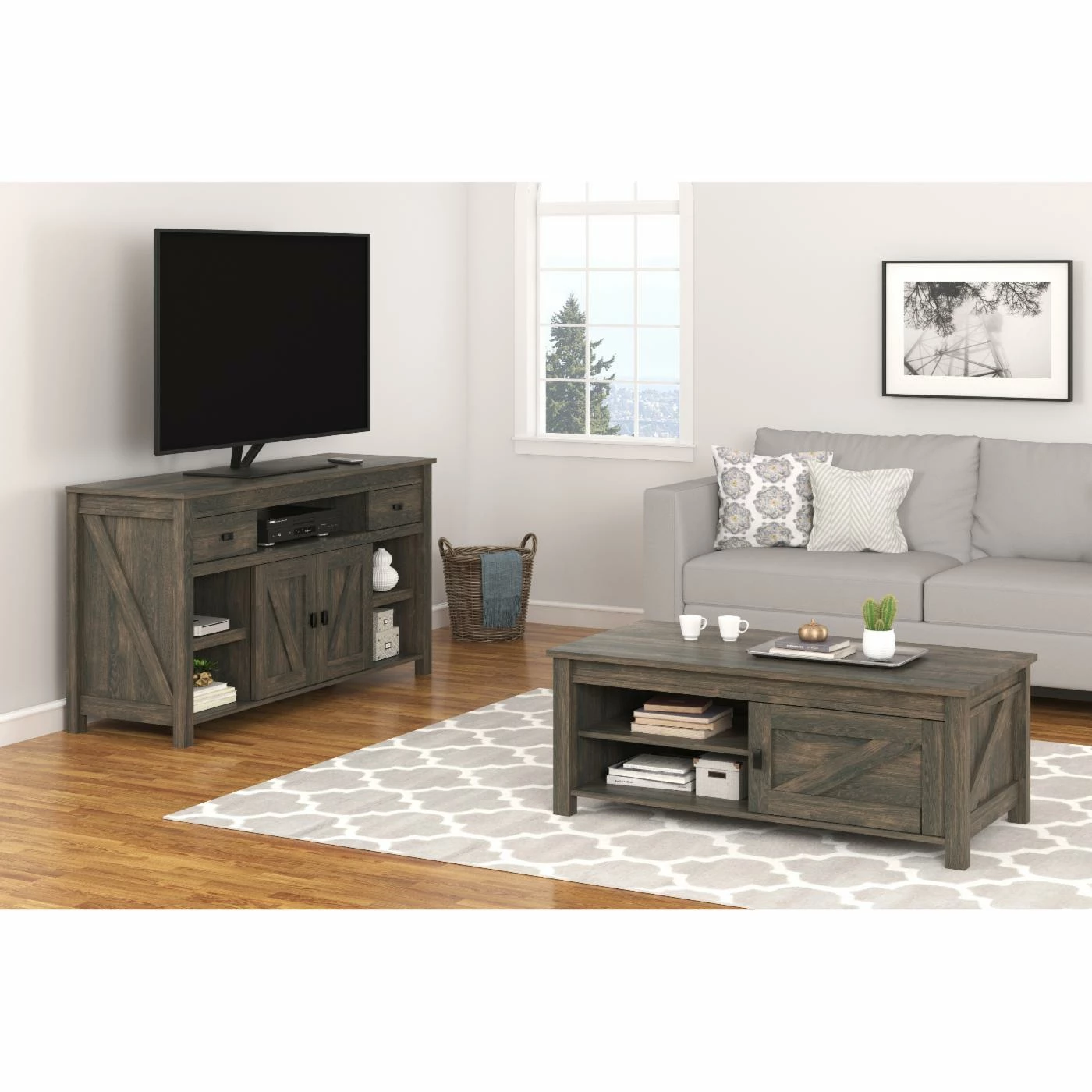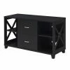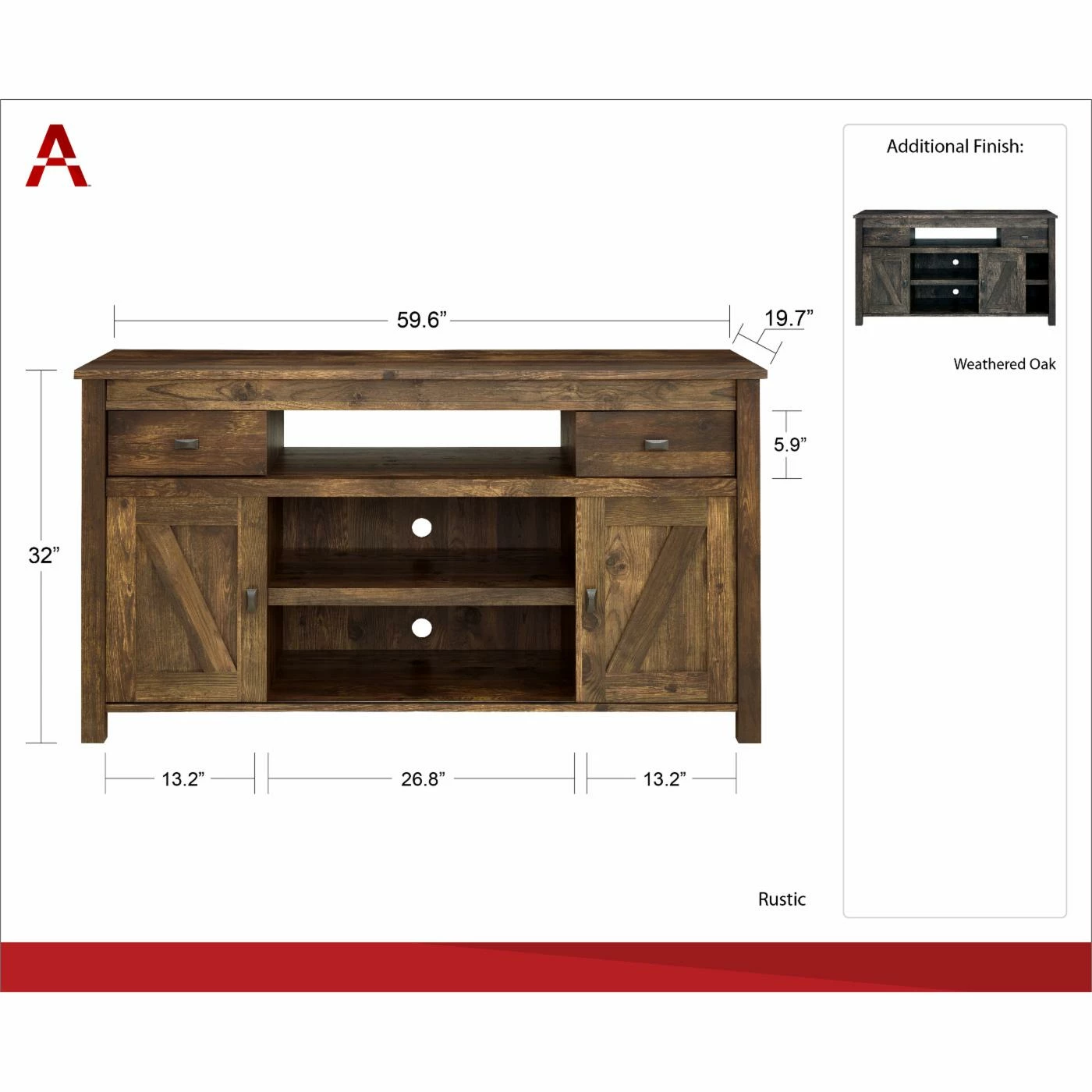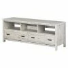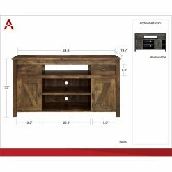 The Altra Farmington TV Stand features two sliding framed doors that were inspired by traditional barn doors on tracks. Plus, the Century Barn Pine finish wonderfully echoes the look of aged barn wood, and much like a barn itself, this TV stand is built for function, offering three open shelves and two drawers in addition to the sliding doors. The TV stand is crafted of wood, particleboard, and engineered wood and accommodates flat-panel TVs up to 65 inches wide with a maximum weight of 135 pounds.