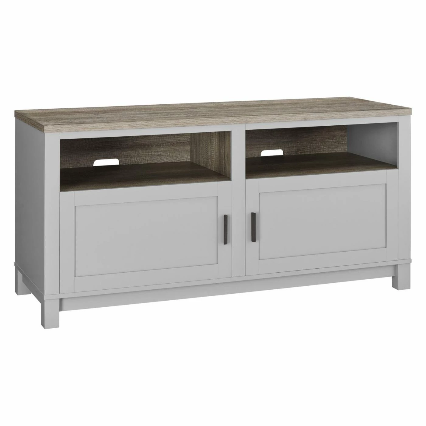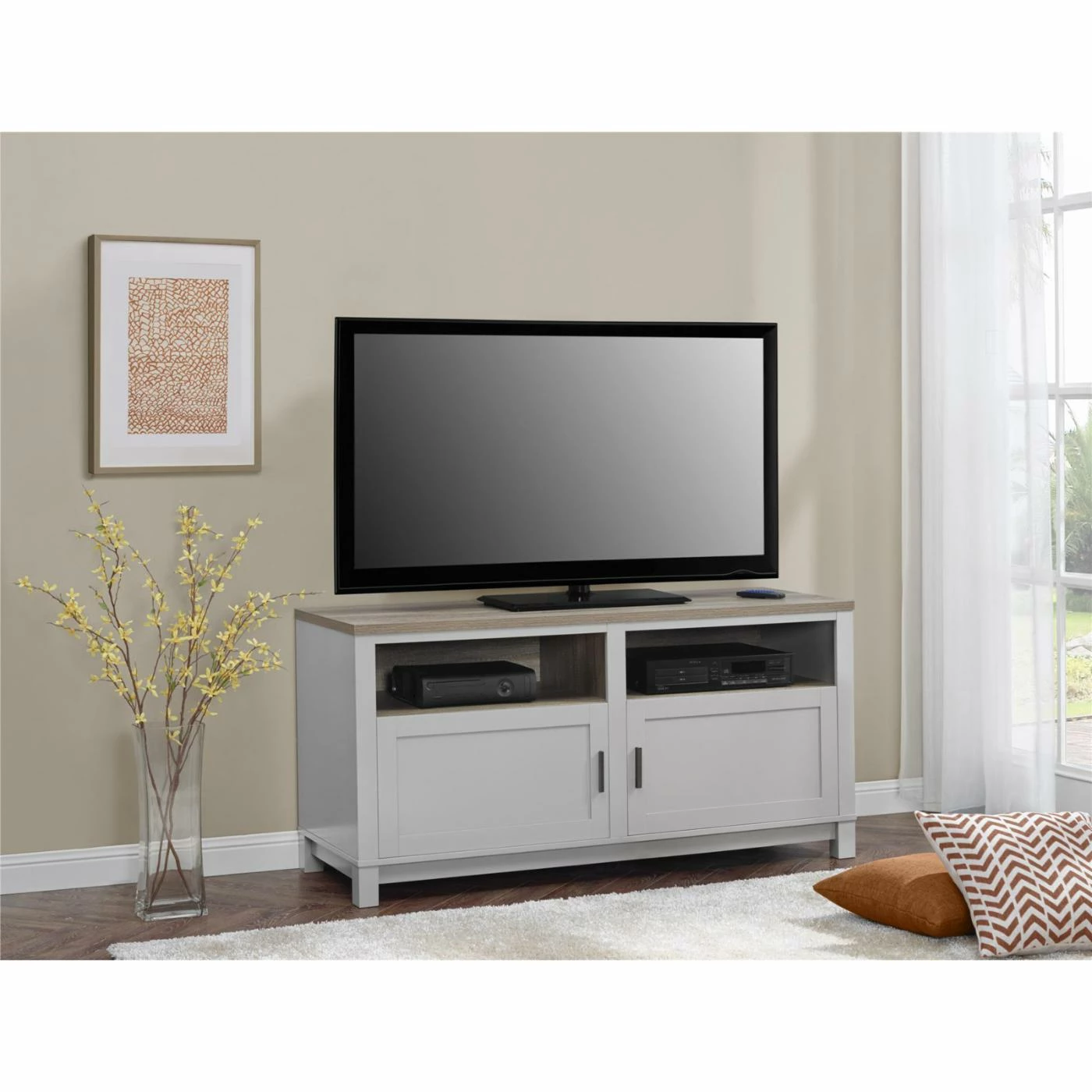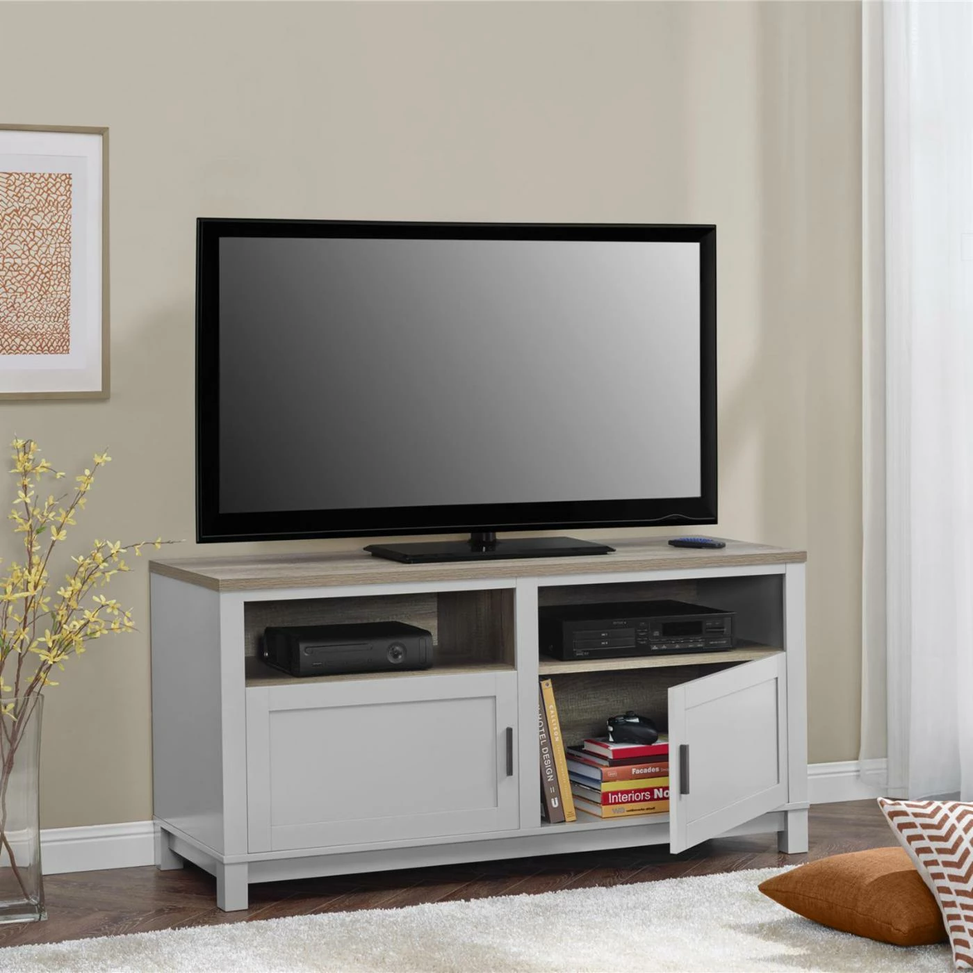 This Altra Furniture Carver TV Stand can meet all your entertainment needs and create a refined, clean look in your home. It features a distressed woodgrain top, with open shelving for simple access to a DVD player, cable box, or sound bar, while the 2 large doors provide encapsulated storage space. Cut outs in the back provide routing to keep cords organized. This stand can support flat panel TVs up to 95 lbs. and 60 in. wide. Assembly required upon delivery.