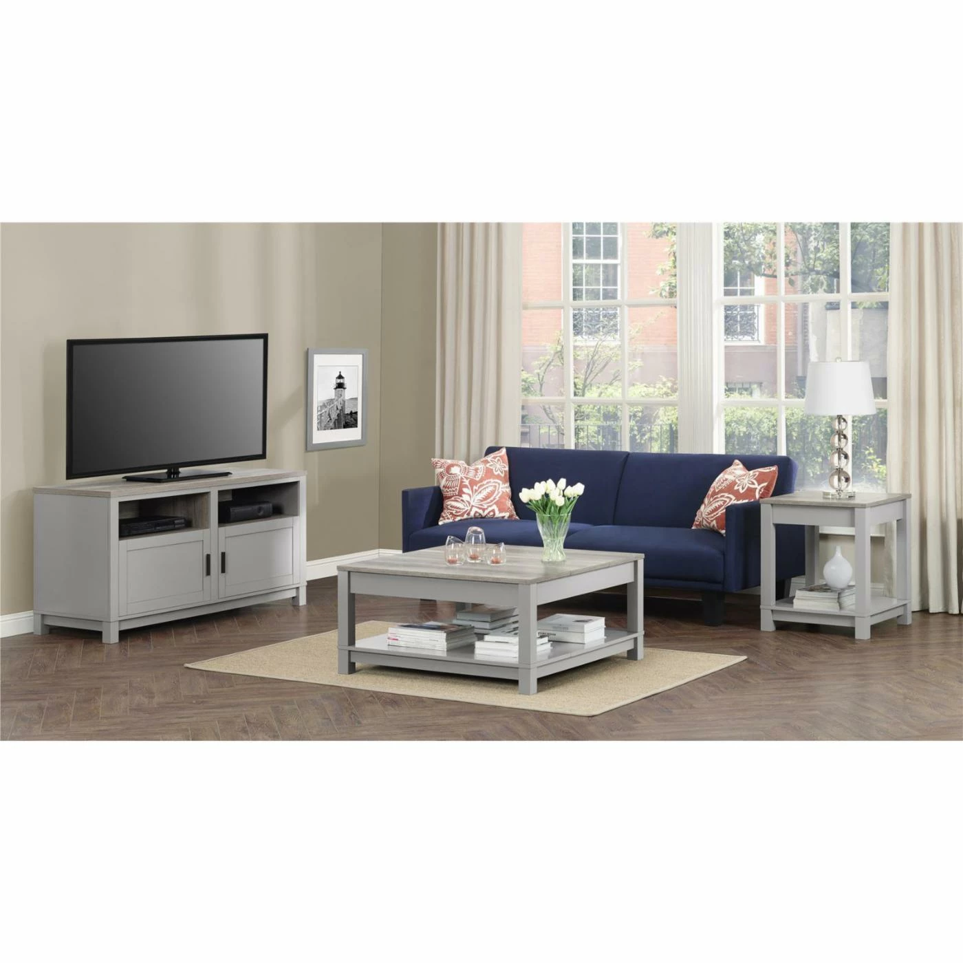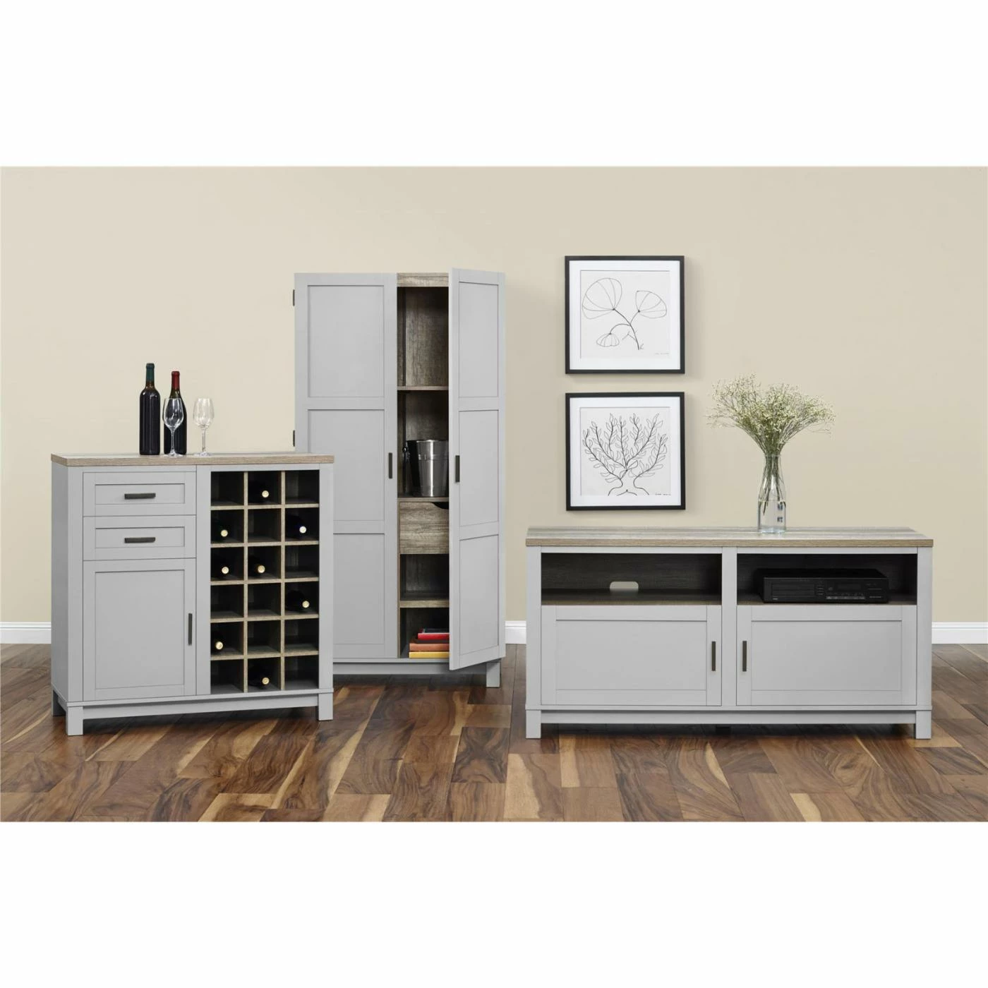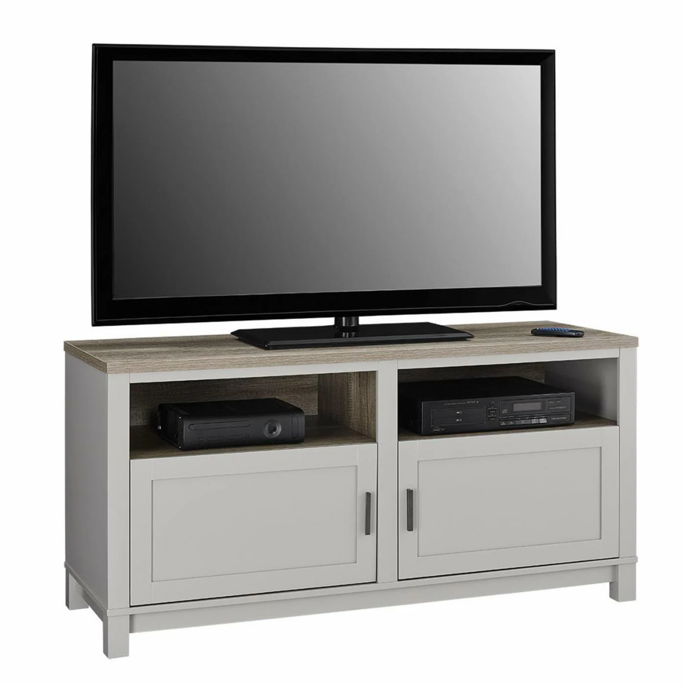 This Altra Furniture Carver TV Stand can meet all your entertainment needs and create a refined, clean look in your home. It features a distressed woodgrain top, with open shelving for simple access to a DVD player, cable box, or sound bar, while the 2 large doors provide encapsulated storage space. Cut outs in the back provide routing to keep cords organized. This stand can support flat panel TVs up to 95 lbs. and 60 in. wide. Assembly required upon delivery.