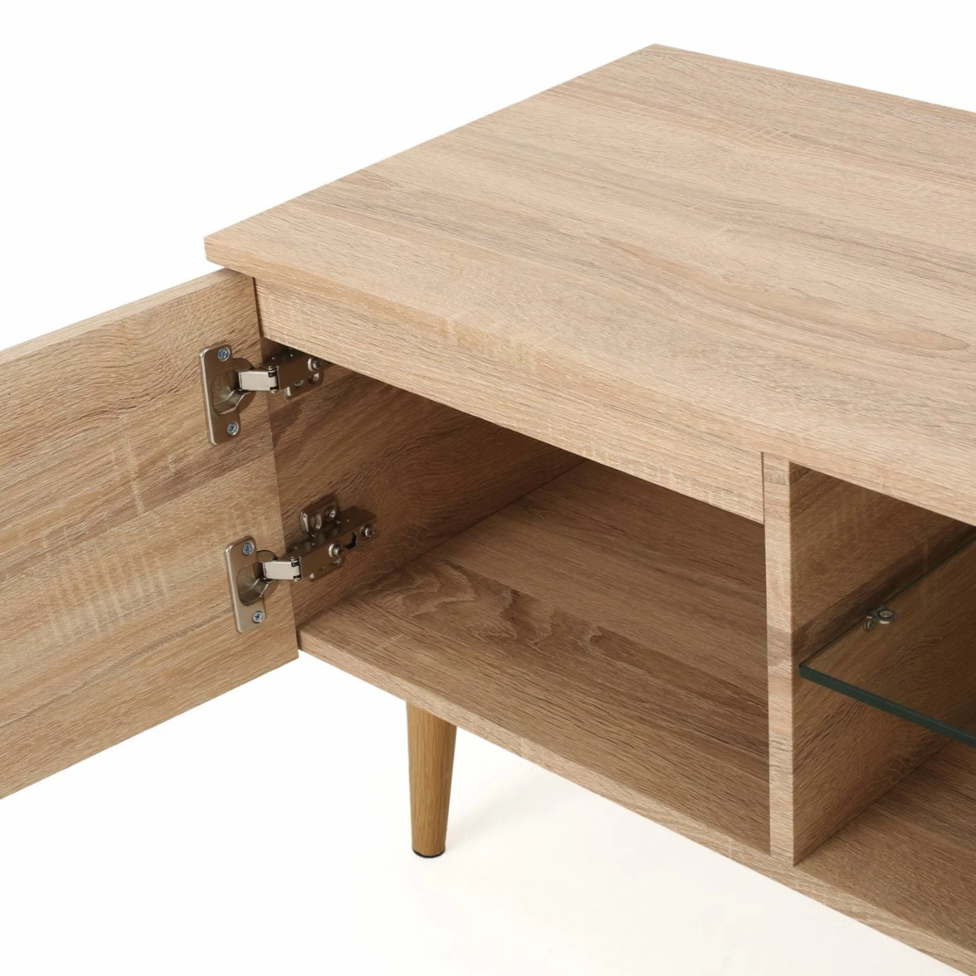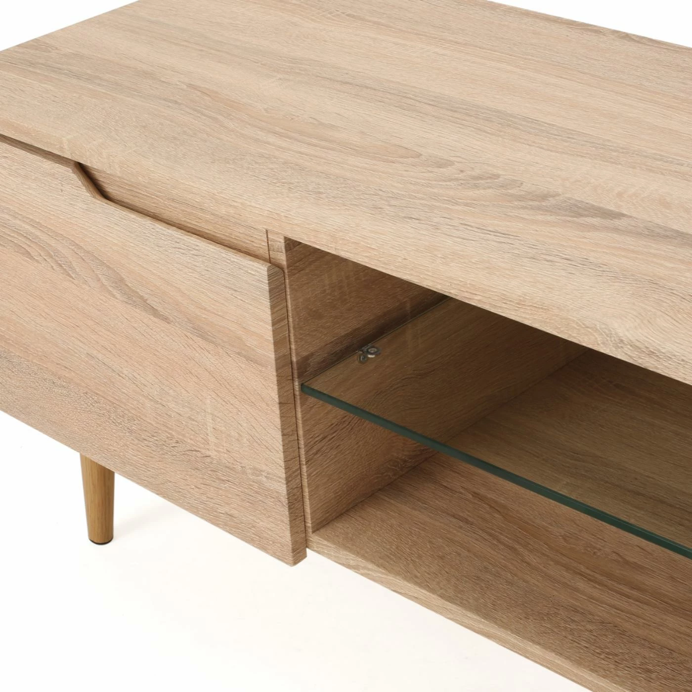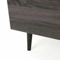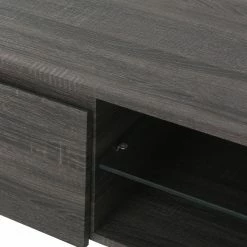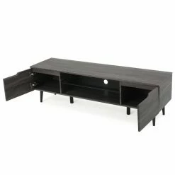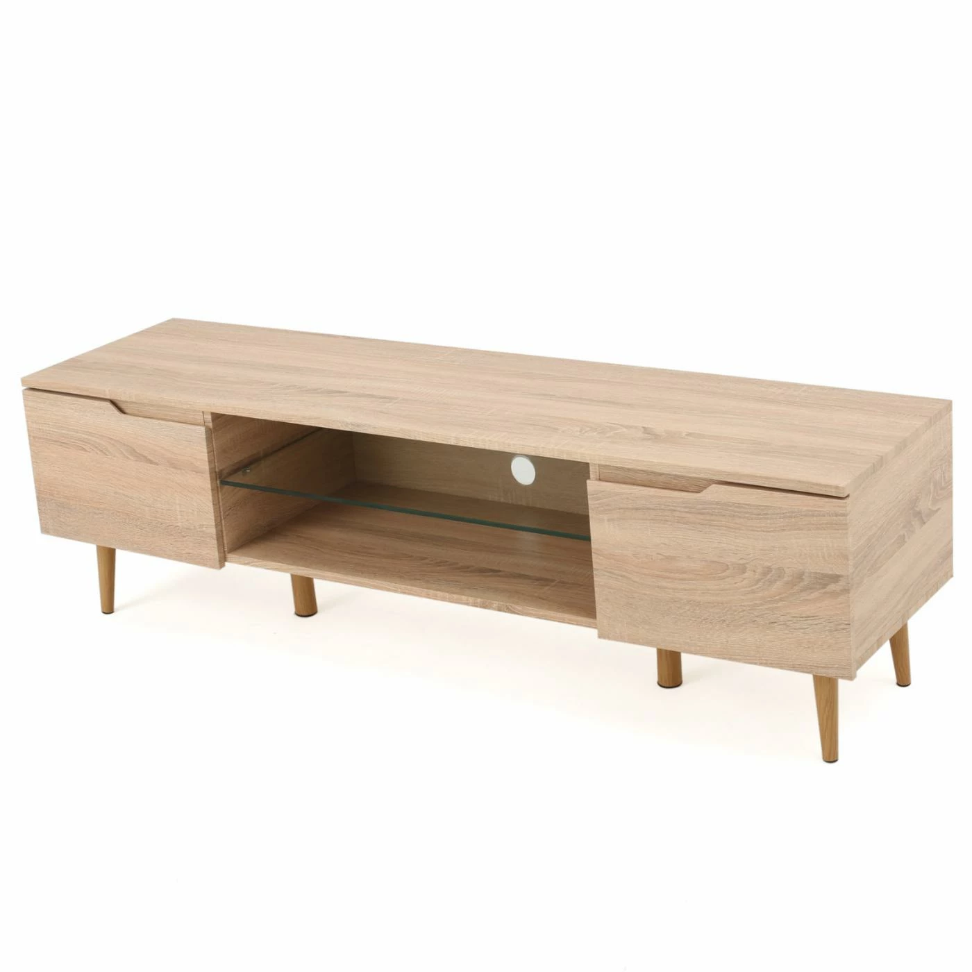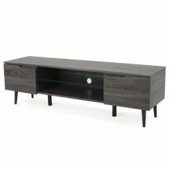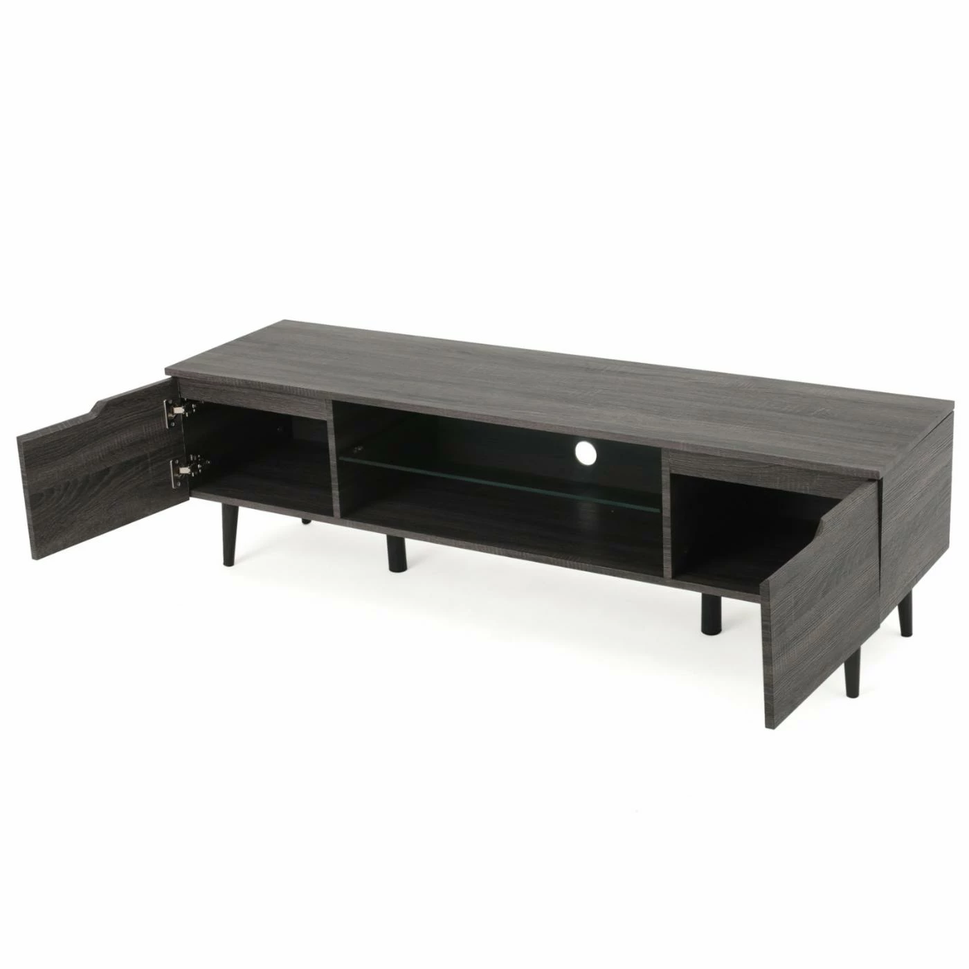 Bring a contemporary look to your living room with the Elton 59 in. Wood TV Stand. Crafted with solid wood, this TV stand is sure to be long-lasting and sturdy. Choose from available colors to compliment your dΓ©cor. Hide away your movies, games, and other living room essentials in the two enclosed cupboards. Two shelves, one wood and one glass, provide space to place components. A cord hole allows you to easily connect components and organized chords. This stand holds up to a 65 in. TV. Keep your home entertainment system organized and tidy with this sleek TV stand.