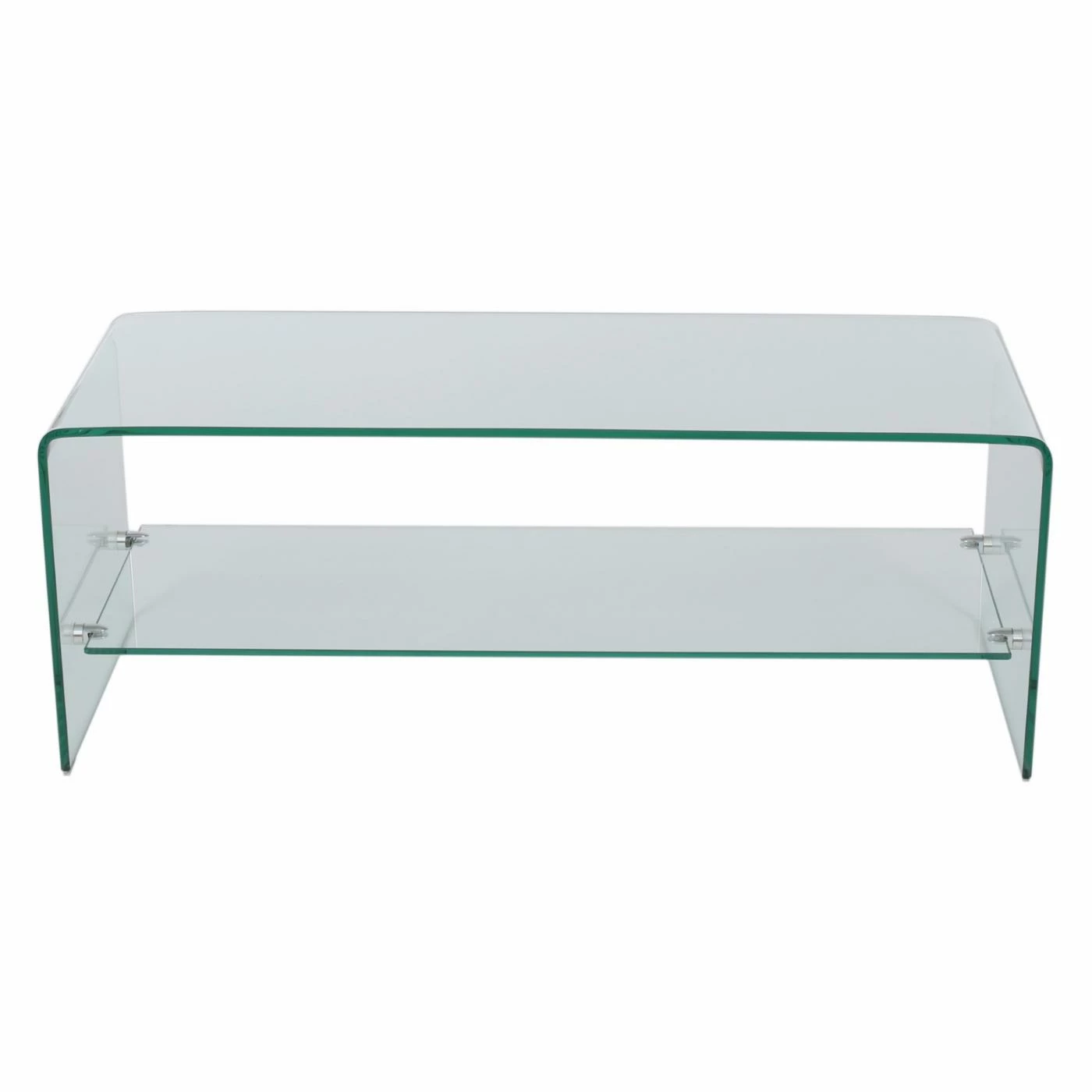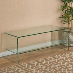Make your living room feel cleaner and brighter with the addition of the Miami-Dade TV Stand. This TV stand has a simple, minimalist look that provides storage and functionality without an overbearing presence. Thick tempered glass is used to construct the piece, featuring wide-legged sides that curve upward into the top. A full-width shelf offers an ideal perch for stereos, video game systems, and other accessories. The glass is completely transparent and adds to the piece’s streamlined, modern appearance.