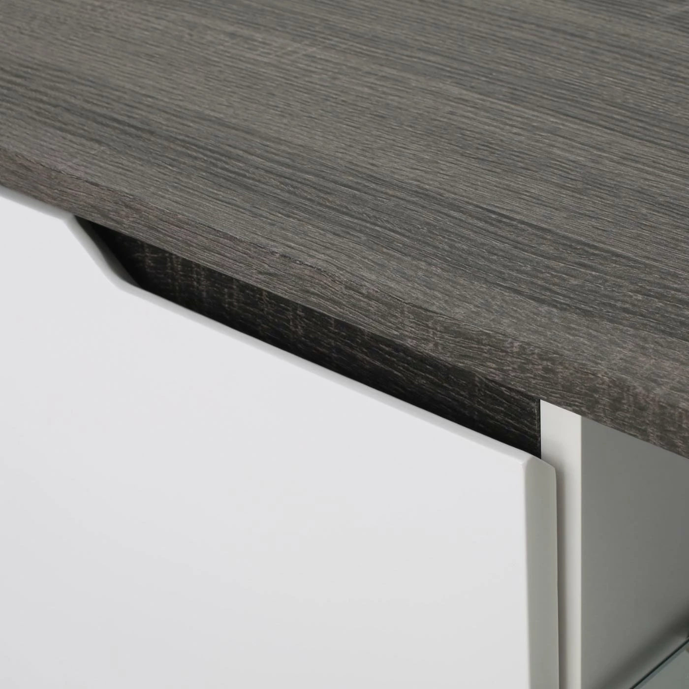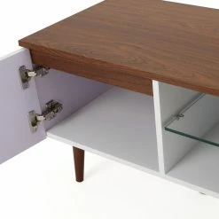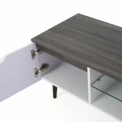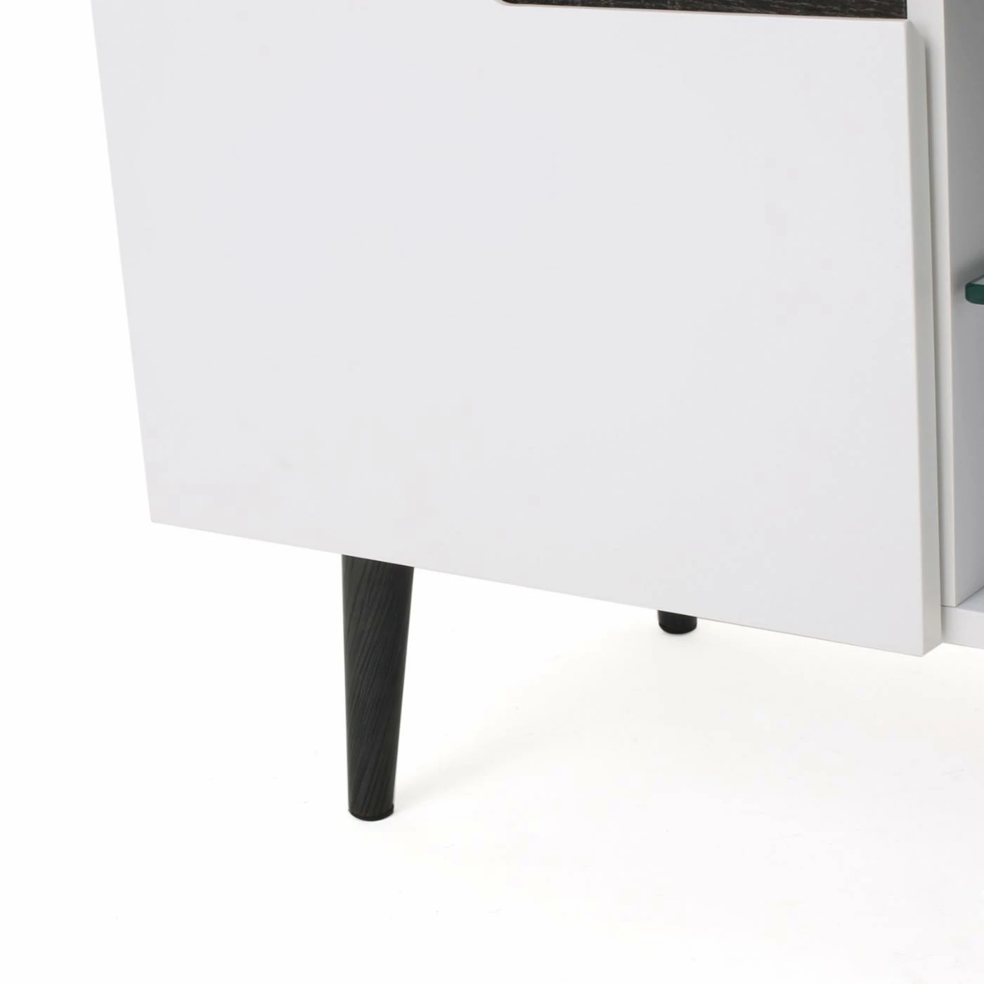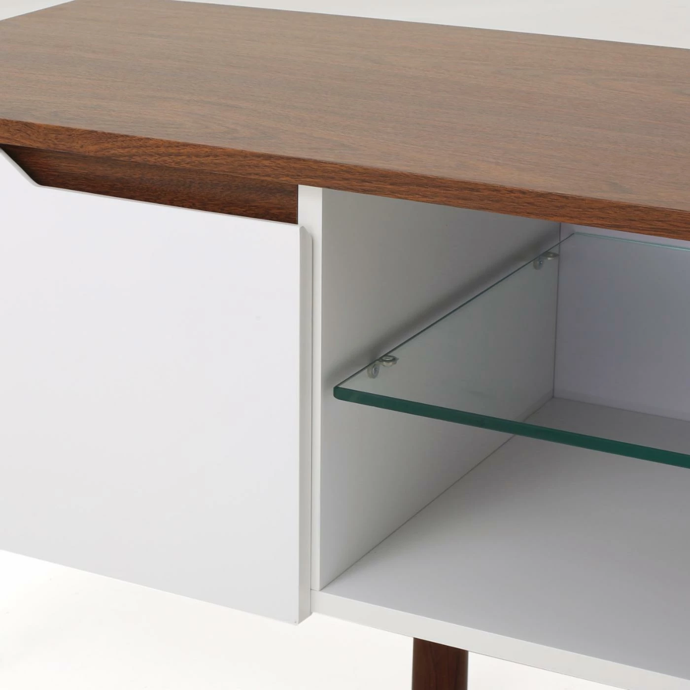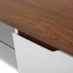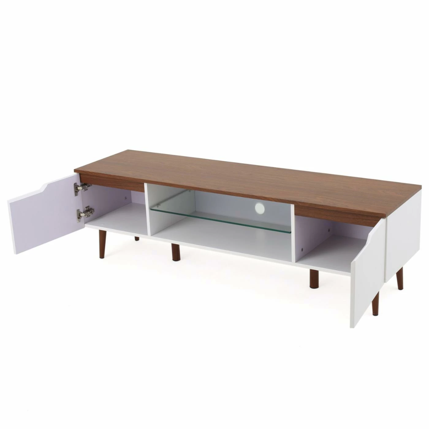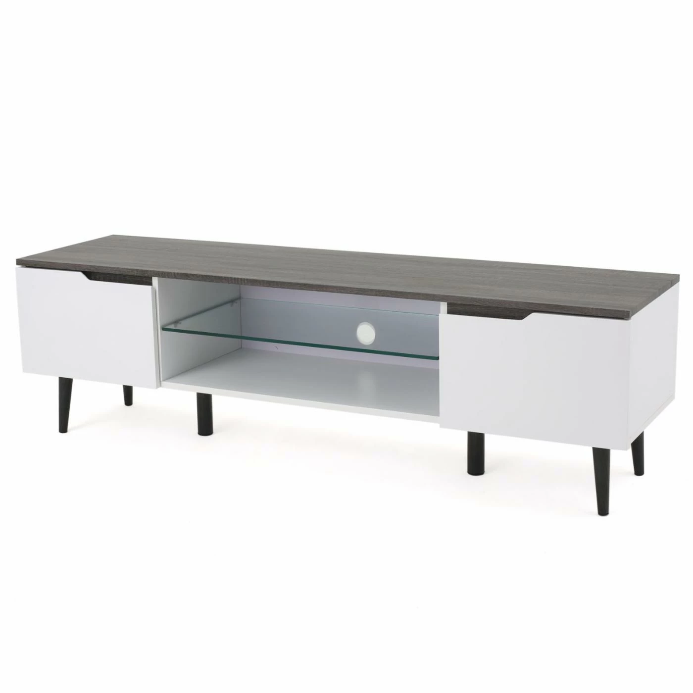 Enjoy your home entertainment system on the Rowan 59 in. Two-Toned TV Stand. This TV stand can support TVs up to 56 in. The solid wood construction with veneers ensures that this TV stand is sturdy and durable. Two side cubbies offer ample storage for your movies, games and other living room essentials. A lower shelf and glass shelf provide space for your components, as well as a cord hole for easy connections. Choose from available finishes to coordinate with your dรฉcor. Bring a touch of modern style to your living room or den with this sleek TV stand.