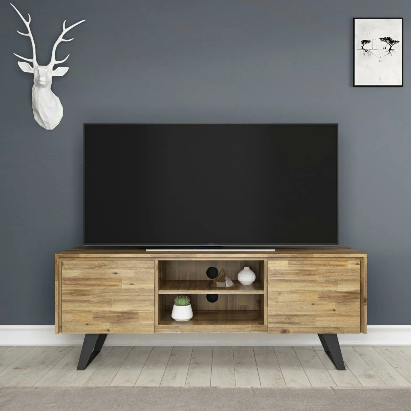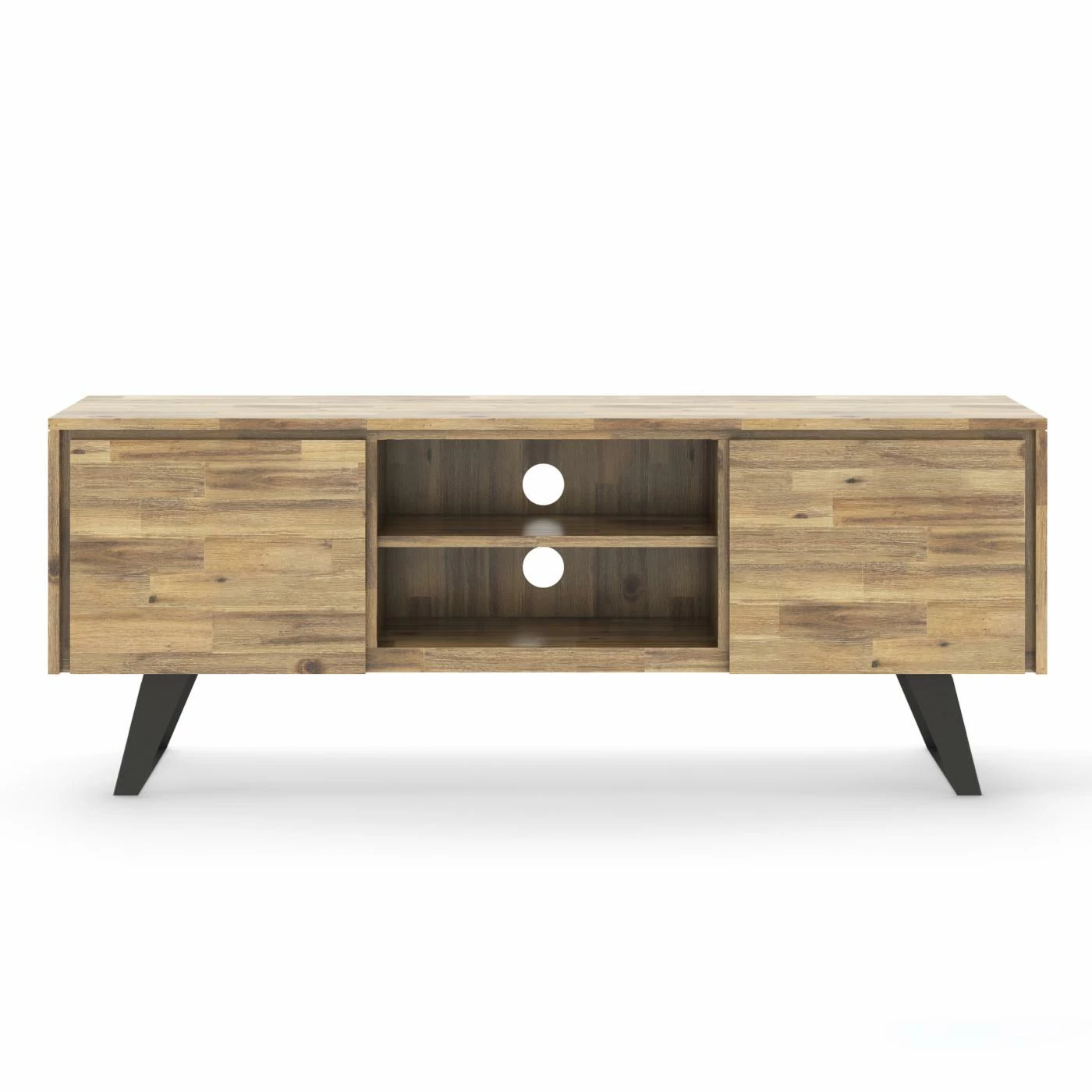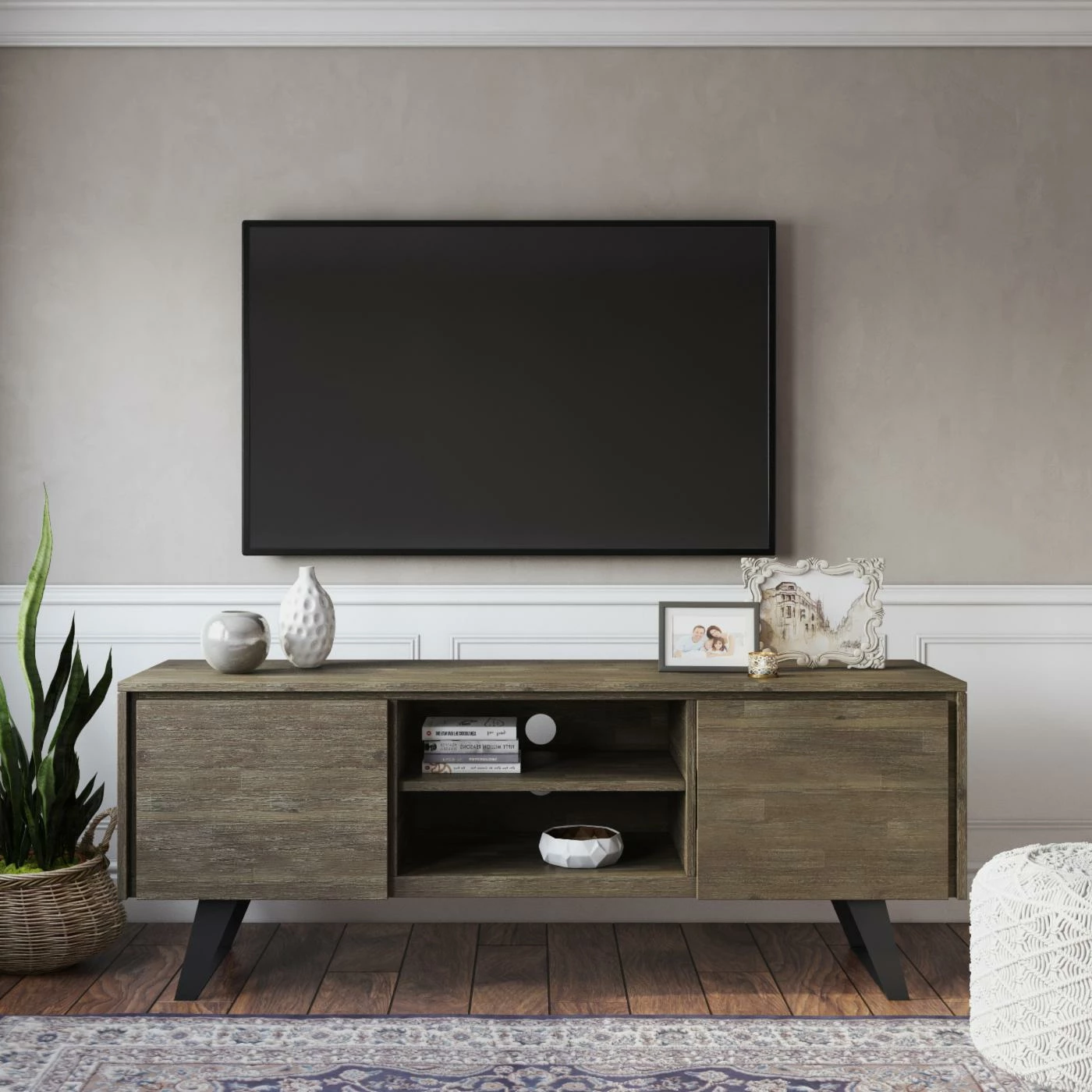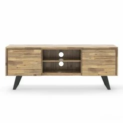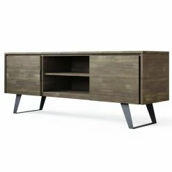Carefully crafted from beautifully grained solid Acacia and solid metal legs, our Brooklyn & Max Fulton Modern Industrial TV Media Stand brings an Urban, Industrial look to your living space. This functional TV Stand provides a durable base for your widescreen TV, as well as storage for media + game components and accessories. The back panel has precut cable management holes to keep unsightly wiring out of sight, and the distressed finish provides a sophisticated accent to any room