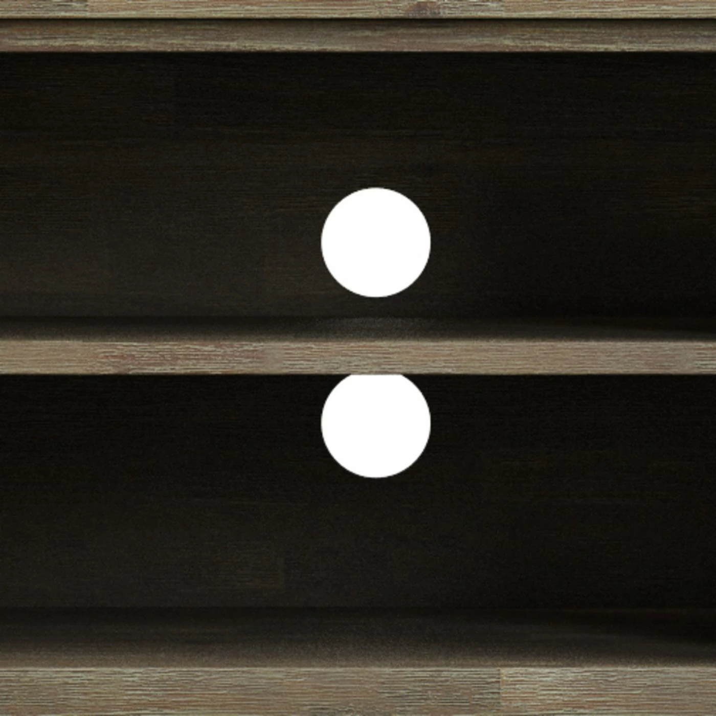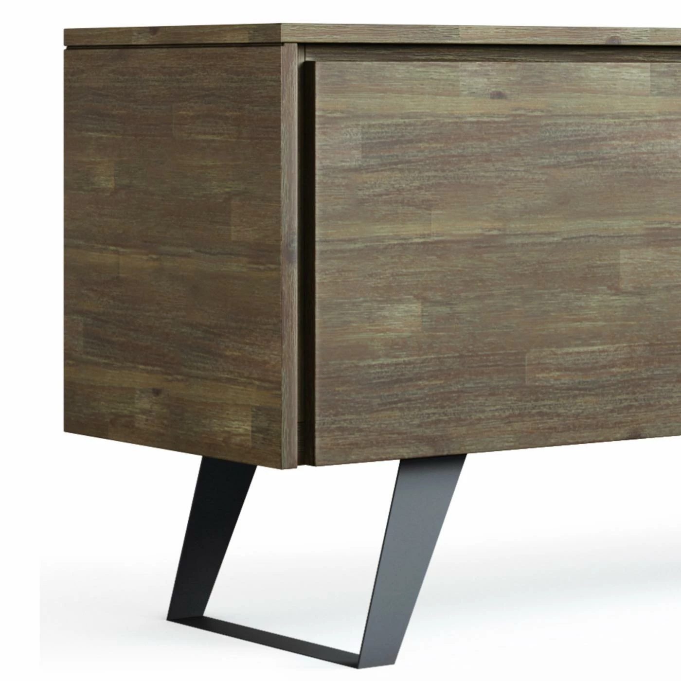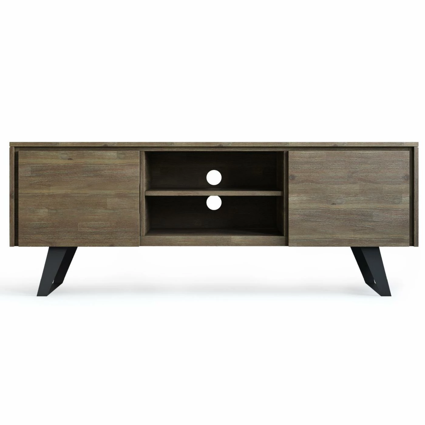 Carefully crafted from beautifully grained solid Acacia and solid metal legs, our Brooklyn & Max Fulton Modern Industrial TV Media Stand brings an Urban, Industrial look to your living space. This functional TV Stand provides a durable base for your widescreen TV, as well as storage for media + game components and accessories. The back panel has precut cable management holes to keep unsightly wiring out of sight, and the distressed finish provides a sophisticated accent to any room