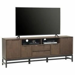 The Brooklyn + Max Argyle Mid Century 72 inch Wide TV Stand is a key player in one of the most technically demanding spots of the house. This wide TV stand features ample covered storage, open shelves, and all the room you need to fit a flat-panel TV and all the consoles and cable boxes that go with it. This piece is crafted from walnut-finished solid rubberwood under a protective coating of non-catalyzed lacquer. The modern TV stand provides you with a drawer for media storage and a drop-down door that’s perfect for covering electronic components. Interior storage cabinets behind each of the four remaining doors provide a simple solution to keep this busy space neat and tidy. There’s also ample cord access cutouts at the rear of each compartment.