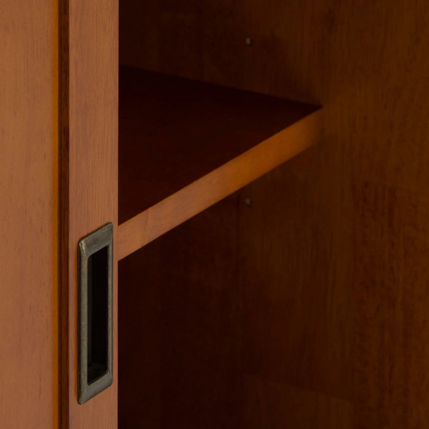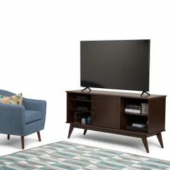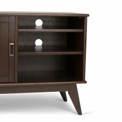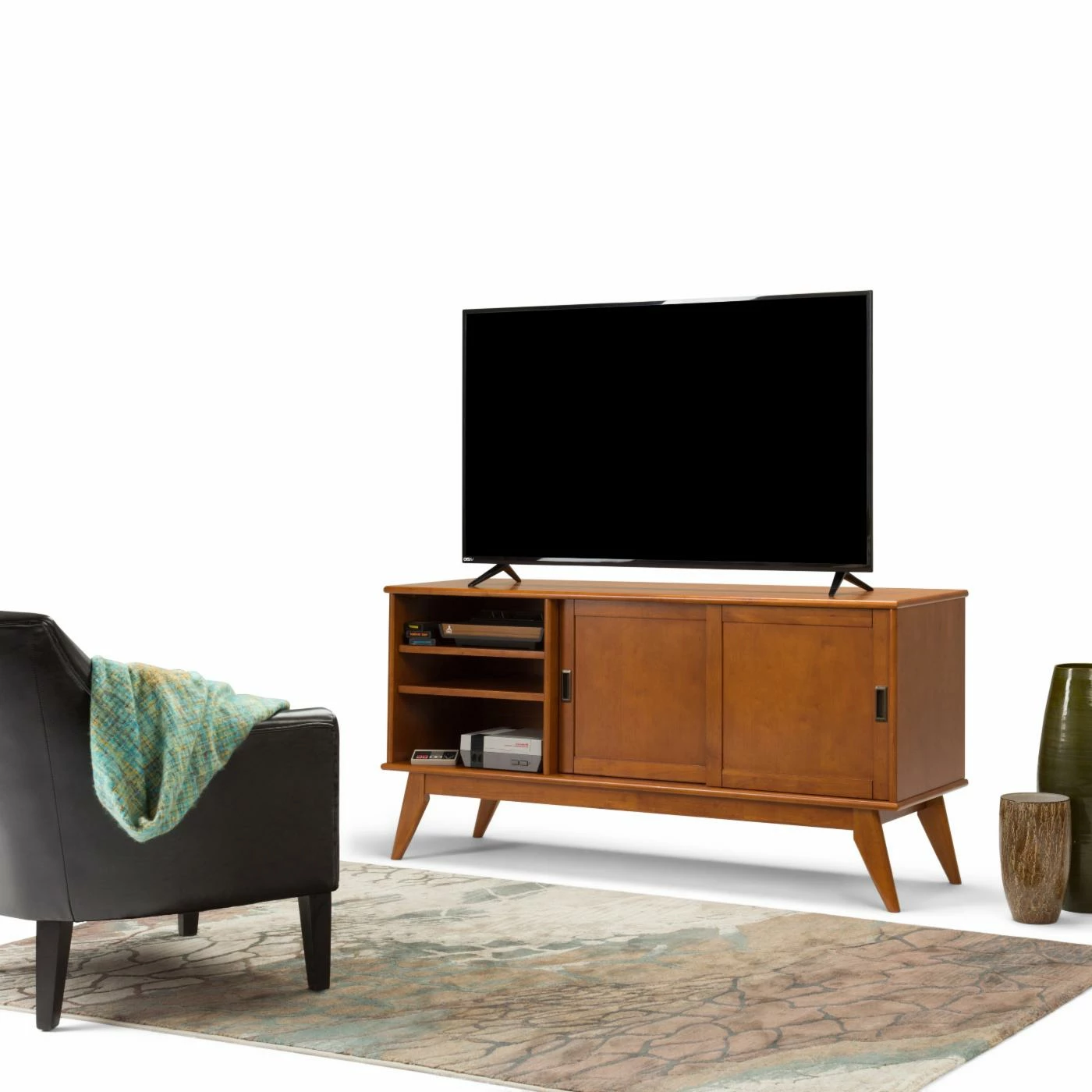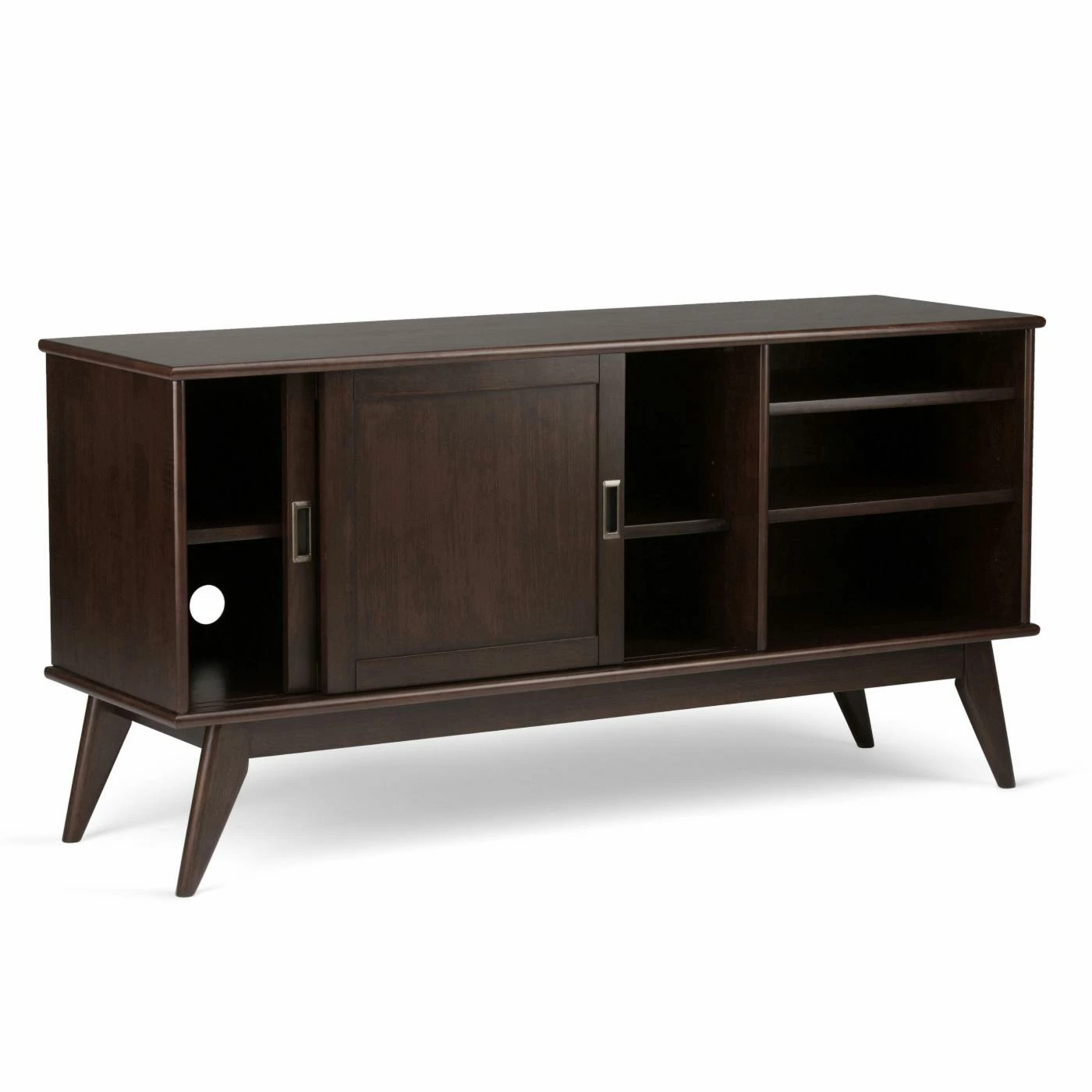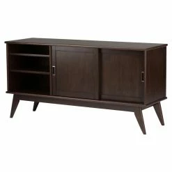 The Brooklyn + Max Baxter Solid Hardwood Mid-Century Sliding Door TV Media Stand‘s mid-century looks blend into any home. This timeless piece is made of rubberwood and plywood. Store your media components behind the two sliding doors with four adjustable shelves to customize your storage needs. Plenty of media cutout holes allow you to store every electronic device you need.