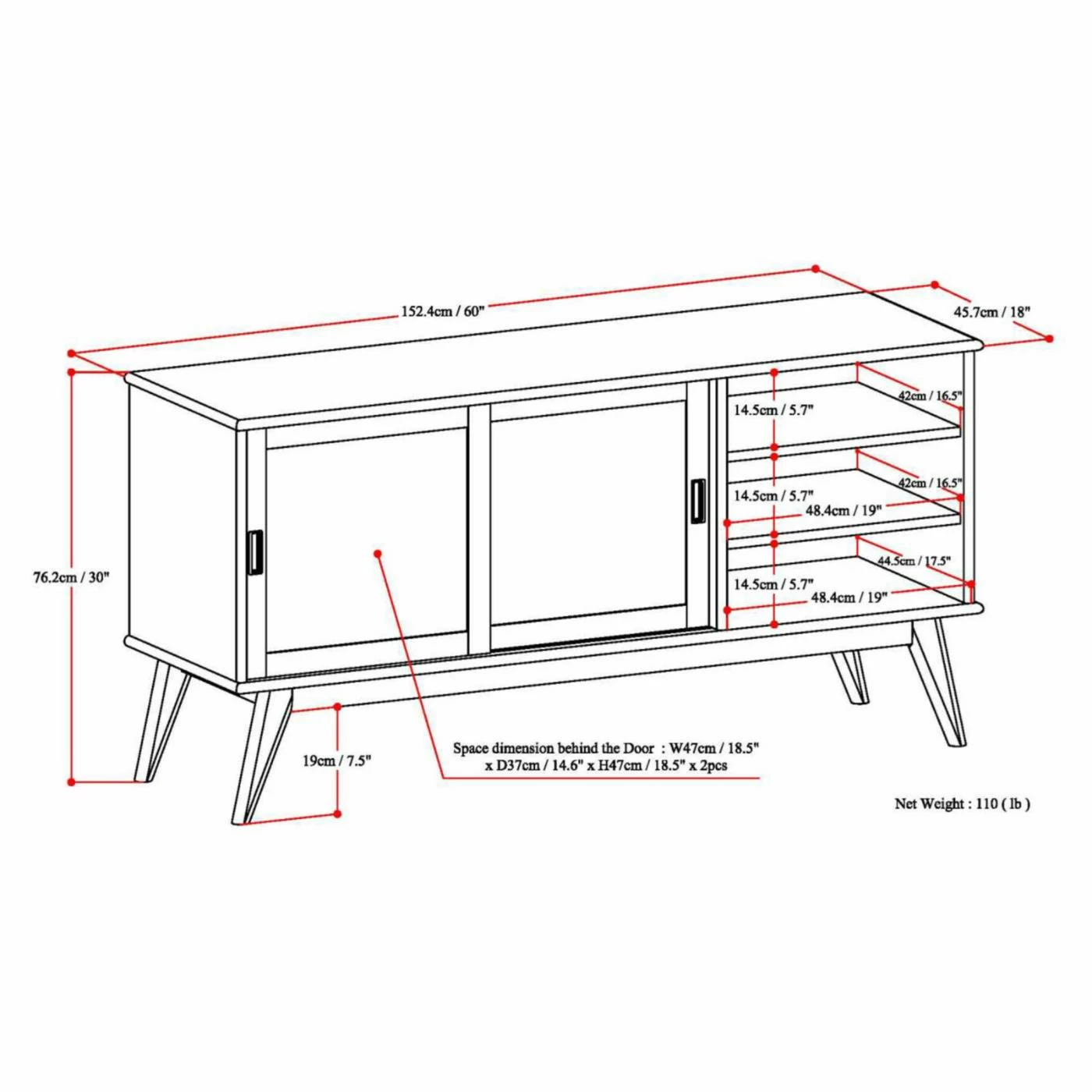 - 60W x 18D x 30H in., holds a 66 inch TV
