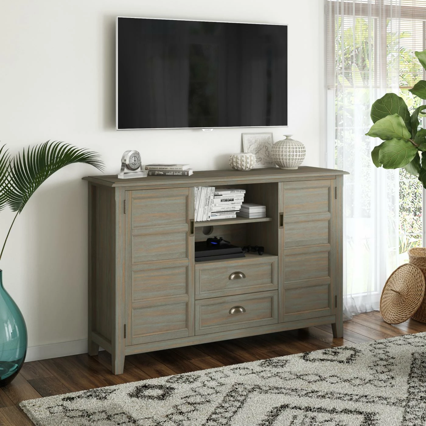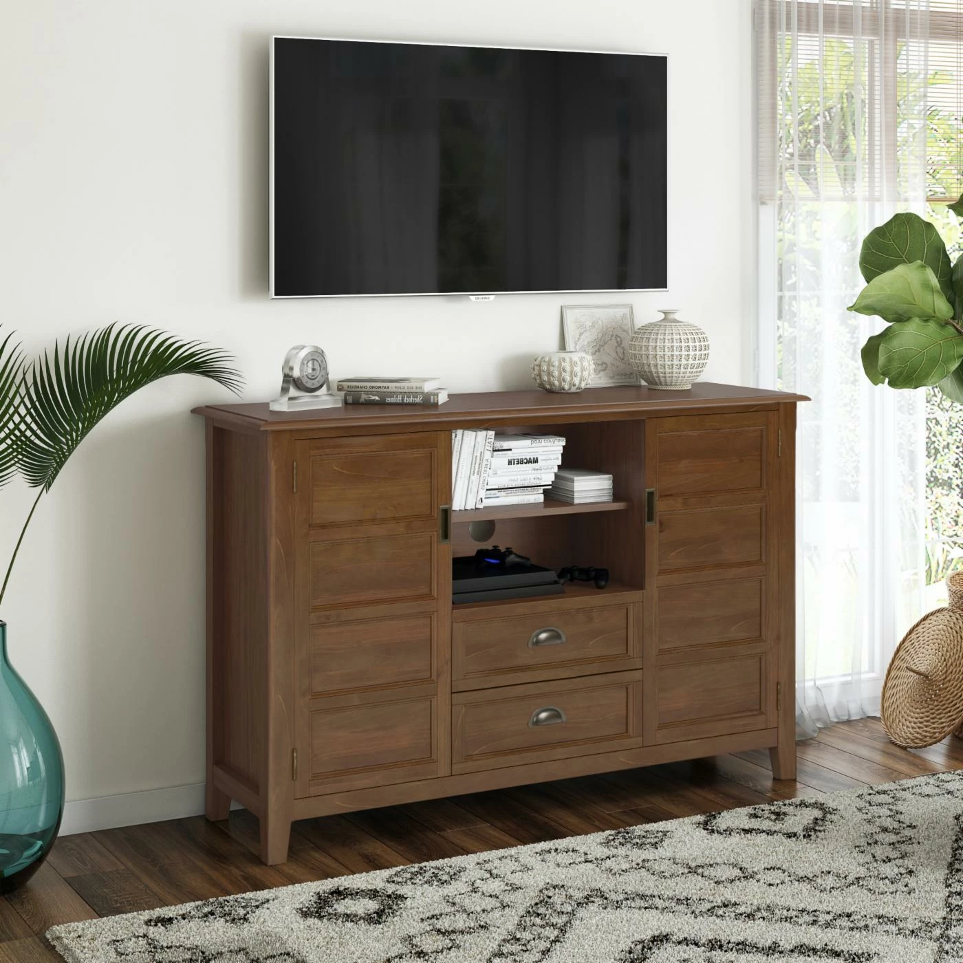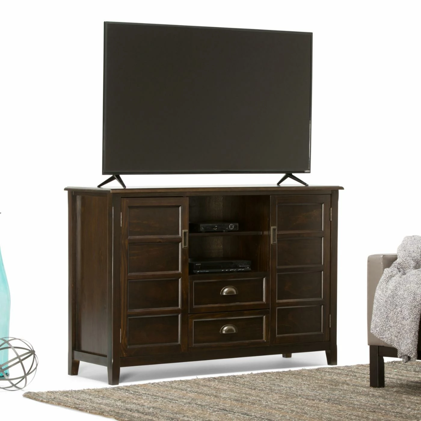 The Brooklyn + Max Berkshire 54 in. TV Stand mixes style inspiration from the Craftsman era with a deep understanding of the requirements of your modern lifestyle. This wide, tall TV stand suits most flat panel TVs up to 60 inches. Twin drawers on metal glides can hold chargers, remotes, and other small necessities. An open shelving area at center is perfect for gaming consoles and media streaming devices. This area includes an adjustable shelf. Cabinet doors on each side provide roomy concealed storage spaces with two shelves behind each door. This unit features cord management cut-outs, too.