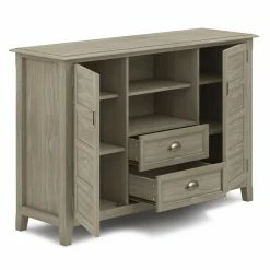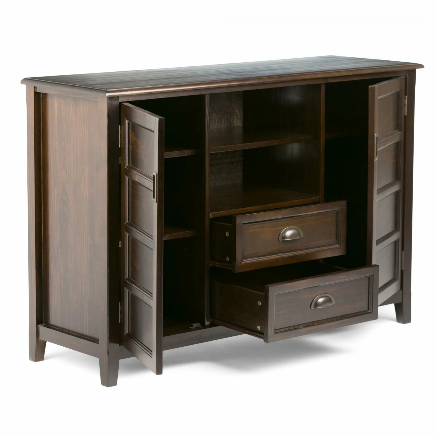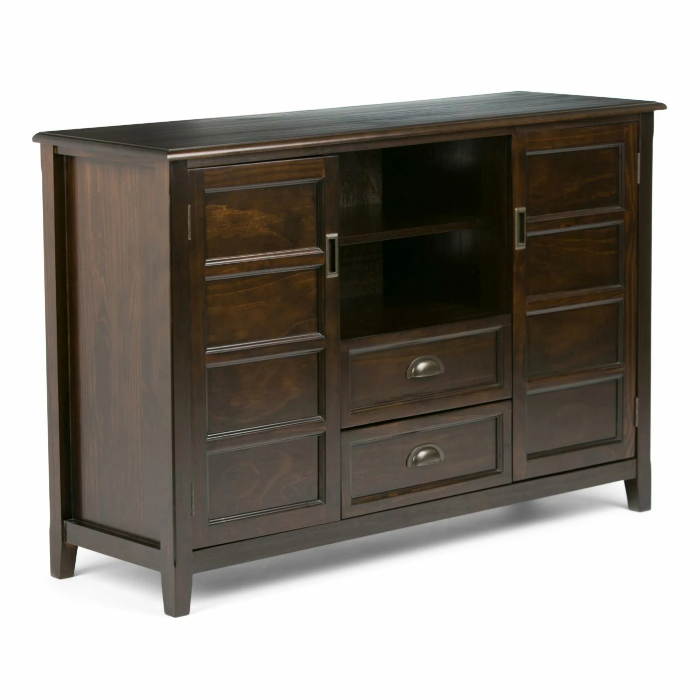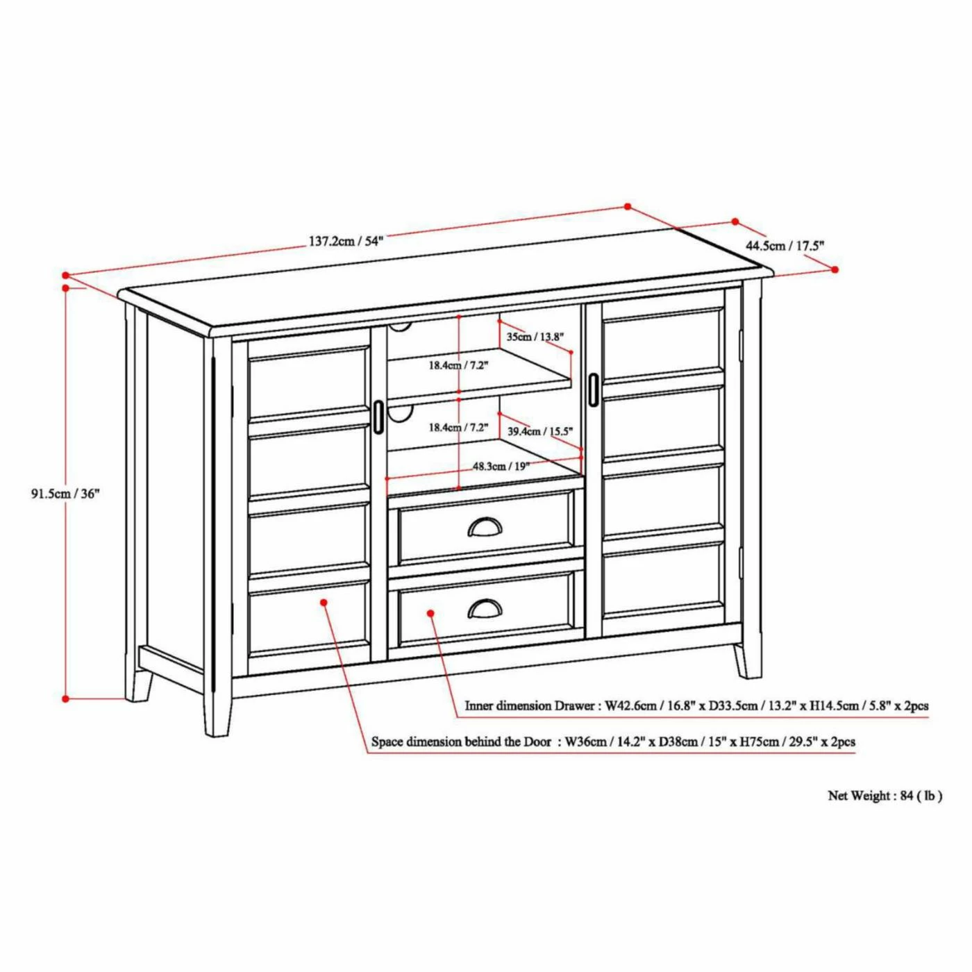 The Brooklyn + Max Berkshire 54 in. TV Stand mixes style inspiration from the Craftsman era with a deep understanding of the requirements of your modern lifestyle. This wide, tall TV stand suits most flat panel TVs up to 60 inches. Twin drawers on metal glides can hold chargers, remotes, and other small necessities. An open shelving area at center is perfect for gaming consoles and media streaming devices. This area includes an adjustable shelf. Cabinet doors on each side provide roomy concealed storage spaces with two shelves behind each door. This unit features cord management cut-outs, too.