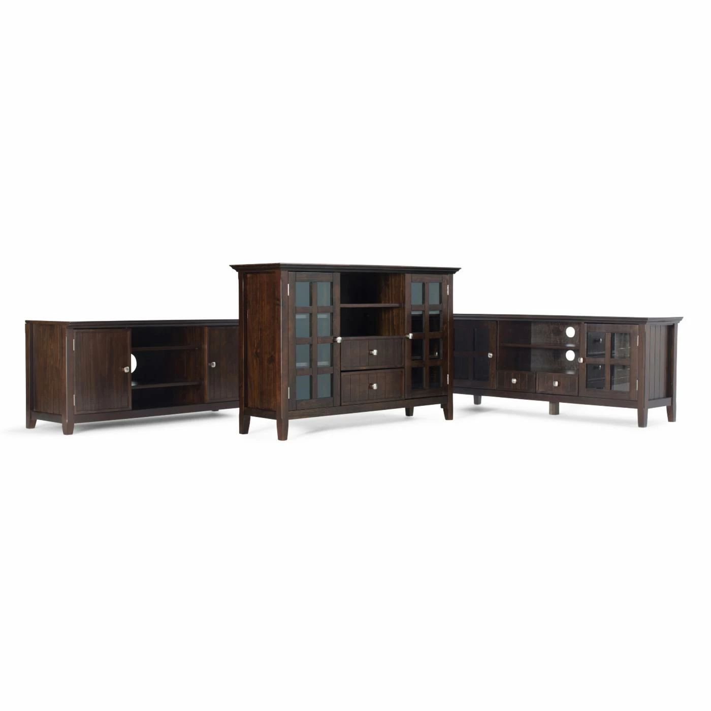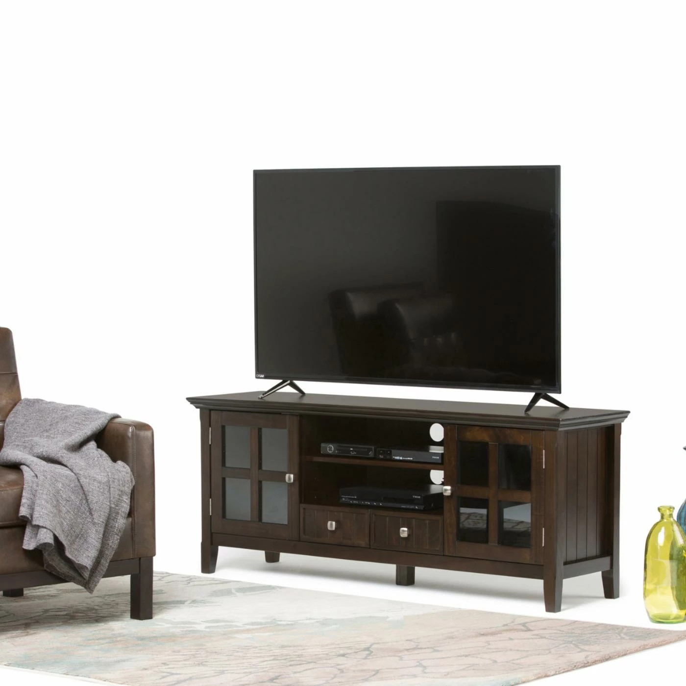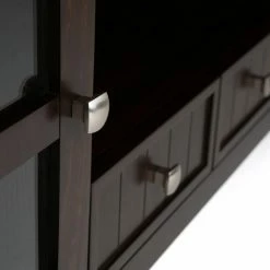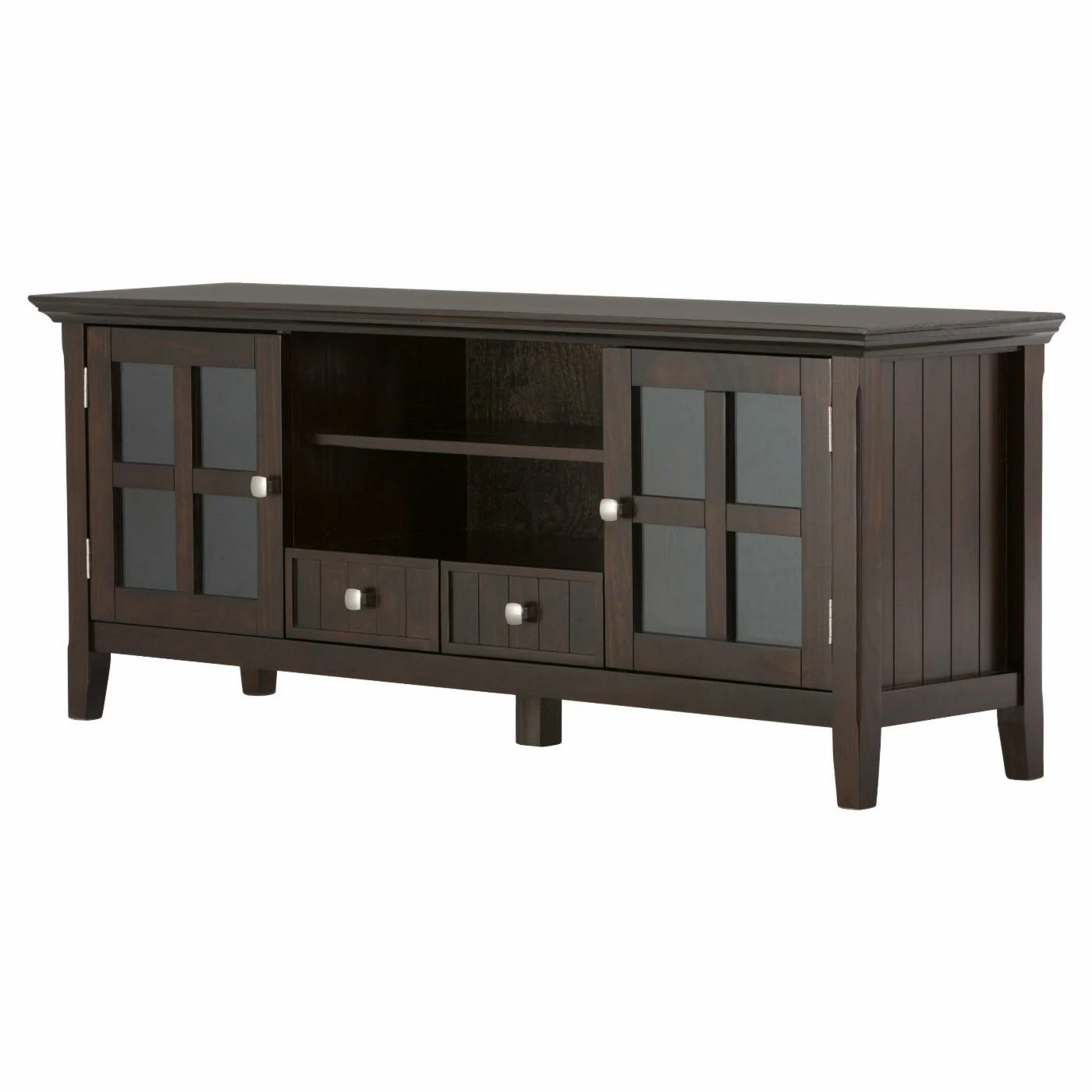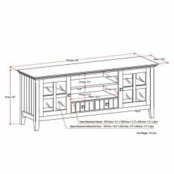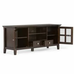 Give your favorite TV the home it deserves with the Brooklyn + Max Brunswick Pine Wood 2 Door TV Media Stand with Drawers – Tobacco Brown. Made from solid pine wood and veneer, this piece features plentiful storage space for media components. It displays most TVs up to 66 inches and features two bottom drawers, an open space, two side cabinets with tempered glass doors, and one adjustable shelf each.