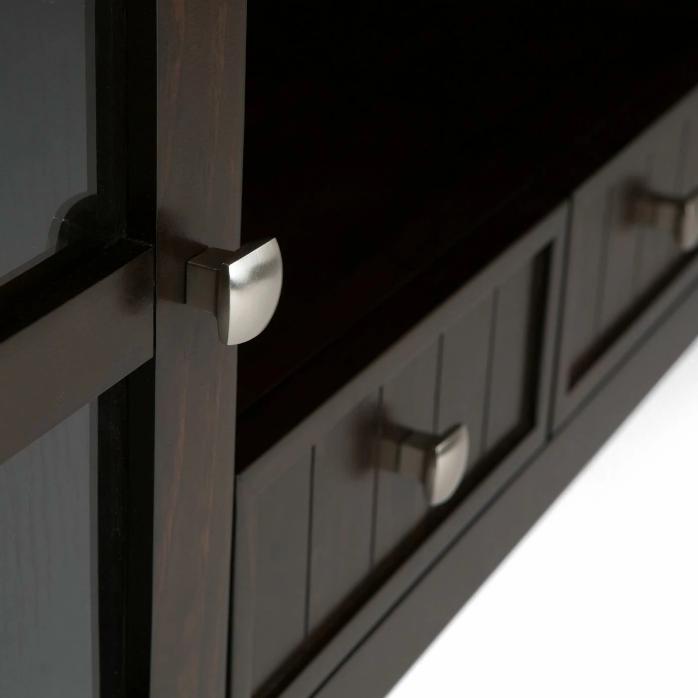 - 2 side cabinets with tempered glass doors and 1 adjustable shelf