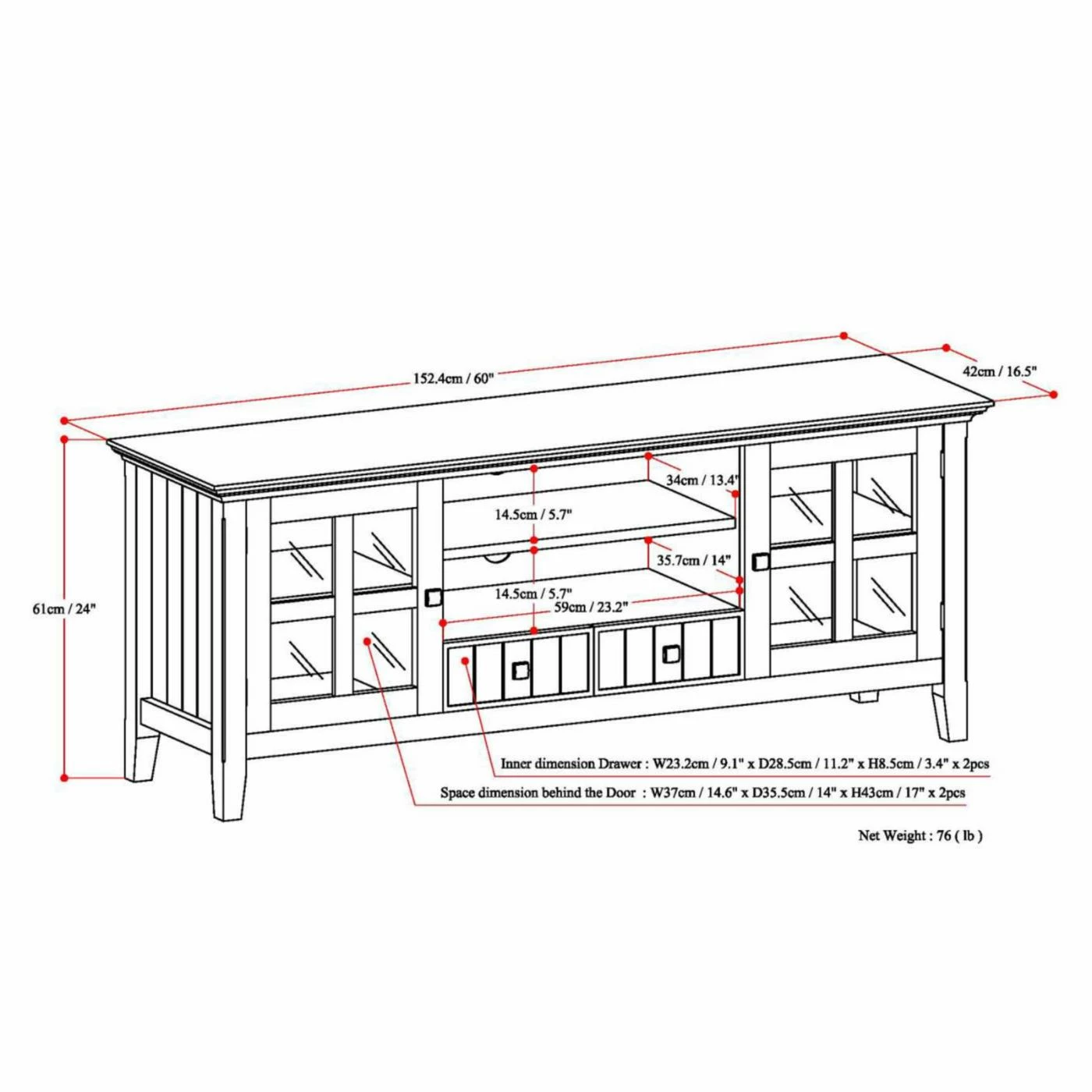 - Shelf: 23.2W x 14D x 5.7H in.