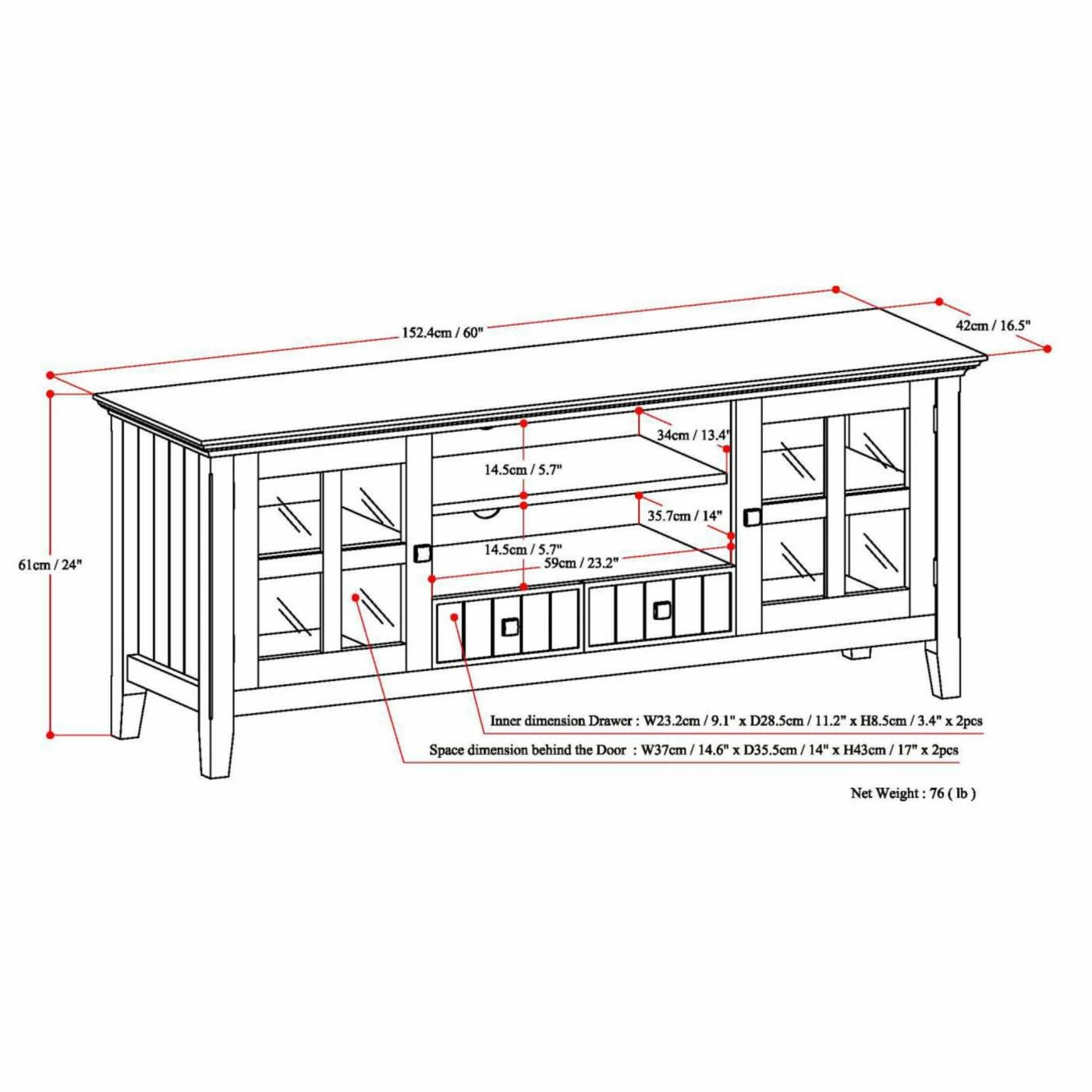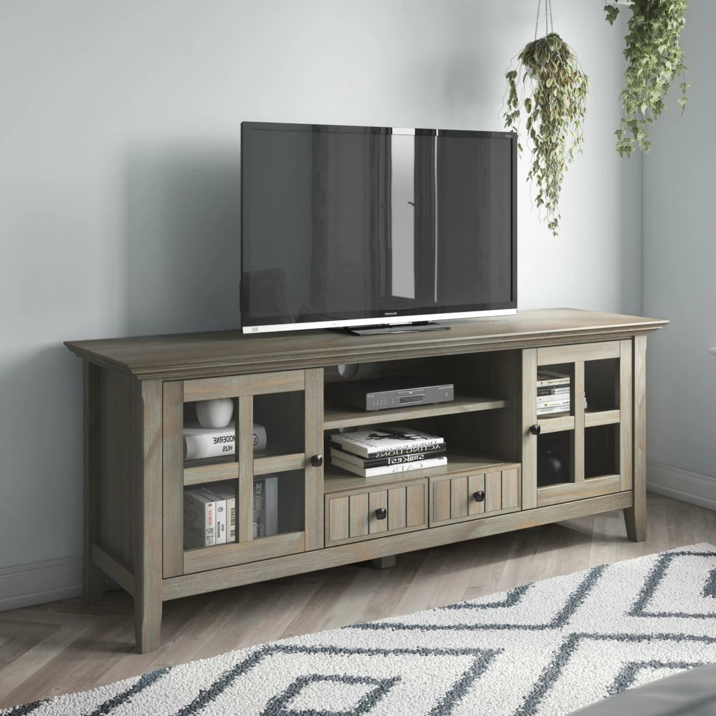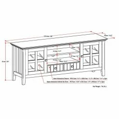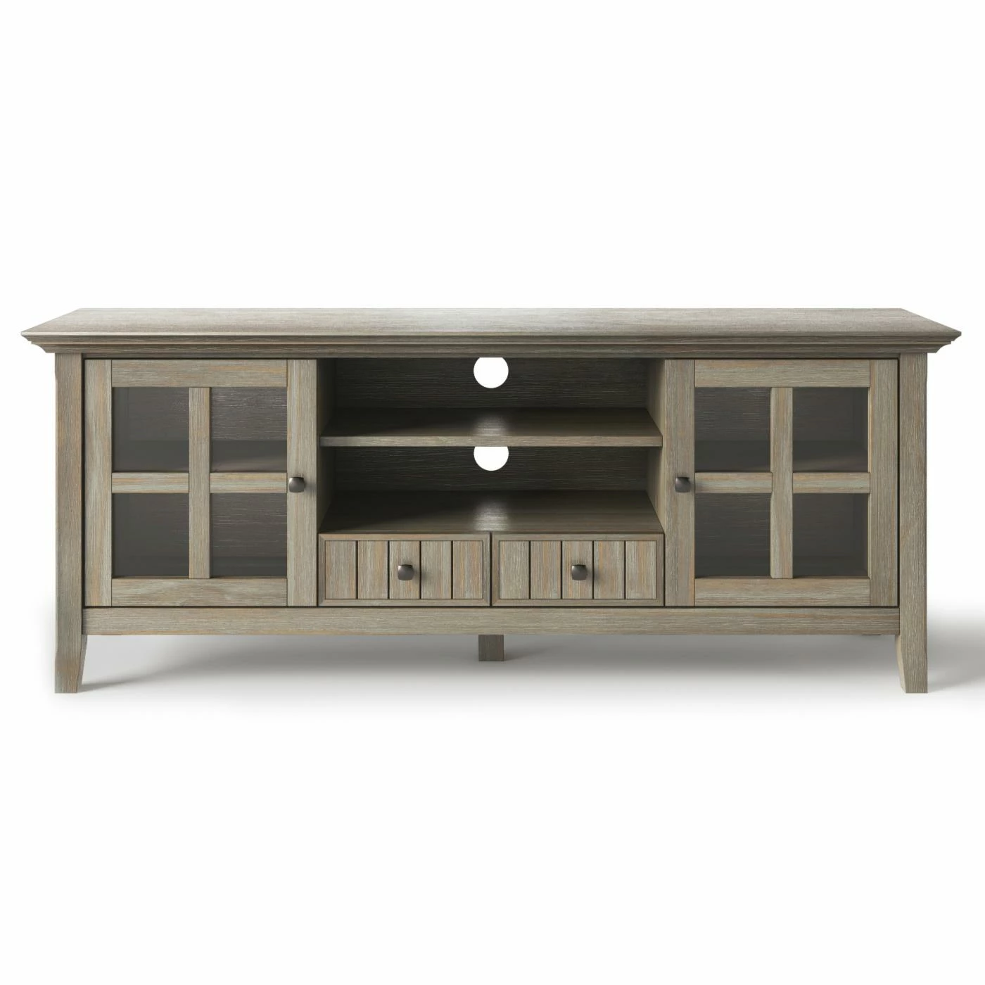 The Brooklyn + Max Brunswick Solid Wood 60 in. Rustic TV Media Stand is a great choice for a television stand update. This wooden stand is constructed of engineered wood and pine. Offering ample storage for all your DVDs, Blu-rays, streaming devices, and gaming consoles, the back features cut-outs for cord management. This stand can support TV sizes up to 65 inches. Choose from available finish options.