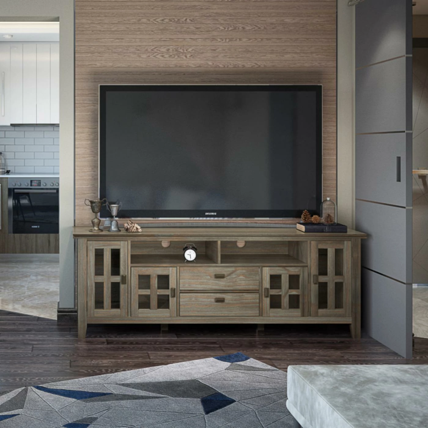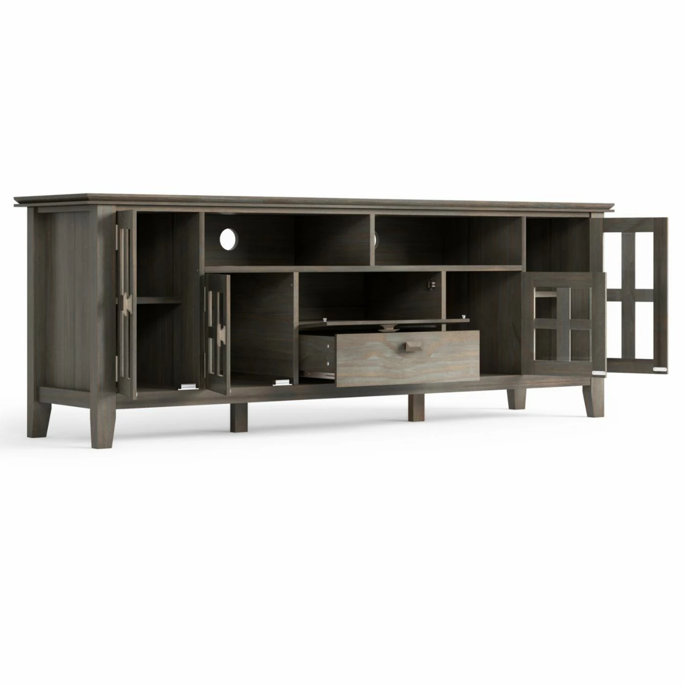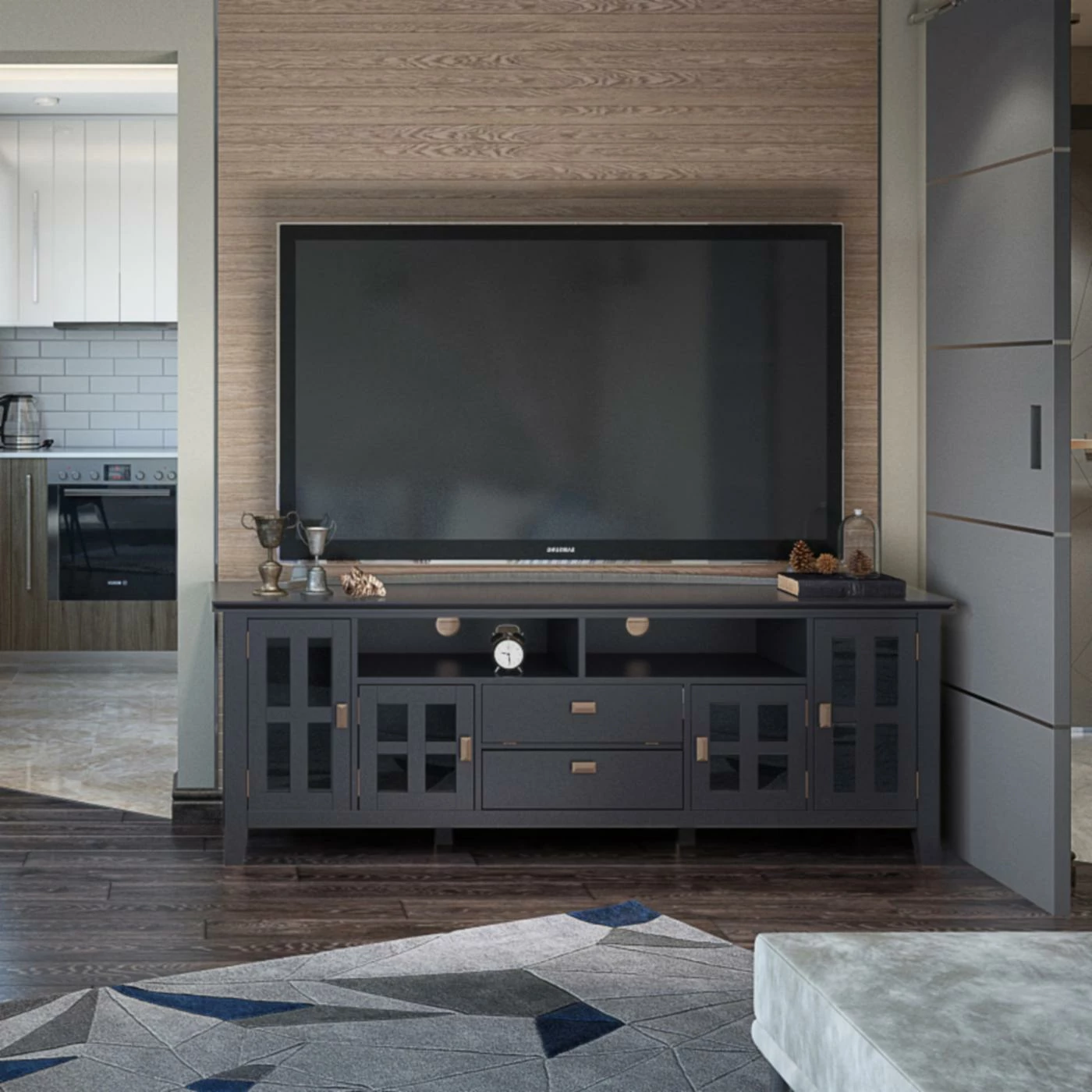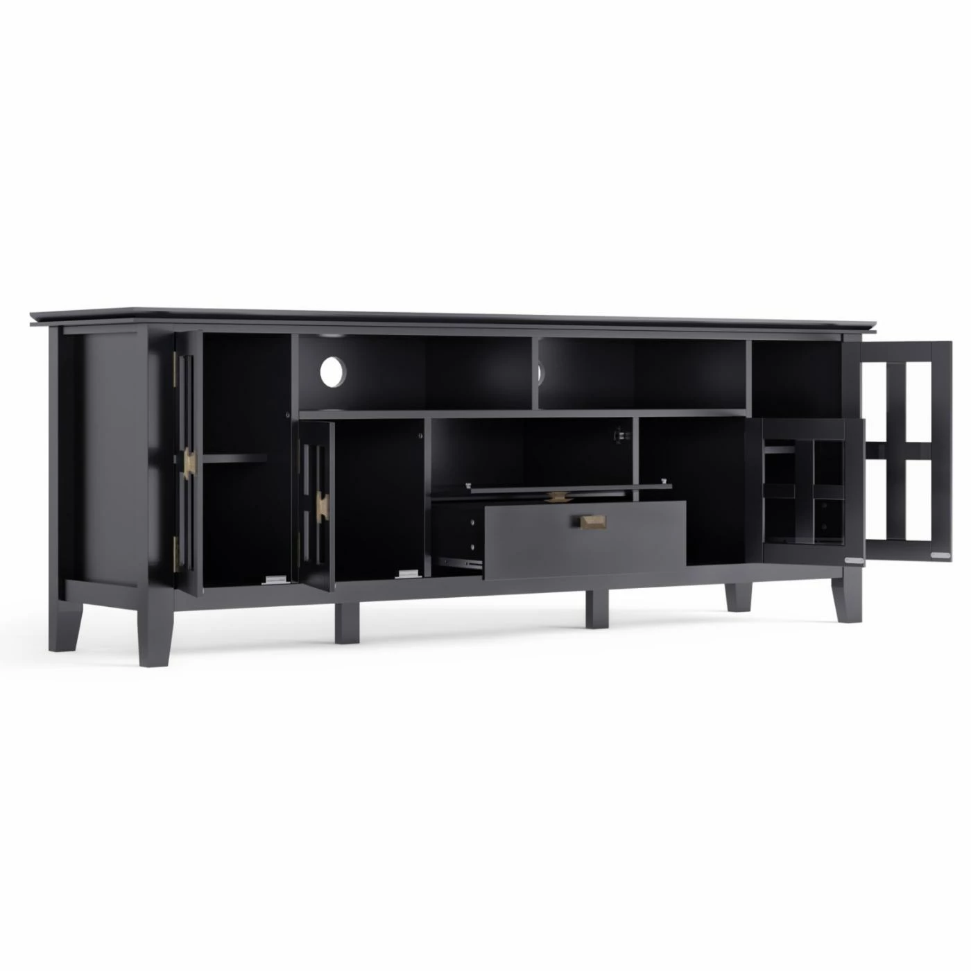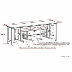 The stylish, refined Brooklyn + Max Holden Pine Wood Glass Door TV Media Stand keeps a mammoth TV from taking over the room. Designed to accommodate TVs up to 80 inches, this beautiful entertainment center offers the storage space you need for media collections and gaming accessories. A wide open shelf at top accommodates devices, while two drawers can manage small accessories such as chargers and remotes. Two storage cabinets at the sides each open onto one adjustable shelf. Handcrafted using solid pine, this unit has rear cord management cut-outs to keep all cables under control. The finish includes a stain, a glaze, and a protective lacquer. You’ll love the distinction the mullion framed glass doors and pyramidal antique bronze knobs bring to this stand’s appearance. Glass doors are made with strong, durable tempered glass.