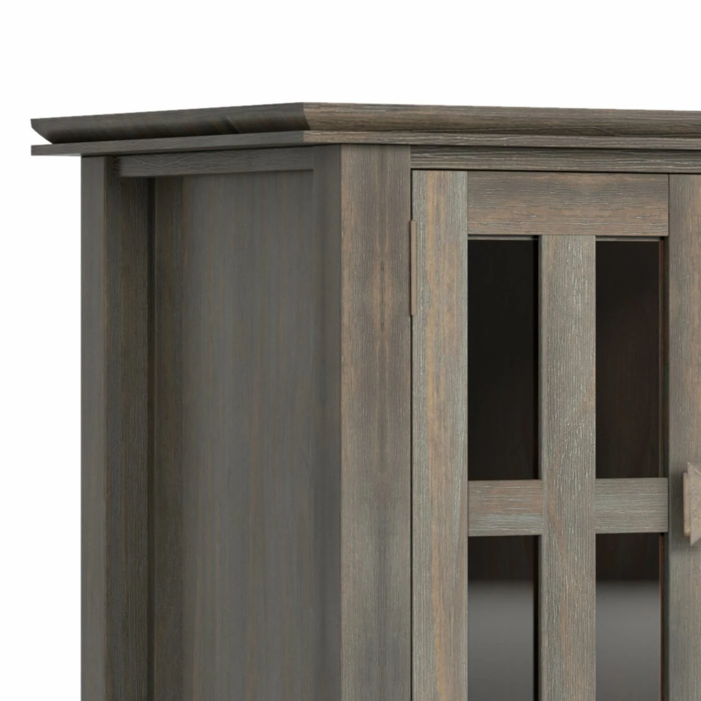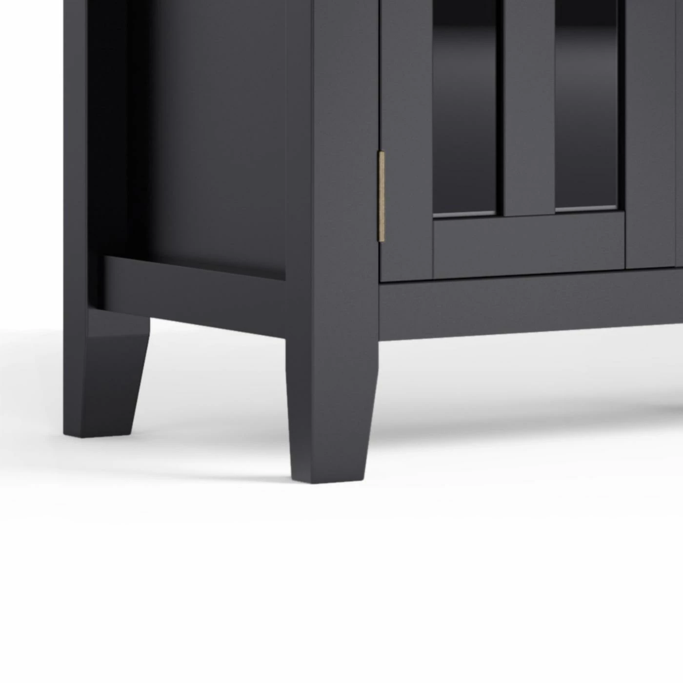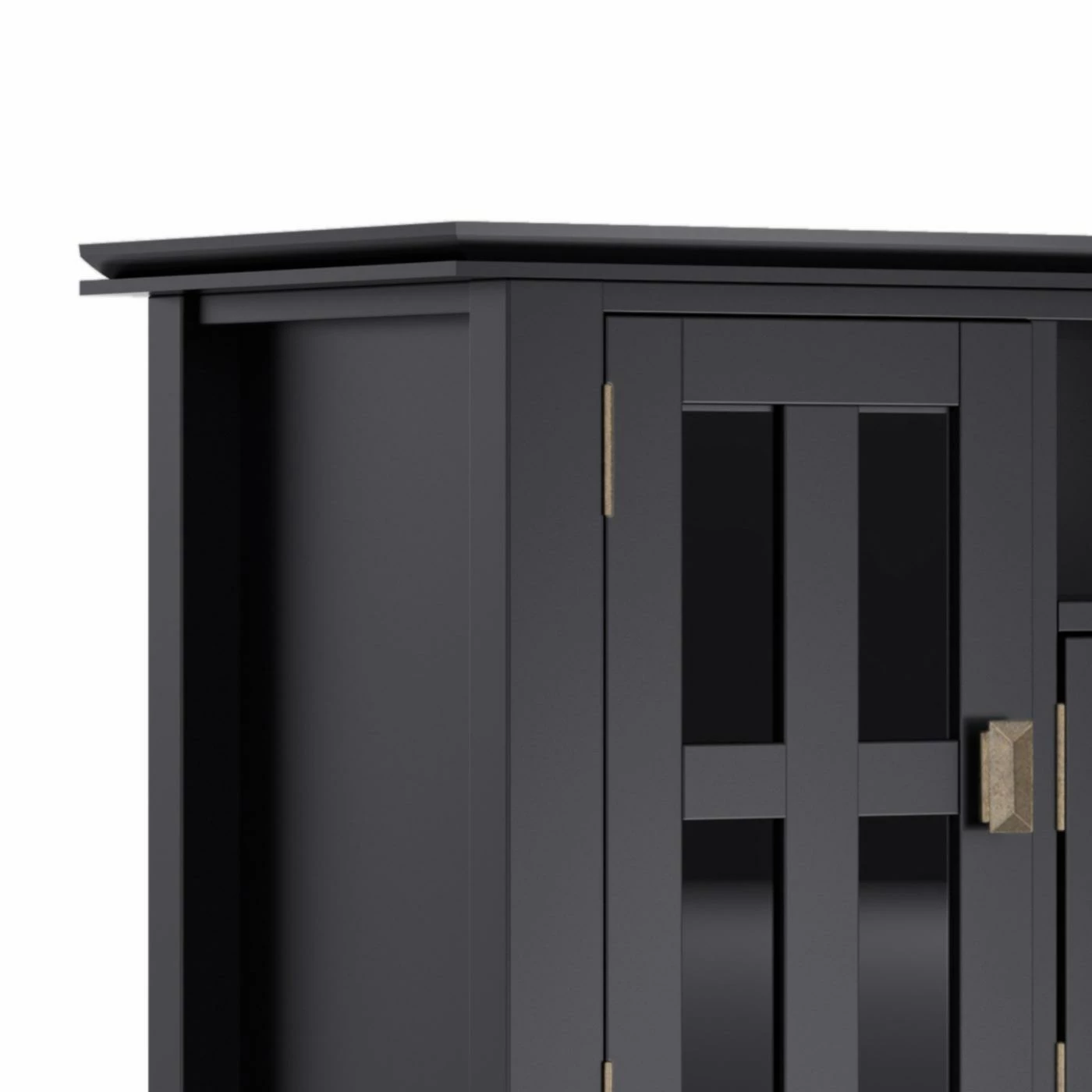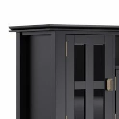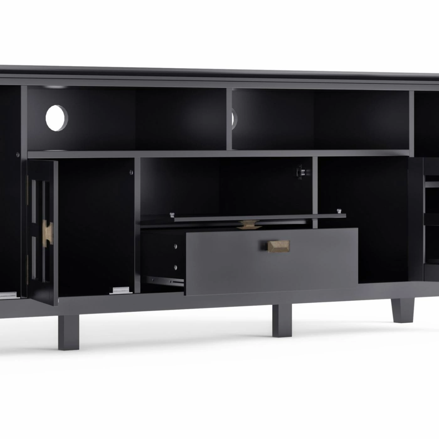 The stylish, refined Brooklyn + Max Holden Pine Wood Glass Door TV Media Stand keeps a mammoth TV from taking over the room. Designed to accommodate TVs up to 80 inches, this beautiful entertainment center offers the storage space you need for media collections and gaming accessories. A wide open shelf at top accommodates devices, while two drawers can manage small accessories such as chargers and remotes. Two storage cabinets at the sides each open onto one adjustable shelf. Handcrafted using solid pine, this unit has rear cord management cut-outs to keep all cables under control. The finish includes a stain, a glaze, and a protective lacquer. You’ll love the distinction the mullion framed glass doors and pyramidal antique bronze knobs bring to this stand’s appearance. Glass doors are made with strong, durable tempered glass.