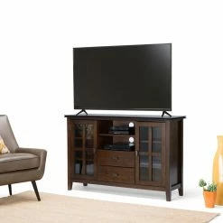 Make your lounge time even better with the Brooklyn & Max Holden Wood 53 in. Contemporary TV Media Stand to house your TV. This piece is made from plywood and pine and features a large open area with one adjustable shelf and two drawers. The two large storage cabinets open to two adjustable shelves.Β