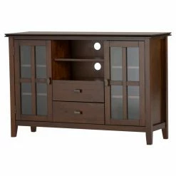 Make your lounge time even better with the Brooklyn & Max Holden Wood 53 in. Contemporary TV Media Stand to house your TV. This piece is made from plywood and pine and features a large open area with one adjustable shelf and two drawers. The two large storage cabinets open to two adjustable shelves.Β