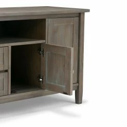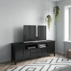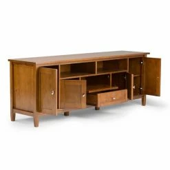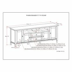 With the Brooklyn + Max Lexington Pine Wood 4 Door Rustic TV Media Stand, you can have it all – traditional Shaker-style craftsmanship and accommodations for up to an 80-inch TV! Finished in your choice of avilable color and protected with a coat of clear lacquer, this craftsman inspired media center has a place for everything. Two open shelves can hold consoles and devices, and the large cabinet doors on the sides hold one adjustable shelf apiece. The top drawer has a drop-down front for easy access. With the cord management cut-outs, you’ll have your devices set up in no time. Designed in Canada and handcrafted in Vietnam.