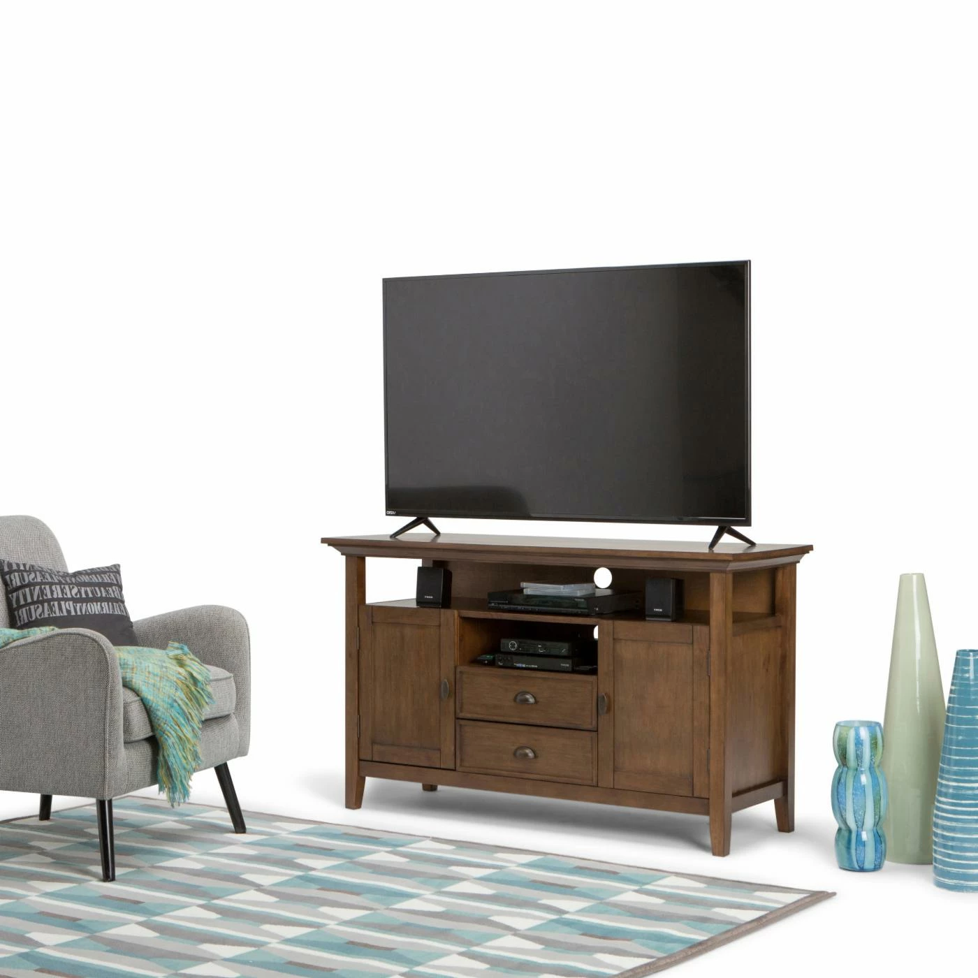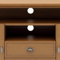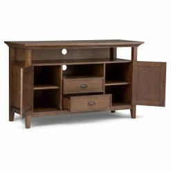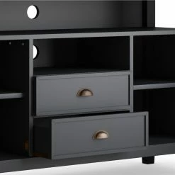 The Brooklyn + Max Stanwick Solid Pine Wood 2 Door Rustic TV Media StandΒ is the perfect way to enhance your viewing pleasure and entertainment space. Sized for TVs up to 60 inches, this beauty is hand-crafted with care from the finest pine wood solids, then finished with a choice of finish for the ultimate in durability and attractive looks. Its open shelves are great for accommodating your media devices, while cutouts in the back provide easy cord management. An additional 2 cabinets and 2 drawers offer ample storage and organization space for your DVDs, Blu-Rays, video games, books, and other essentials. With molded crown edges, tapered legs, and a charming appearance, this is the centerpiece you’ve been waiting for.