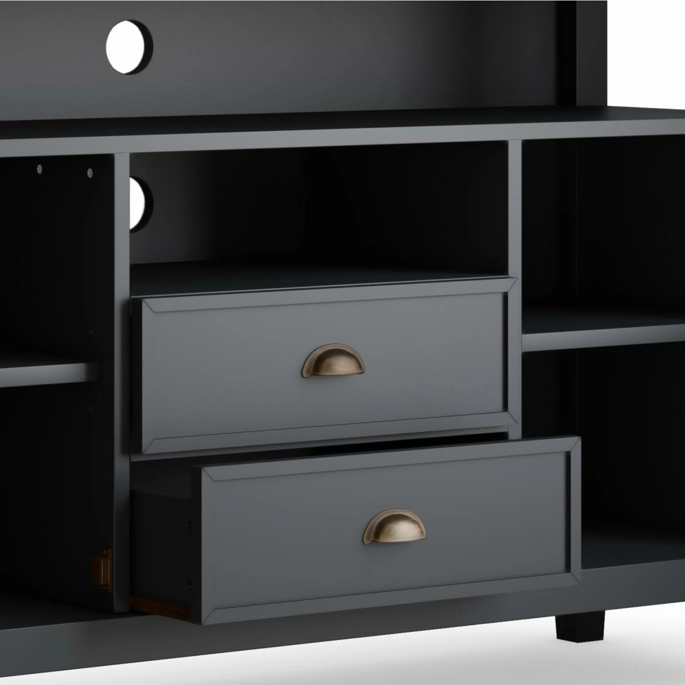 - Open shelves feature cord management system on back