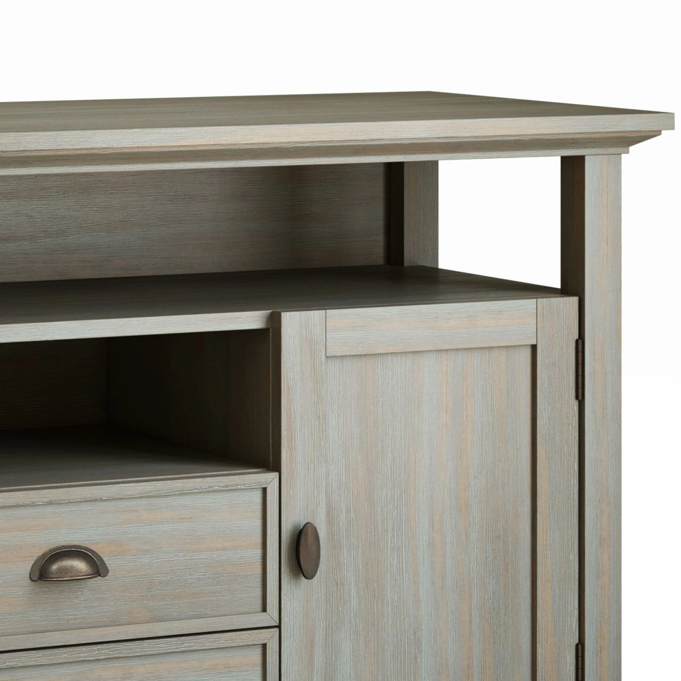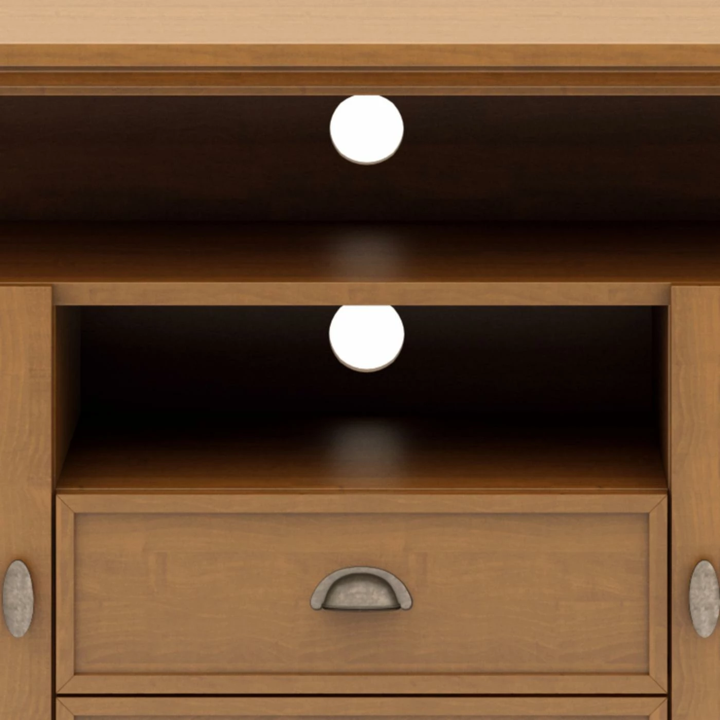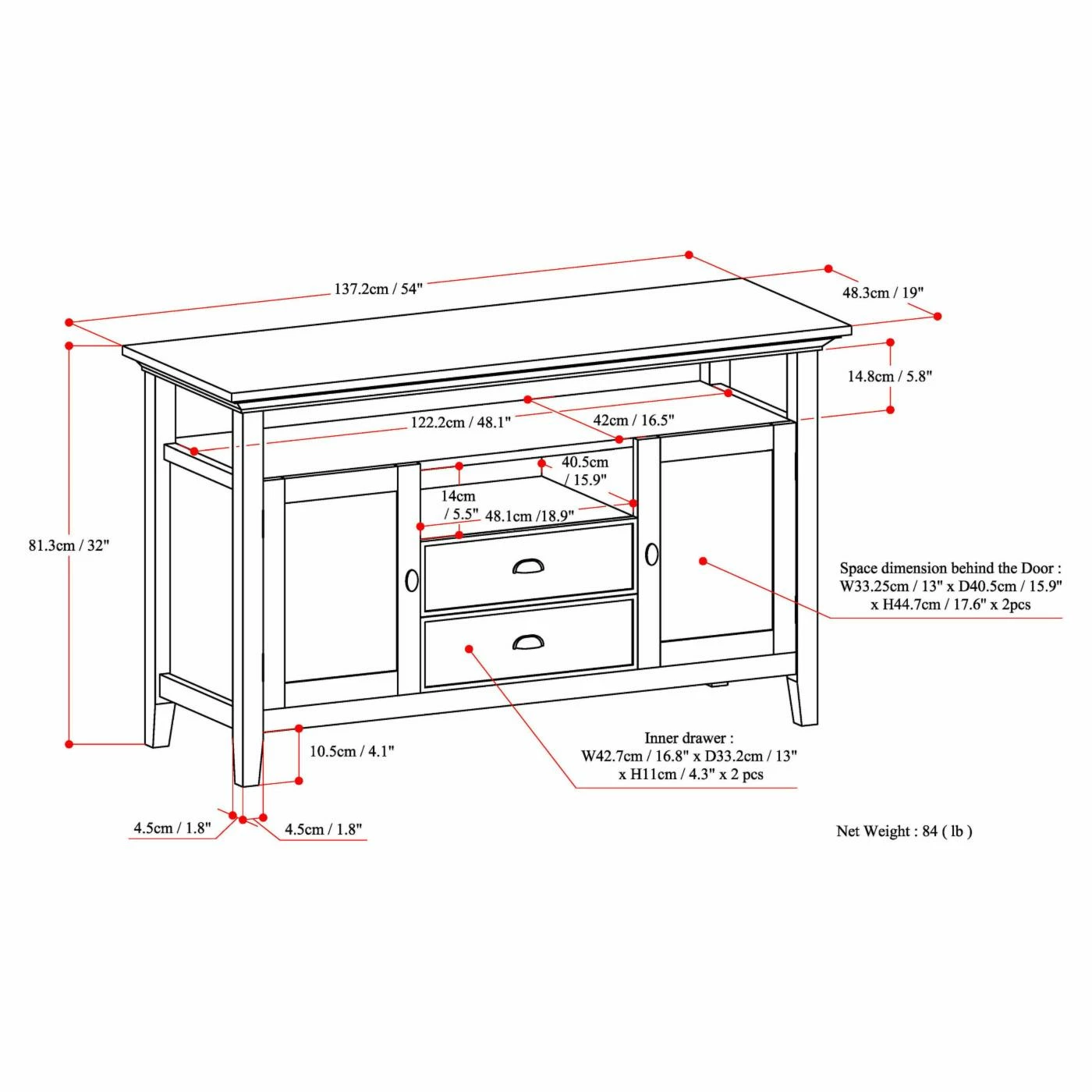 - 2 open shelves with 1 adjustable shelf behind large side doors