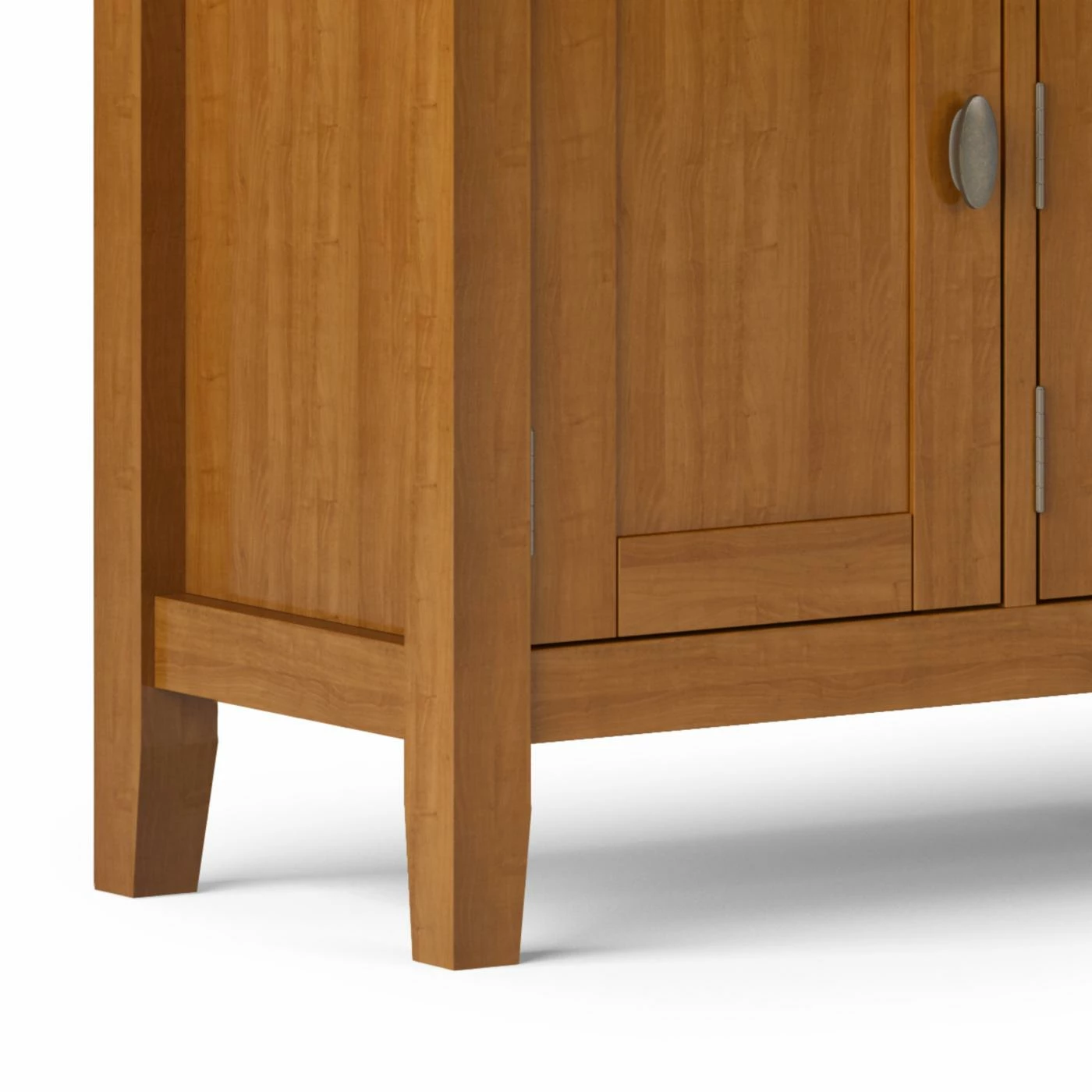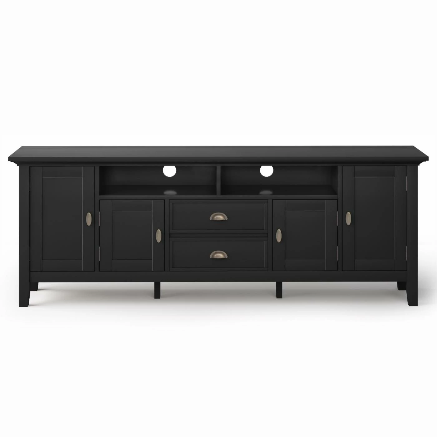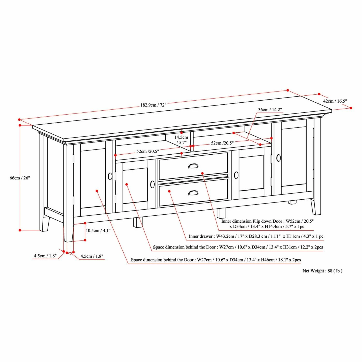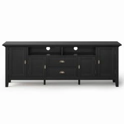 Specially engineered to enable the grandest experiences possible, the Brooklyn + Max Stanwick Solid Pine Wood 4 Door Rustic TV Media Stand is perfect for your brand new 80-inch flat screen. This handsome piece is hand-crafted with care from the finest pine woods, then given a rustic finish that is sure to complement a wide range of interior dΓ©cor styles. Two open shelves with cutouts in the back for easy cord management provide the ideal place for setting up media devices and components, while the four cabinets and two drawers allow for further storage and organization of your media essentials, like DVDs, games, books, extra cords, and more. Plus, with molded crown edging, tapered legs, and easy assembly, you’ll have a beautiful centerpiece to energize your entertainment space in no time at all.