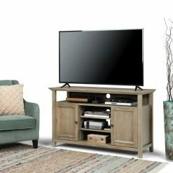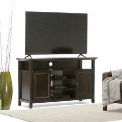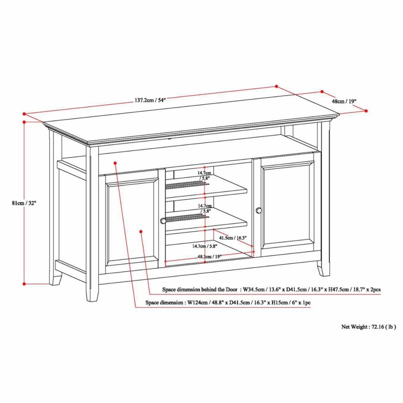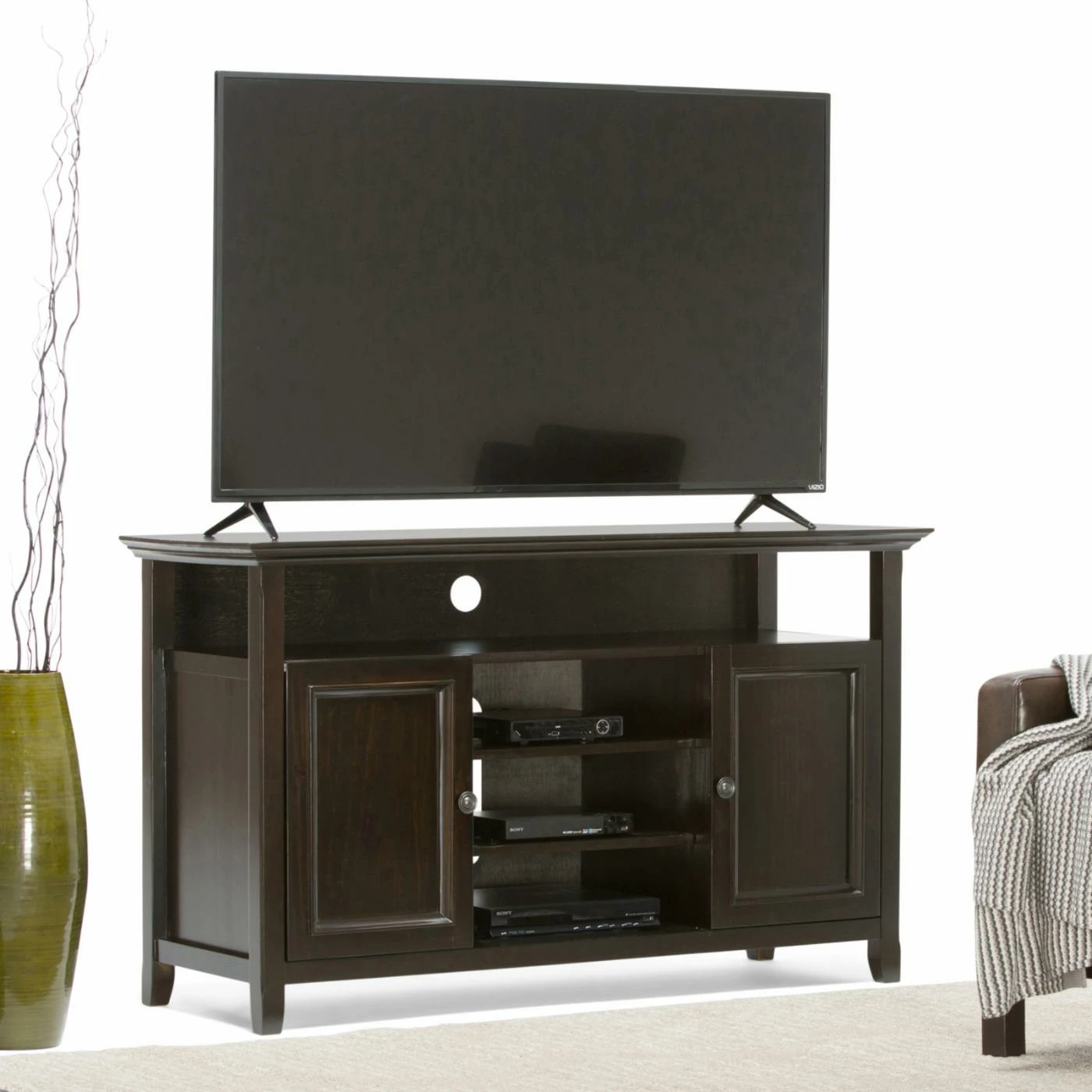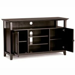 Offering comfortable viewing and a warm, refined design, the Brooklyn + Max Washington 54 in. TV Stand is sure to revitalize your living room. This media console provides a sturdy, steady base for flat panel TVs up to 60 inches. It also has well-organized storage space for all your media extras. Cabinet doors at the sides each open onto an adjustable shelf, and there’s more adjustable shelving at the center beneath the wide device bay. Cord management cut-outs are built in for your convenience. Style features include subtly tapered legs, crown molding around the table top, panel framed drawer fronts, and round, decorative knobs in an antique pewter finish. Select from the available finish options to best suit your needs.