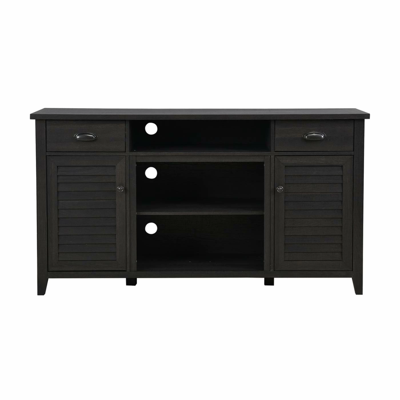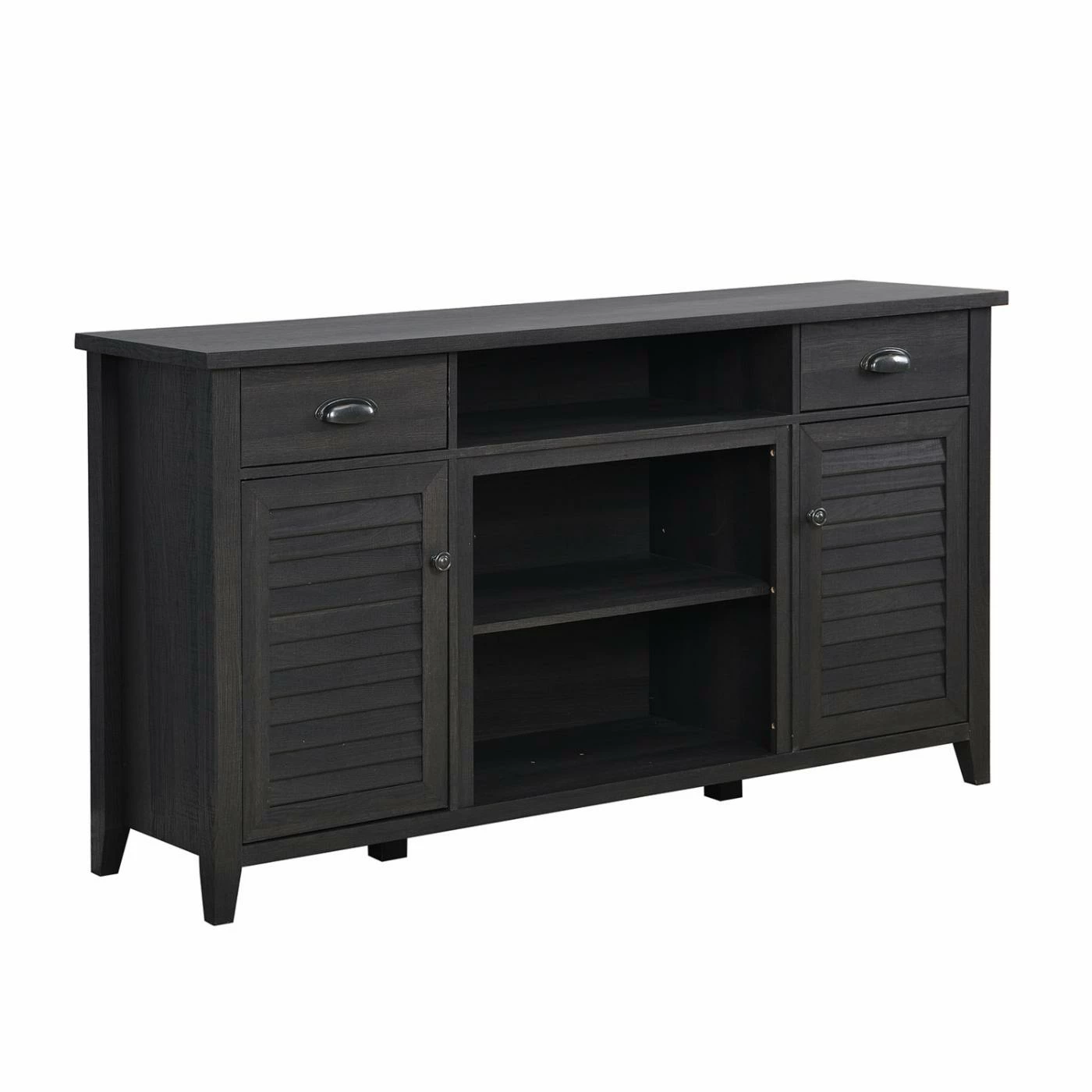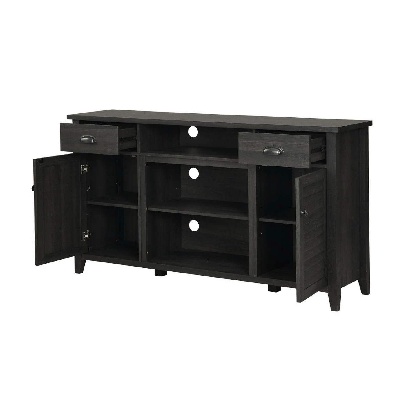 The 33 in. wide Chelsea Peak Black TV Stand is a must-have entertainment system for your home. At first glance, you can see this unit has a spacious top surface, two drawers, two cabinets, and open shelving in the center. Having a mix of open and closed features allows you to pick and choose what you want on display and what you would rather tuck away. The top surface is ideal for your choice of TV along with any additional decor to coordinate with your home. The drawers on either side would be perfect for remotes, smaller devices, and other miscellaneous items that need a home. Use the cabinets and open shelves for larger electronic consoles, games, magazines, books, and more. Both the drawers and cabinets have a mix of pulls and knobs to easily access the contents inside.