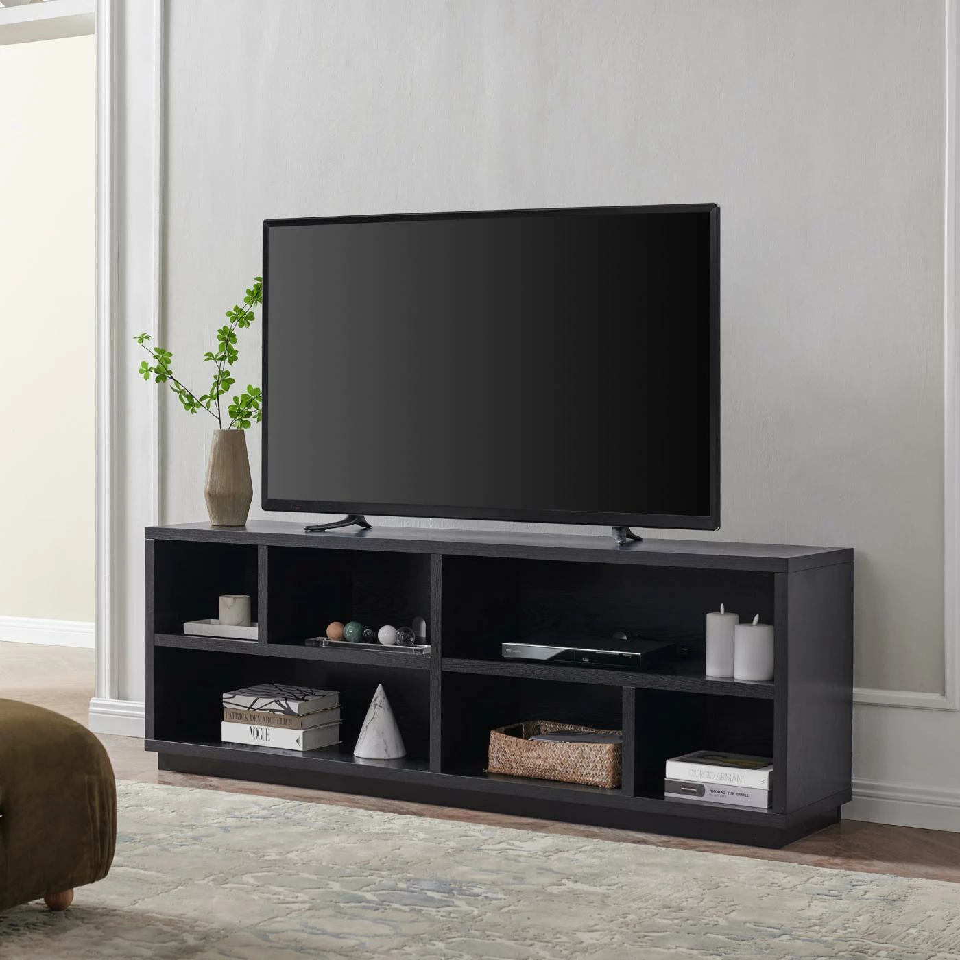- A transitional design accommodates TVs up to 75 in. for your entertaining space
