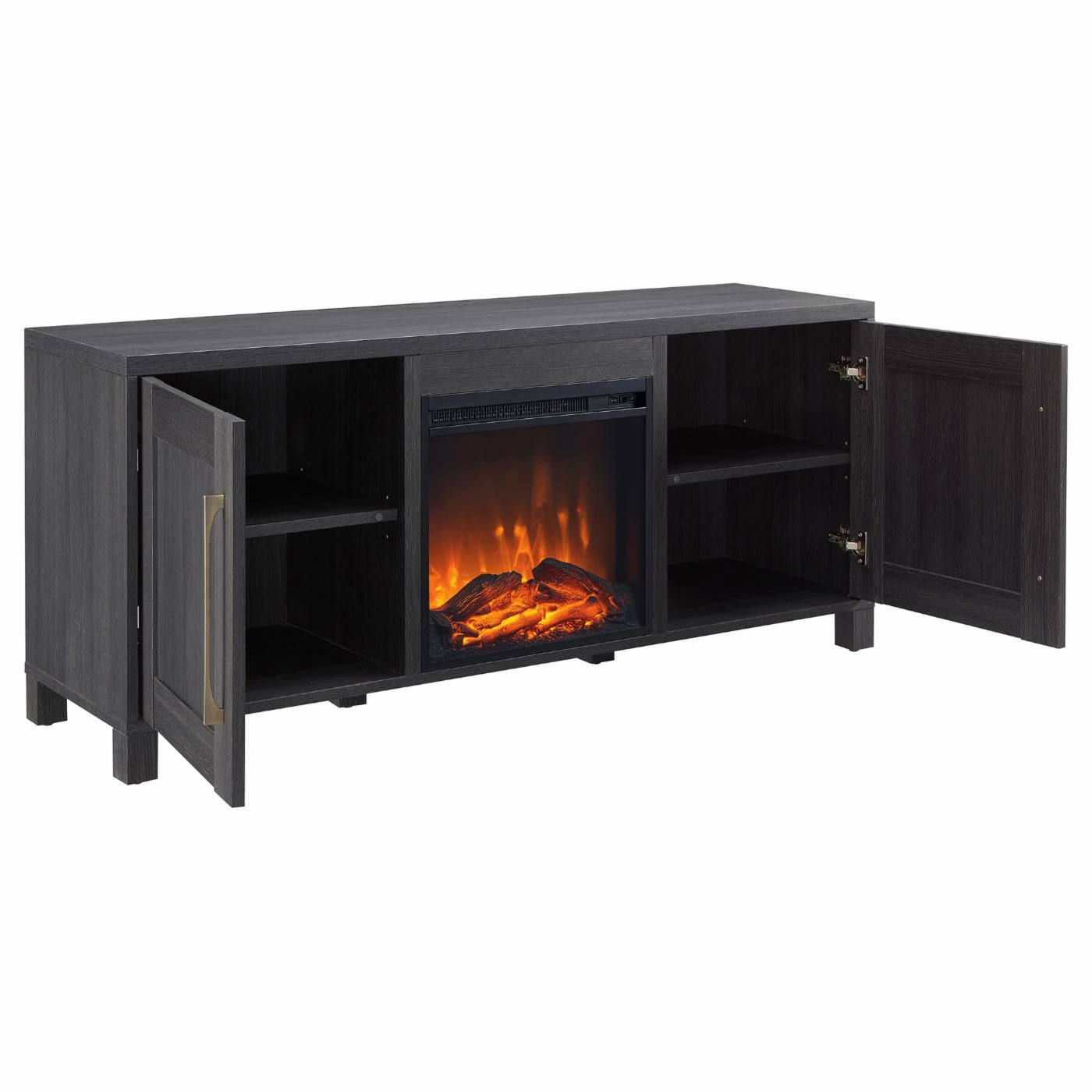 Combine functionality and classic transitional design with this modern TV stand, featuring an inset electric fireplace. Its rich wood tone creates a warm neutral palette that will blend seamlessly into any color scheme, while its classic styling pairs perfectly with the existing design inspiration of your living room, den, or game room. This solid-backed stand features two large enclosed cabinets with sleek brass-finished hardware. Cable management cut-outs and adjustable inner shelves help keep your media storage and consoles organized.