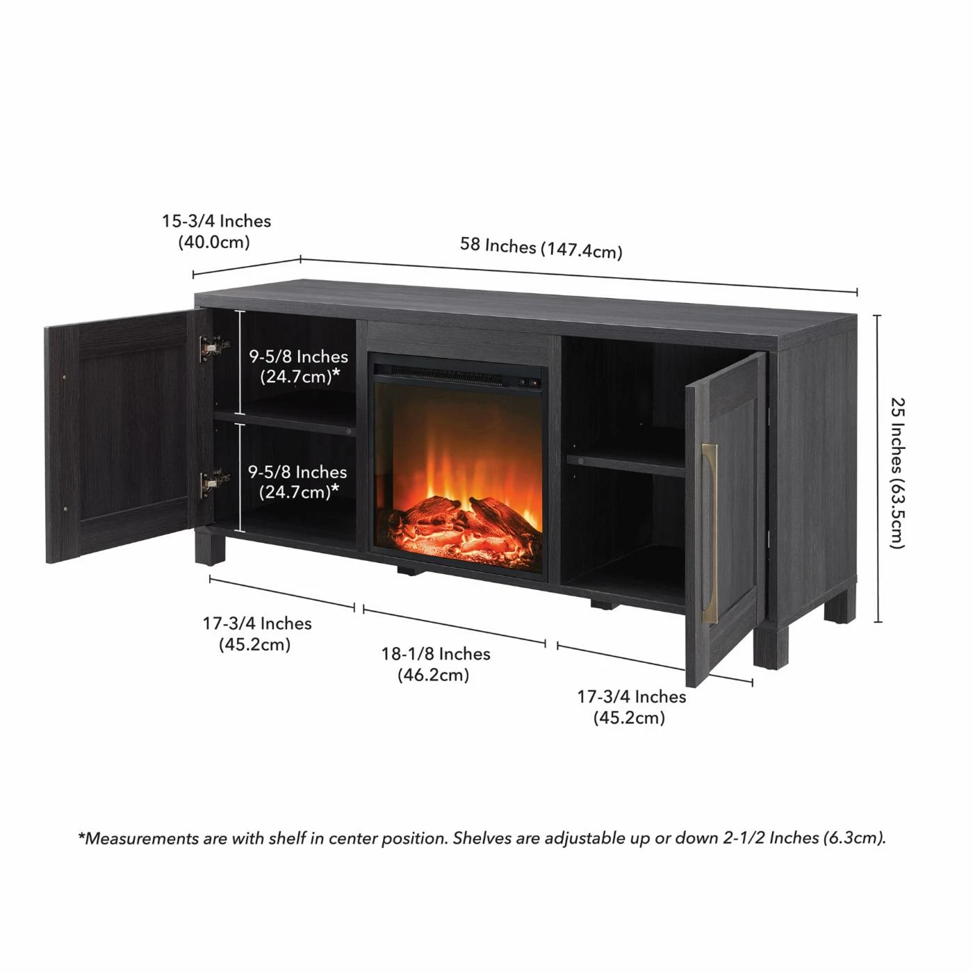 - Features an electric fireplace with LED faux-flames, with 4 shelves and 2 enclosed doors for ample storage.