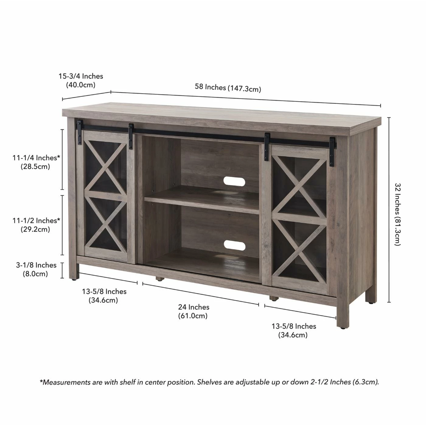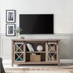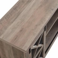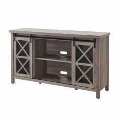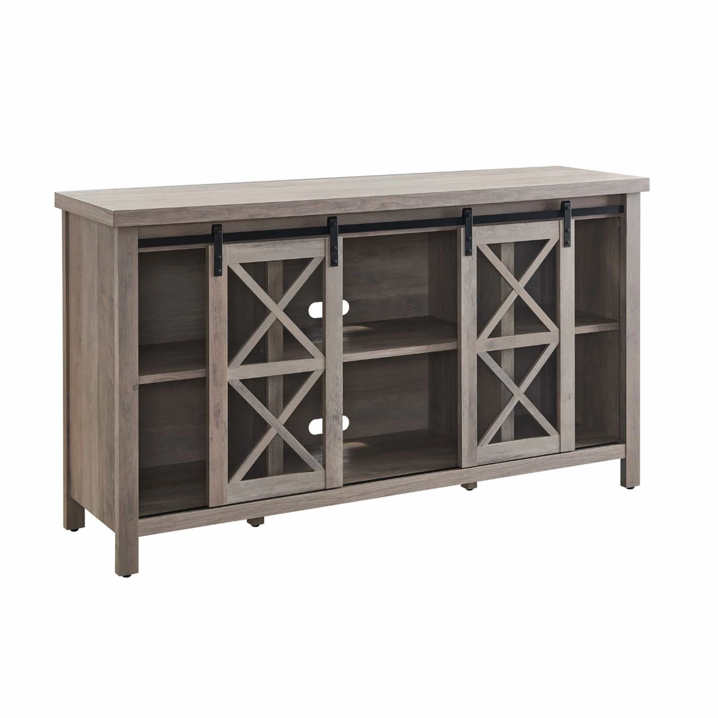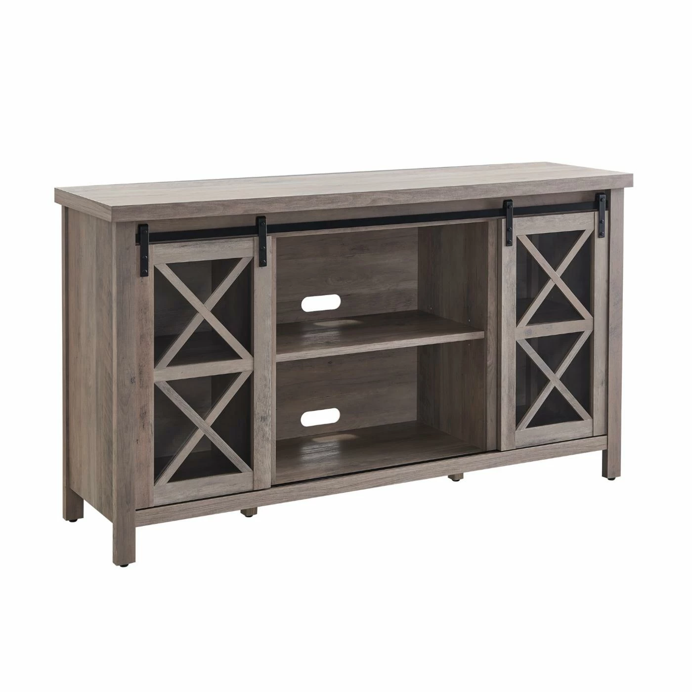 Combine functionality and on-trend design with this sturdy TV stand. Its rich wood tone creates a warm neutral palette that will blend seamlessly into any color scheme, while its functional sliding barn doors add a touch of modern farmhouse whimsy. A must-have for living areas and entertainment spaces, this TV stand sets the stage for the big game, a movie marathon, or that season finale everyone’s been talking about.