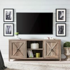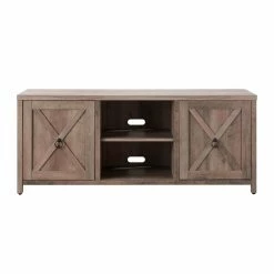 Combine functionality and classic modern farmhouse design with this sturdy TV stand. Its rich wood tone creates a warm neutral palette that will blend seamlessly into any color scheme, while its side cabinets allow for plenty of hidden storage. A must-have for living areas and entertainment spaces, this TV stand sets the stage for the big game, a movie marathon, or that season finale everyoneβs been talking about.