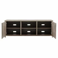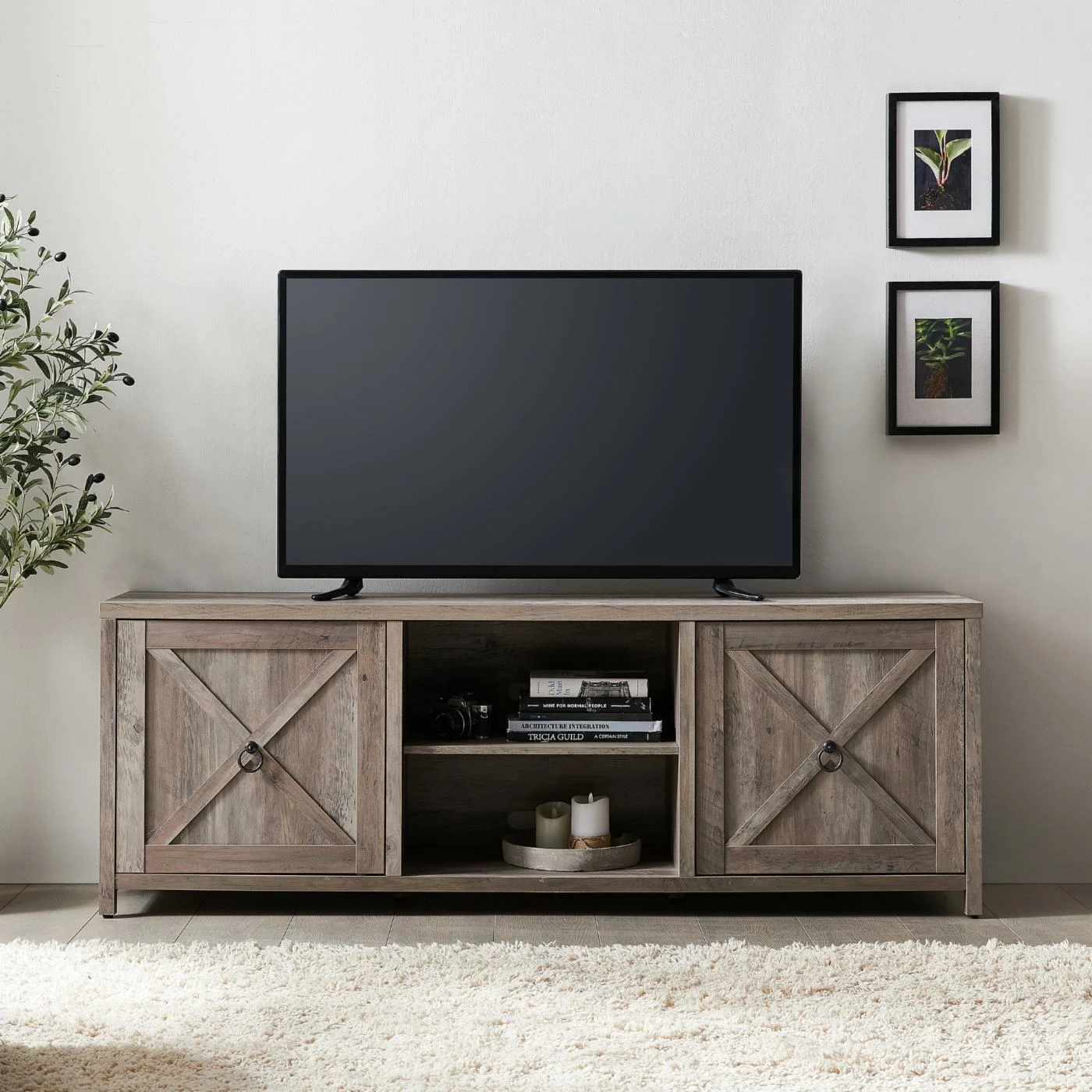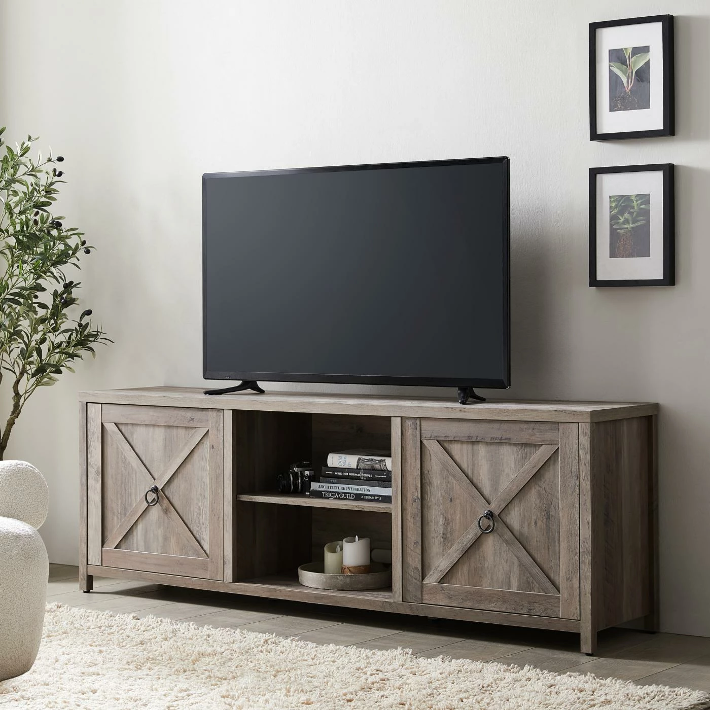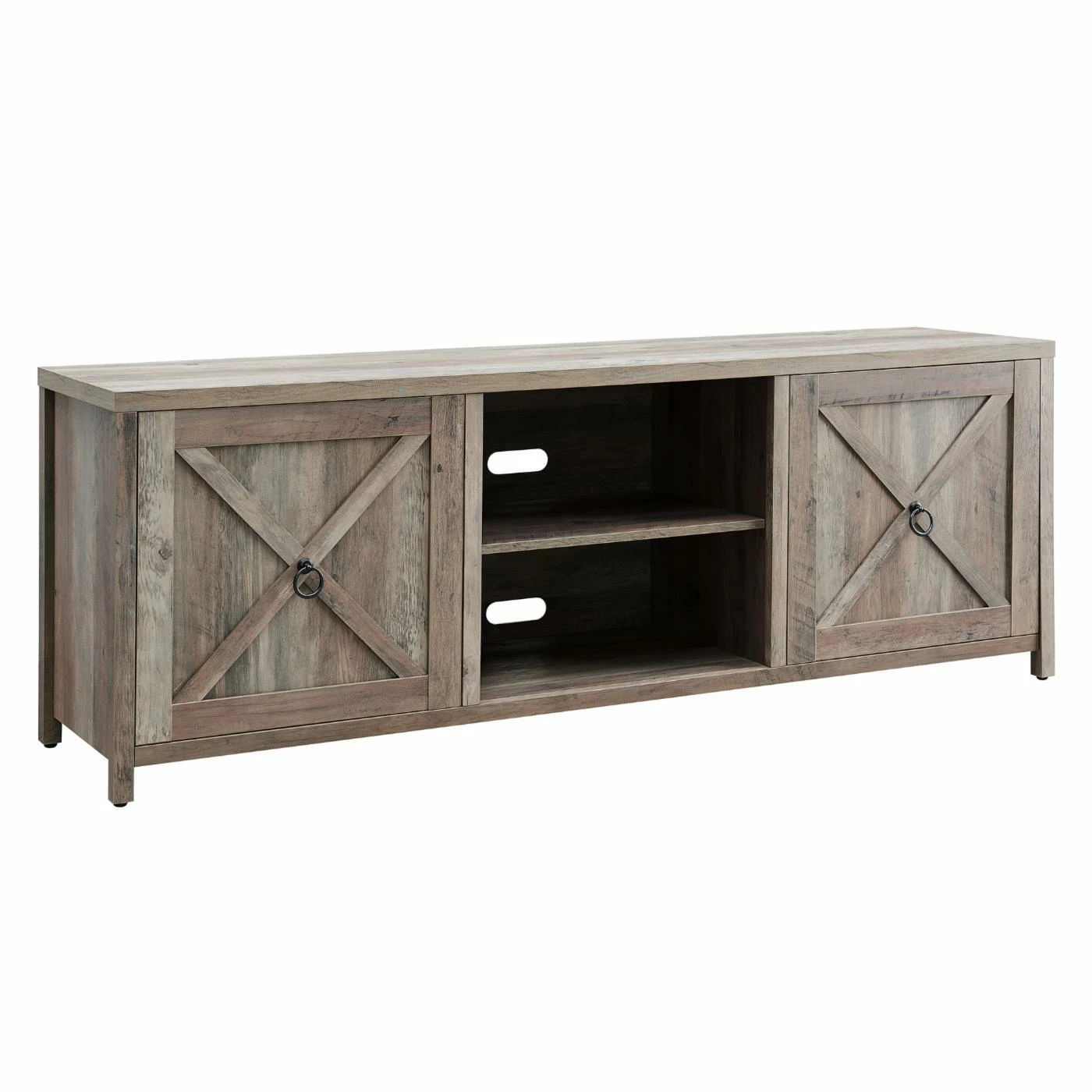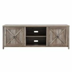 Combine functionality and classic modern farmhouse design with this sturdy TV stand. Its rich wood tone creates a warm neutral palette that will blend seamlessly into any color scheme, while its side cabinets allow for plenty of hidden storage. A must-have for living areas and entertainment spaces, this TV stand sets the stage for the big game, a movie marathon, or that season finale everyoneโs been talking about.