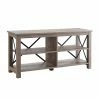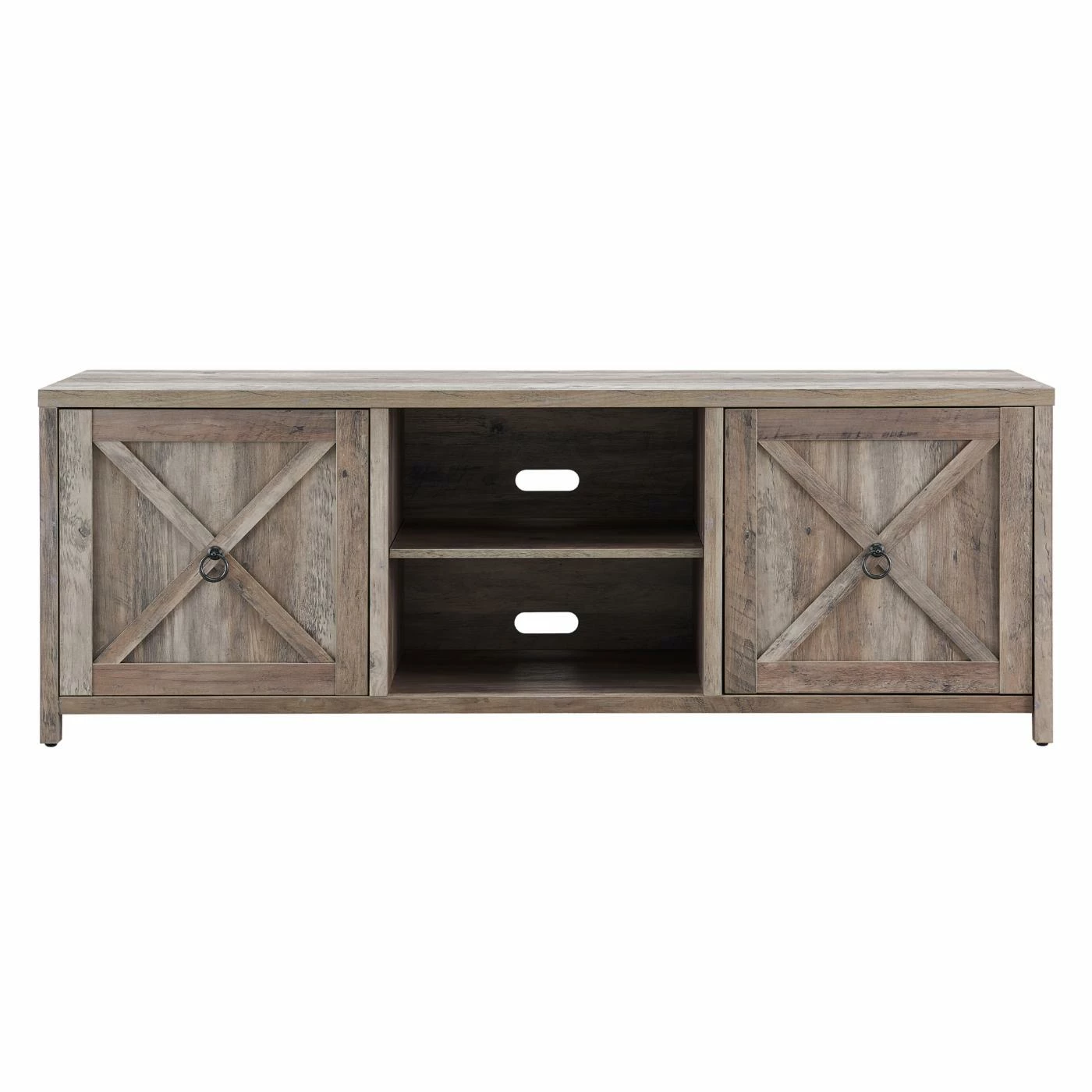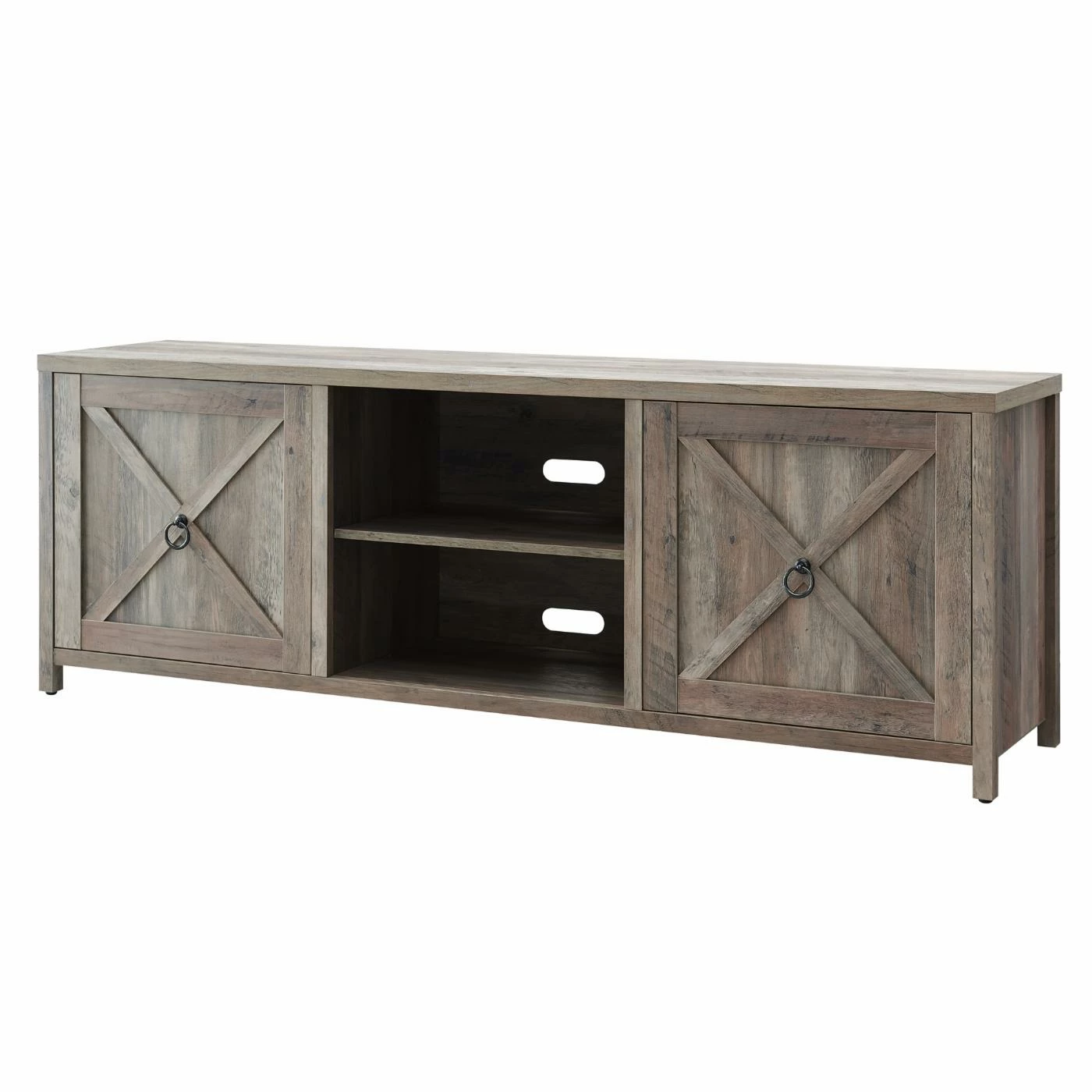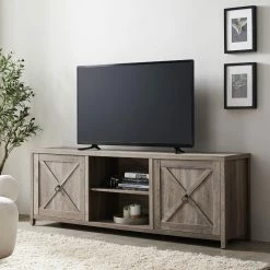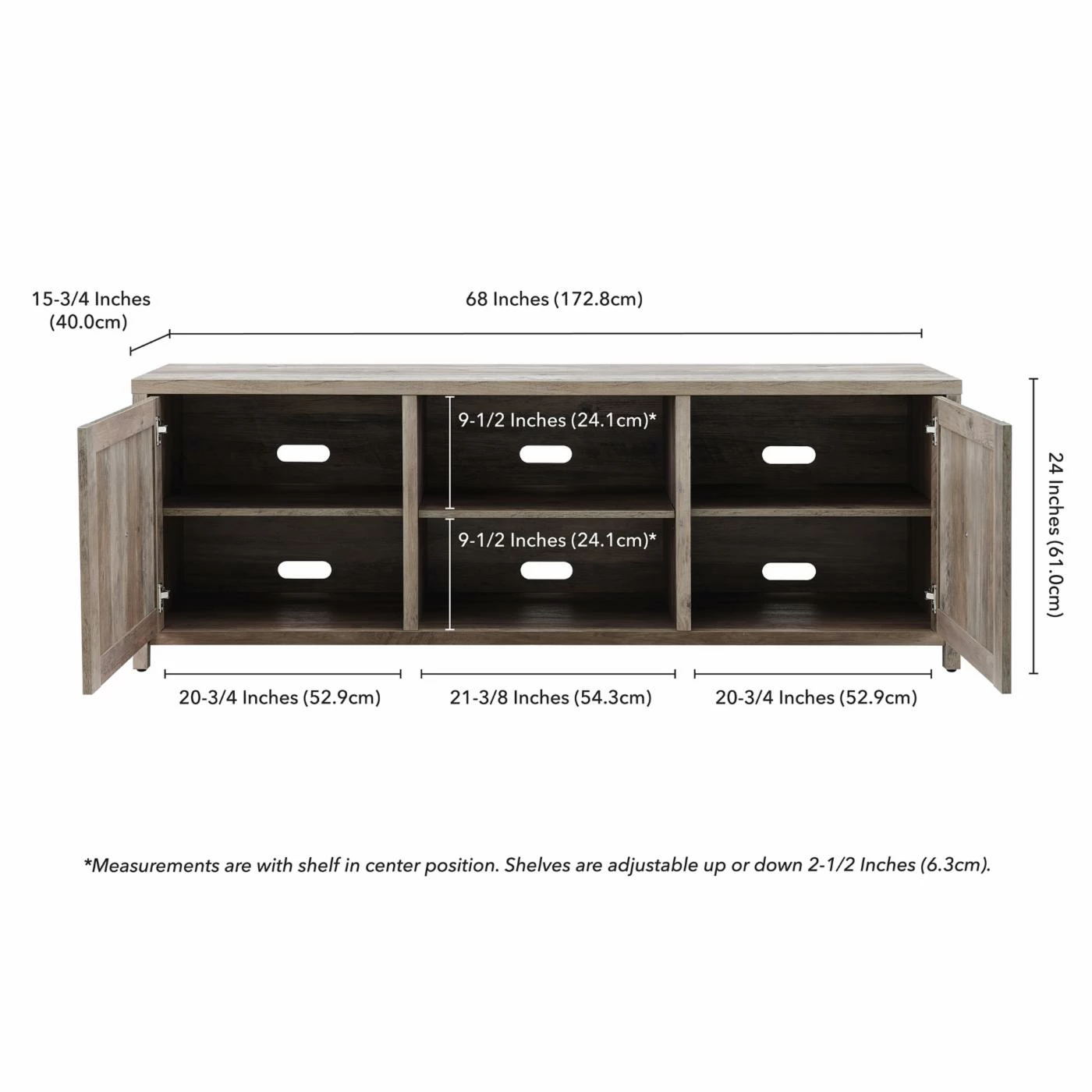 Combine functionality and classic modern farmhouse design with this sturdy TV stand. Its rich wood tone creates a warm neutral palette that will blend seamlessly into any color scheme, while its side cabinets allow for plenty of hidden storage. A must-have for living areas and entertainment spaces, this TV stand sets the stage for the big game, a movie marathon, or that season finale everyoneโs been talking about.