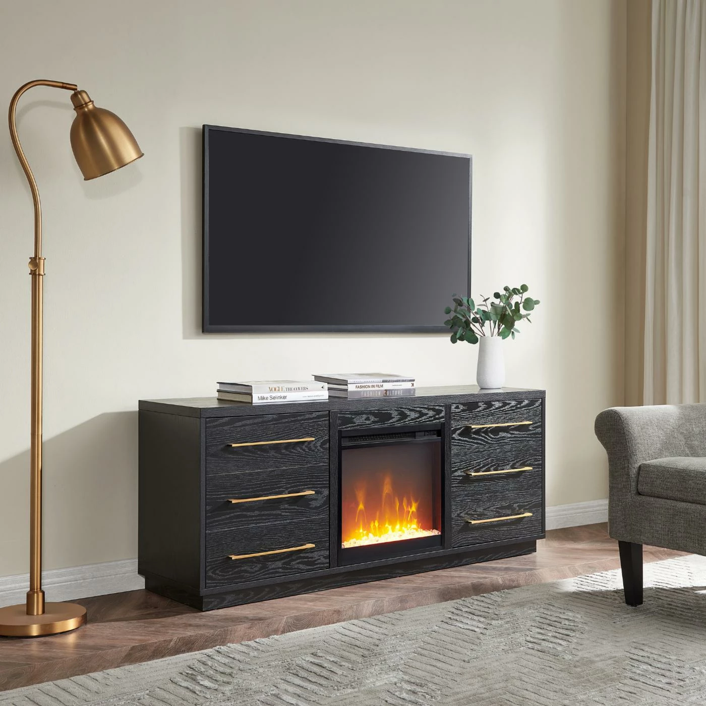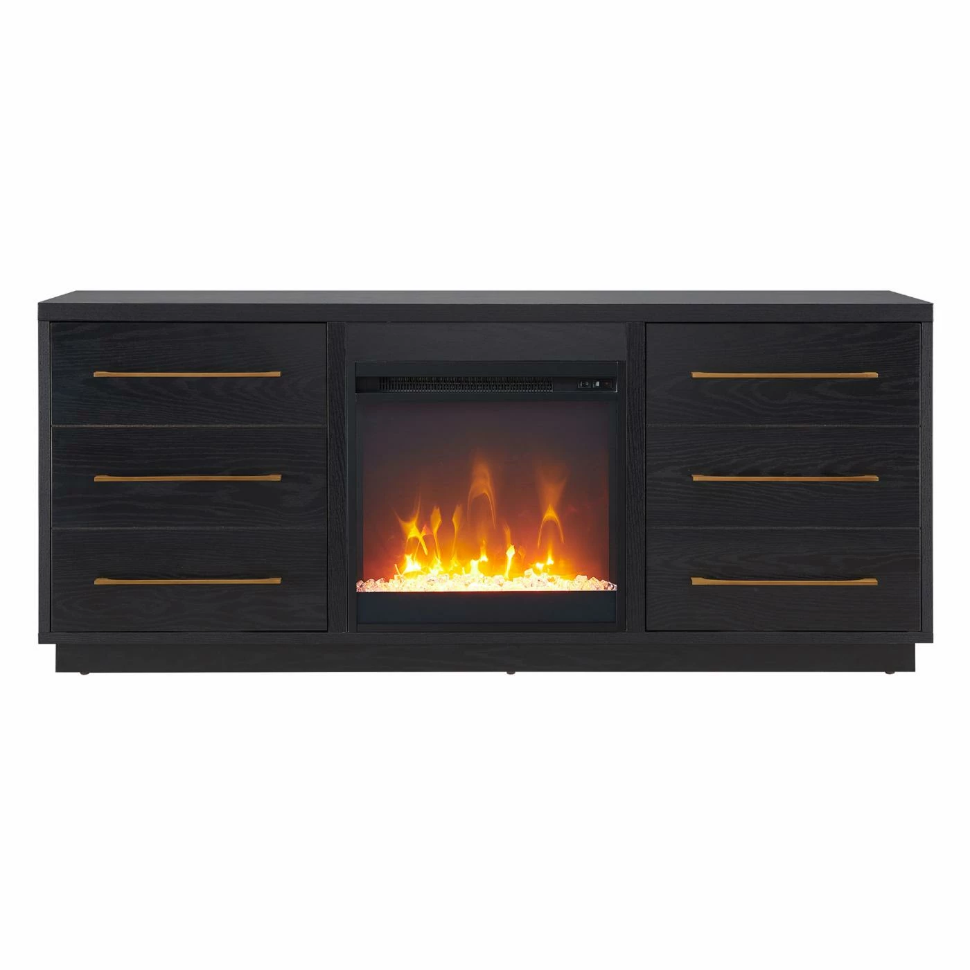 Combine functionality and on trend transitional mid-century design with this modern TV stand, featuring an inset electric fireplace. Its rich wood tone and sleek brass hardware create a warm neutral palette that will blend seamlessly into any color scheme, while its subtle retro styling pairs perfectly with the existing design inspiration of your living room, den, or game room. This sturdy stand features faux drawer detailing, that camouflages two large cabinets with swing-out doors. Cable management cut-outs and adjustable inner shelves keep your media storage and consoles organized while the LED flames and electric heater keep you cozy and warm for movie night, the big game, or binging your favorite shows.