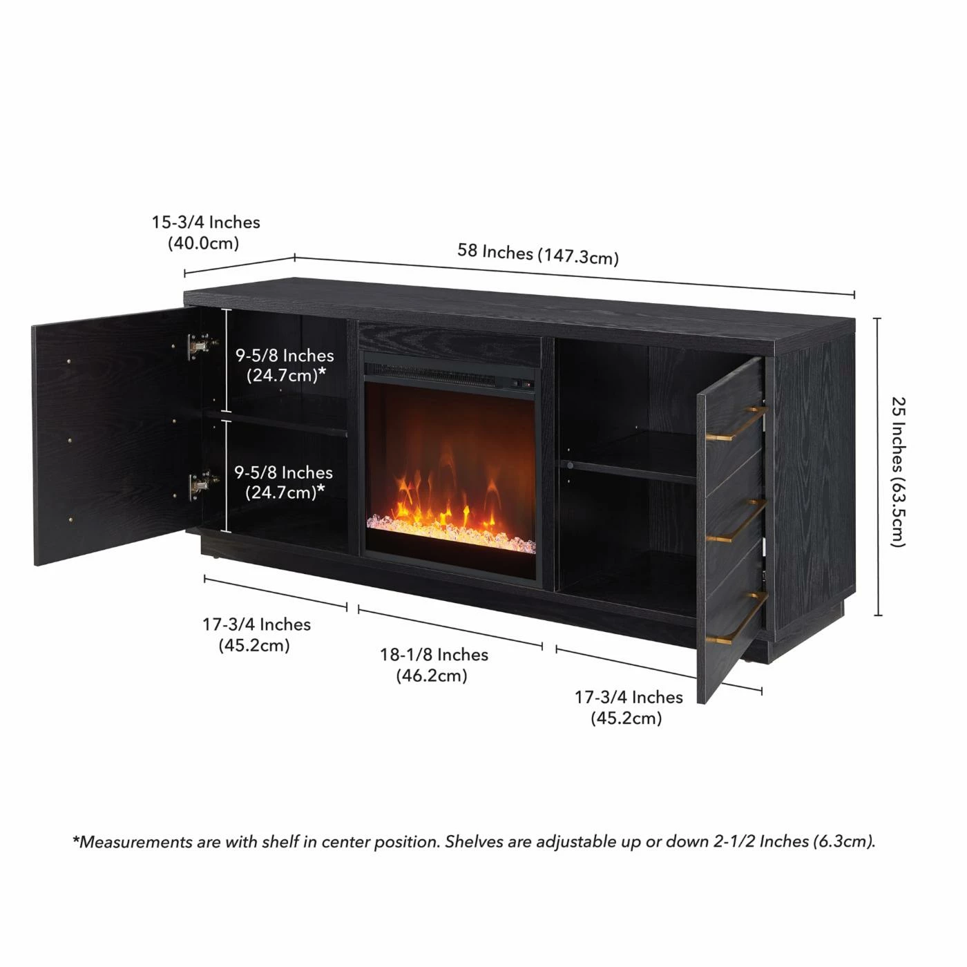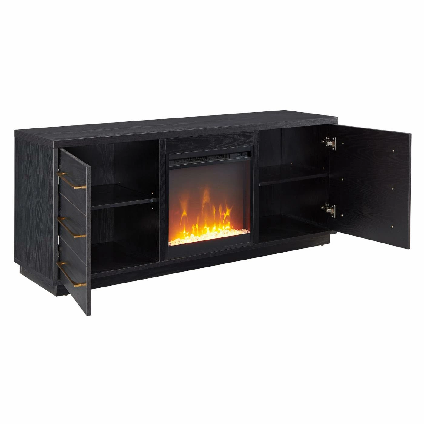 - Features an electric fireplace with wood-look logs, with 4 shelves and 2 enclosed doors for ample storage.