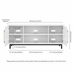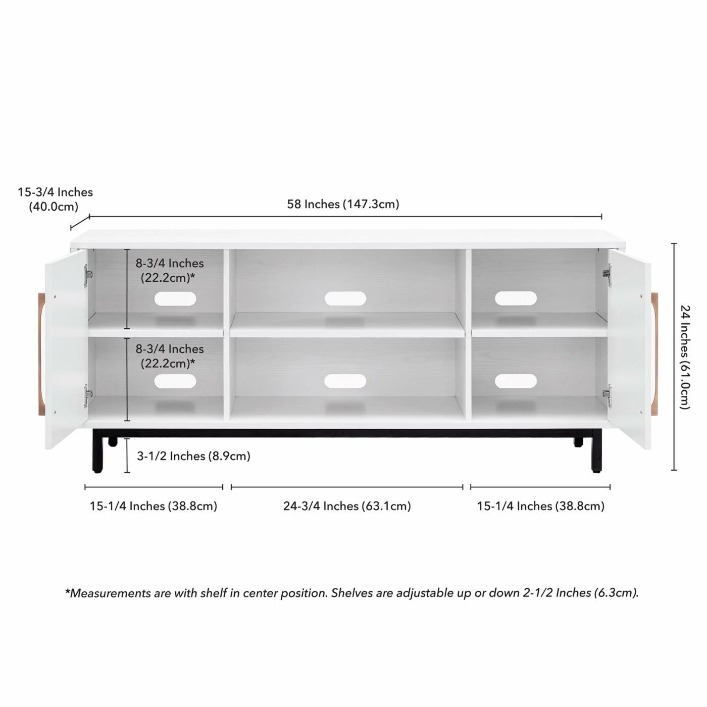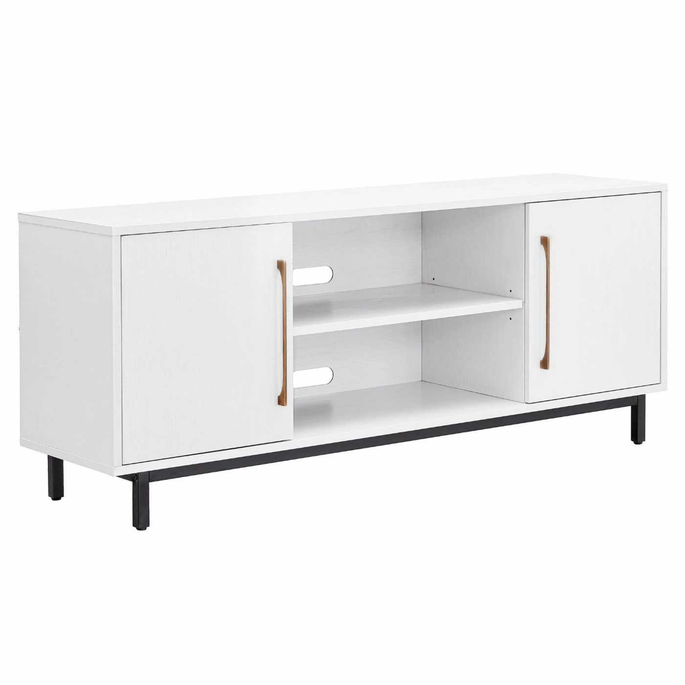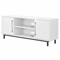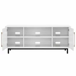 Cultivate effortless mid-century modern style with the clean lines and eye-catching details of this 58β TV stand. Balanced atop four metal legs, this design-forward piece features a rich wood-tone finish complemented by sleek brass-finished cabinet handles. Featuring dual-level open and closed shelving, thereβs plenty of storage space for your consoles and media collections, while cable management cut-outs in the finished back panel keep your cable and cord situation in check.