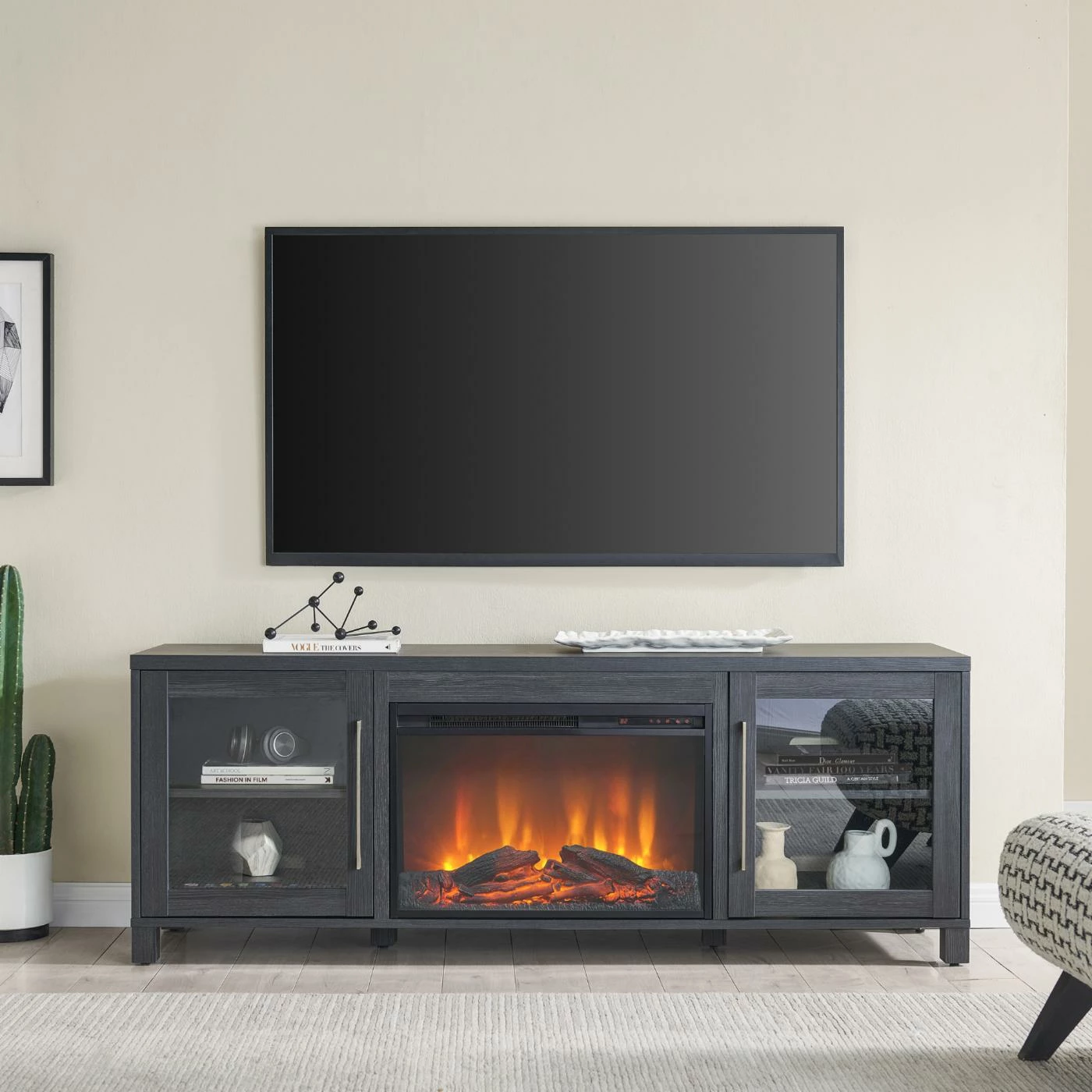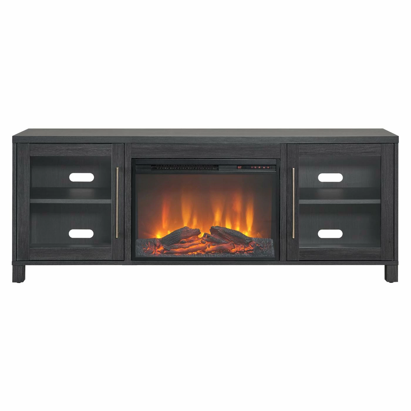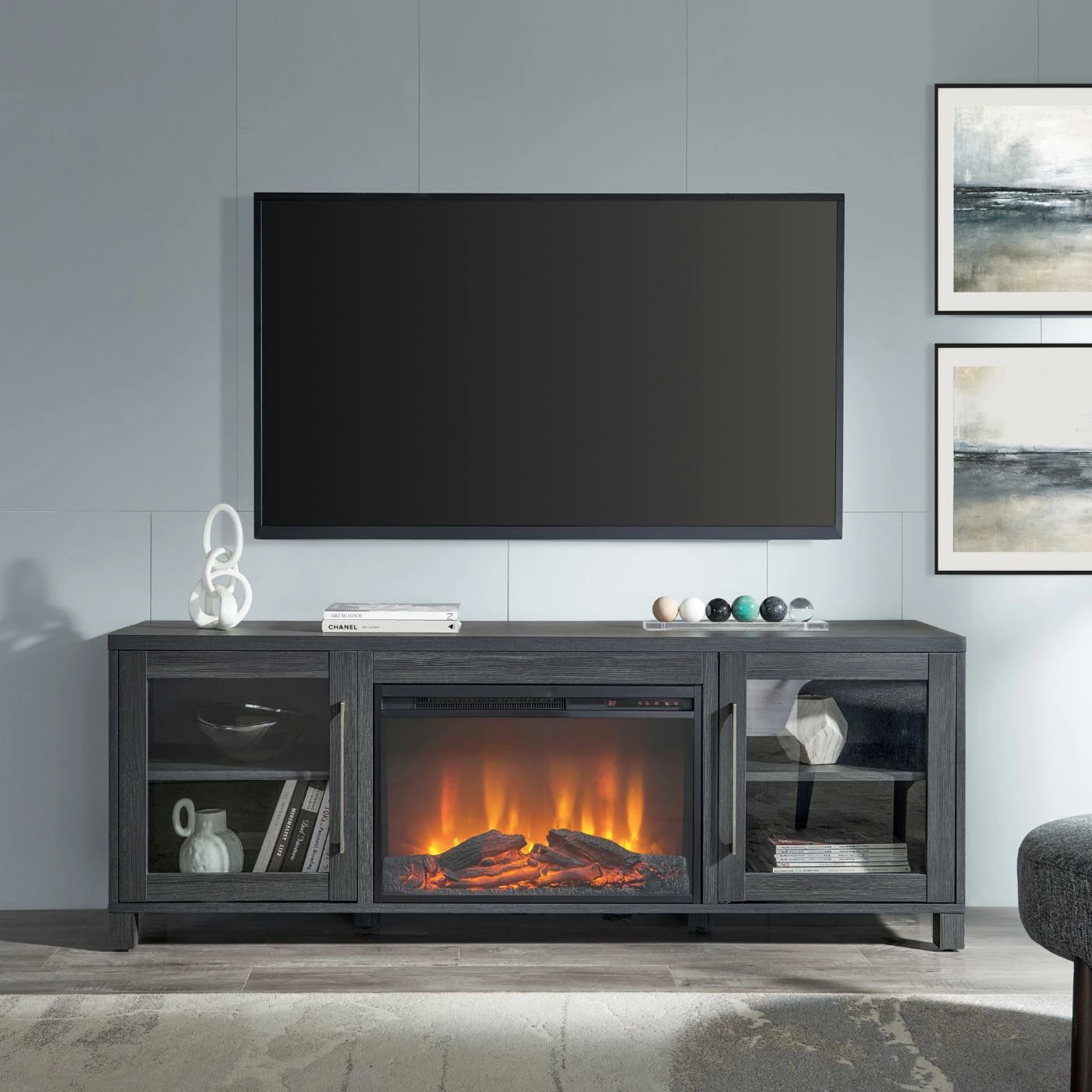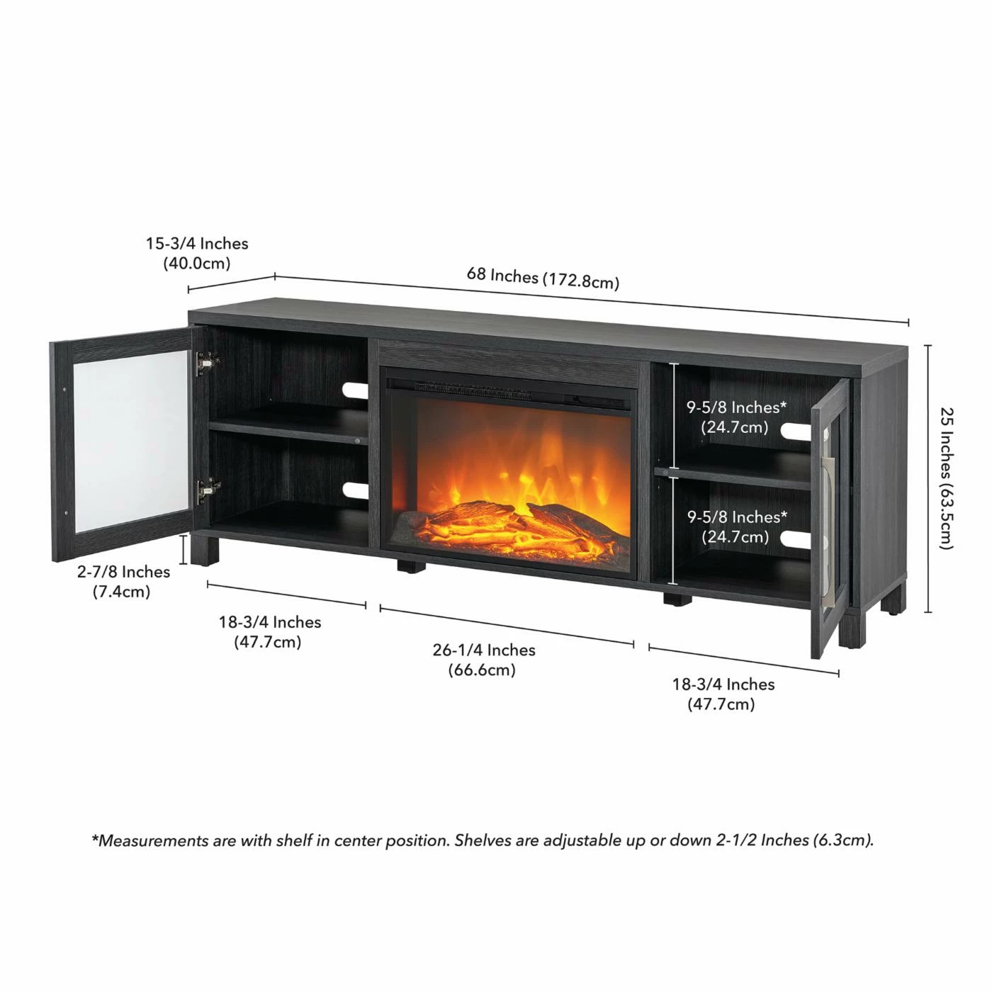 Combine functionality and classic contemporary design with this sturdy TV stand, featuring an inset electric fireplace, controlled by touch screen buttons or the included remote control. Its rich wood tone creates a warm neutral palette that will blend seamlessly into any color scheme, while its glass-doored side cabinets allow for plenty of storage. Cable management cut-outs and adjustable inner shelves help keep your media storage and consoles organized. Stay warm and cozy while you take in the big game, a movie marathon, or that season finale everyoneโs been talking about.
