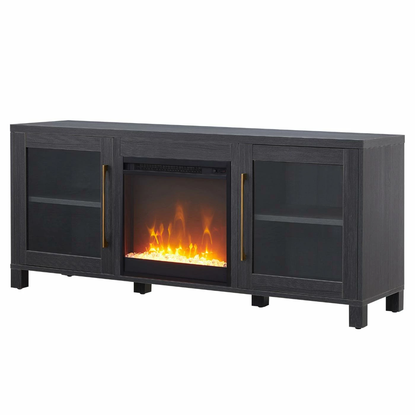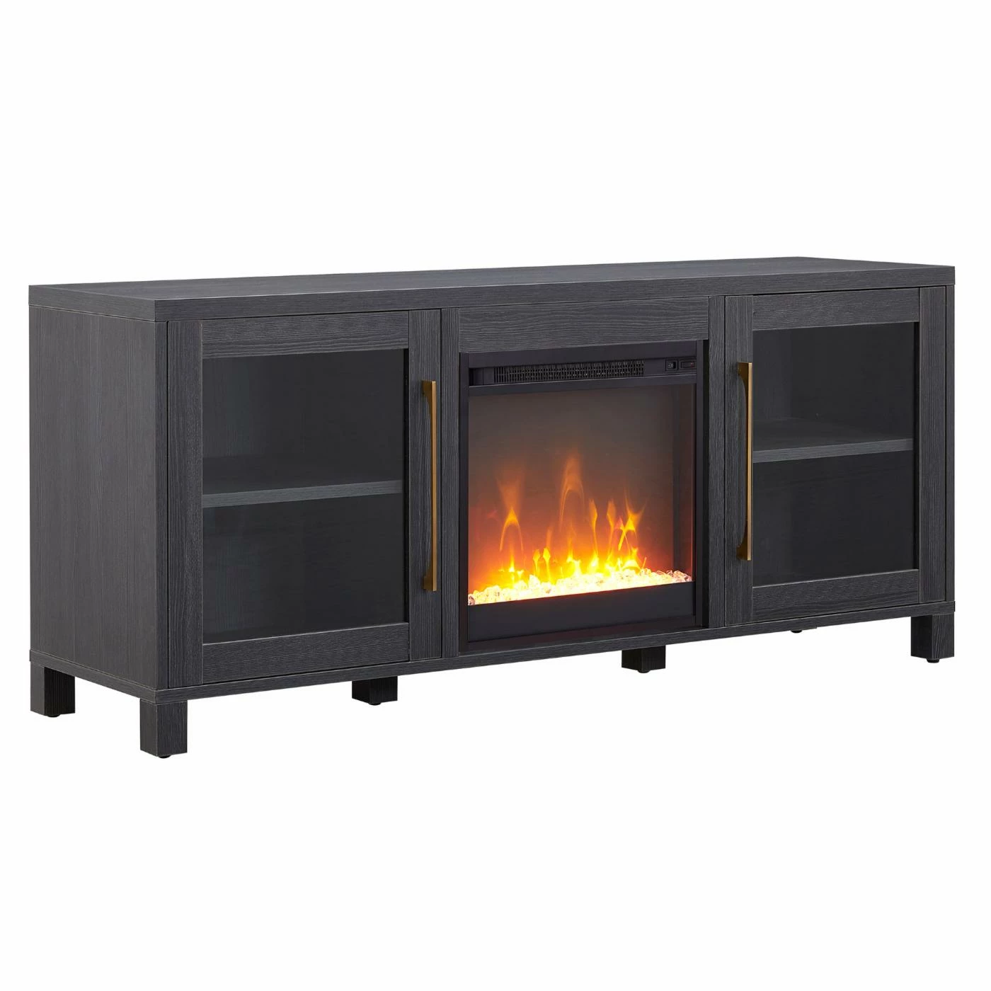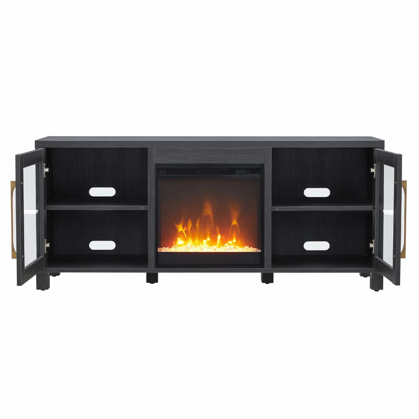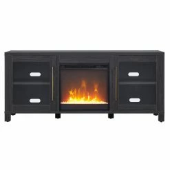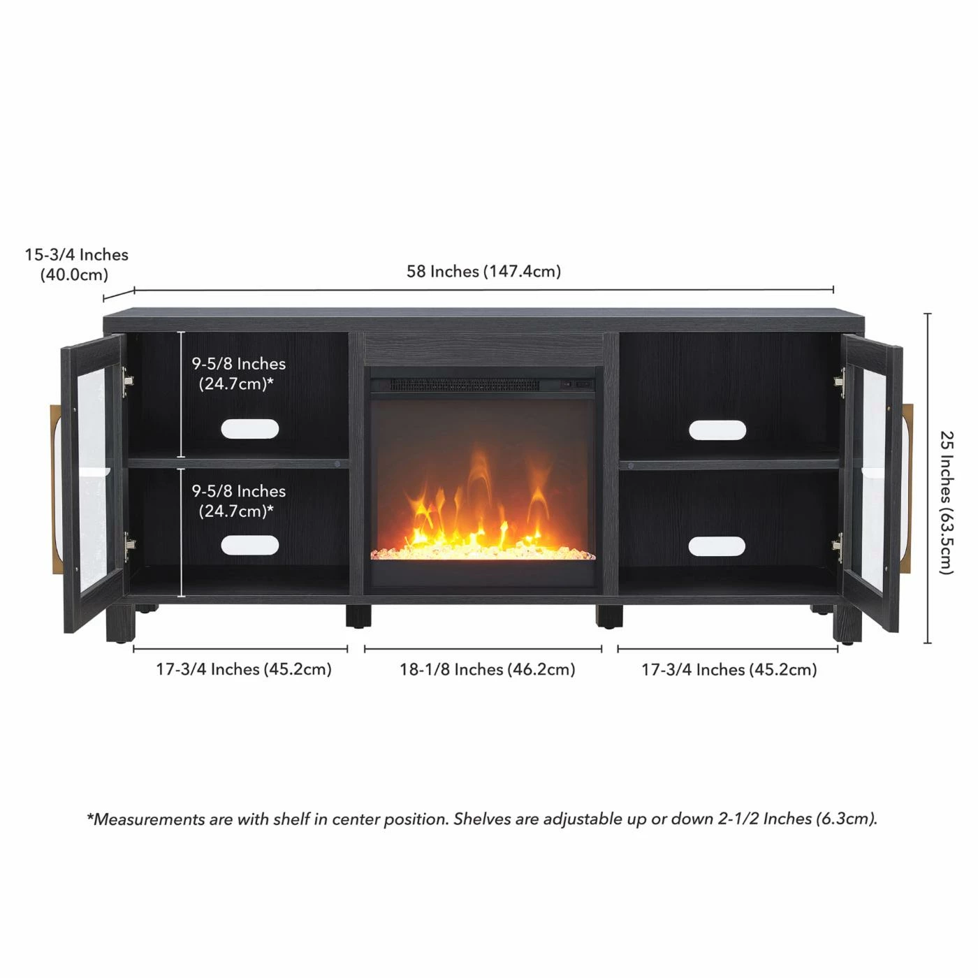 Combine functionality and classic contemporary design with this sturdy TV stand, featuring an inset electric fireplace. Its rich wood tone creates a warm neutral palette that will blend seamlessly into any color scheme, while its glass-doored side cabinets allow for plenty of storage. Cable management cut-outs and adjustable inner shelves help keep your media storage and consoles organized. Stay warm and cozy while you take in the big game, a movie marathon, or that season finale everyoneβs been talking about.