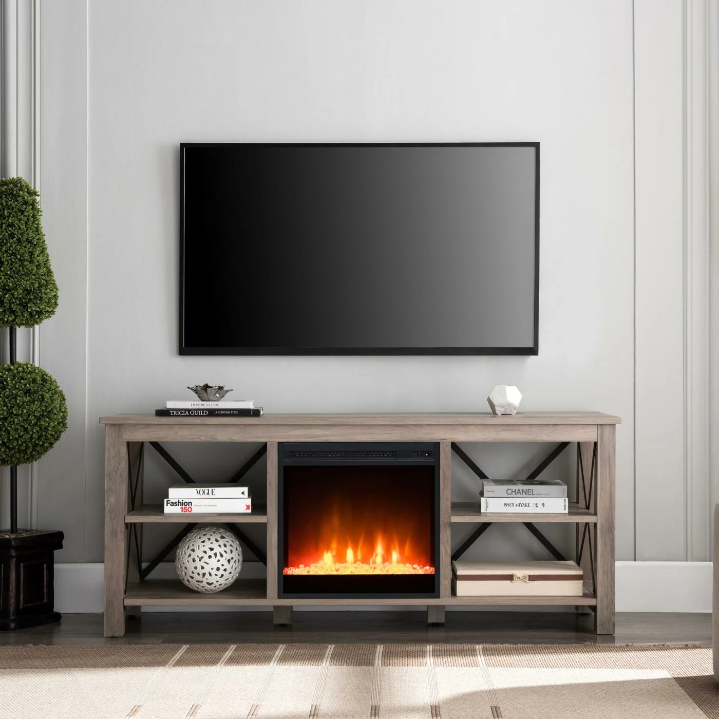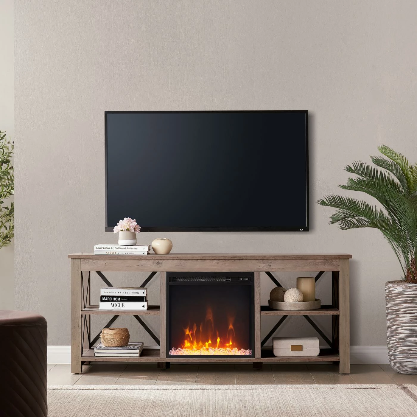 Strong geometric lines and an inset electric fireplace set this modern farmhouse-inspired TV stand apart. Its X-shaped black metal accents offset the rich wood tone, creating a warm neutral color palette that will blend seamlessly into any design scheme. Stay warm and cozy while you take in the big game, a movie marathon, or that season finale everyone’s been talking about.