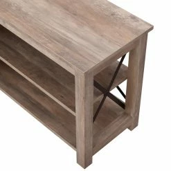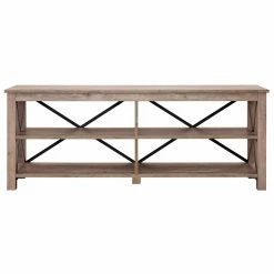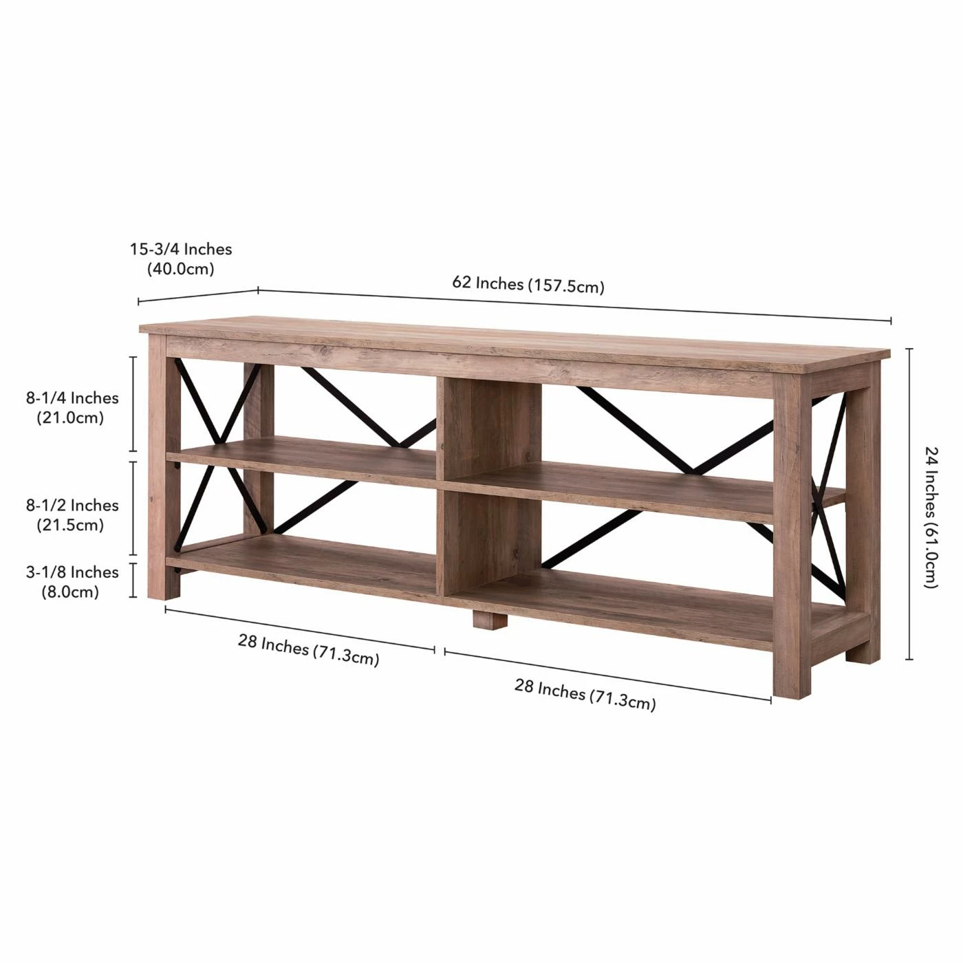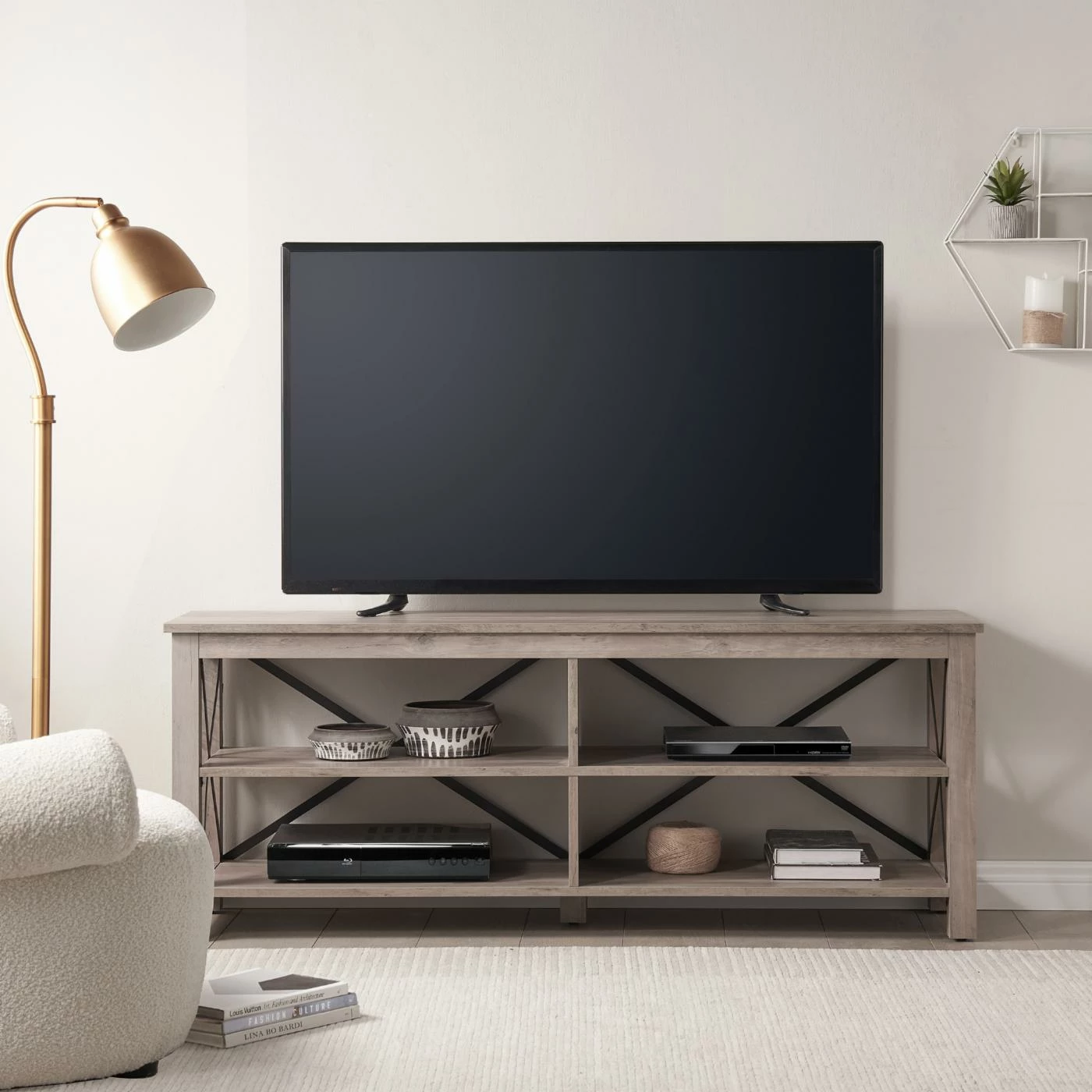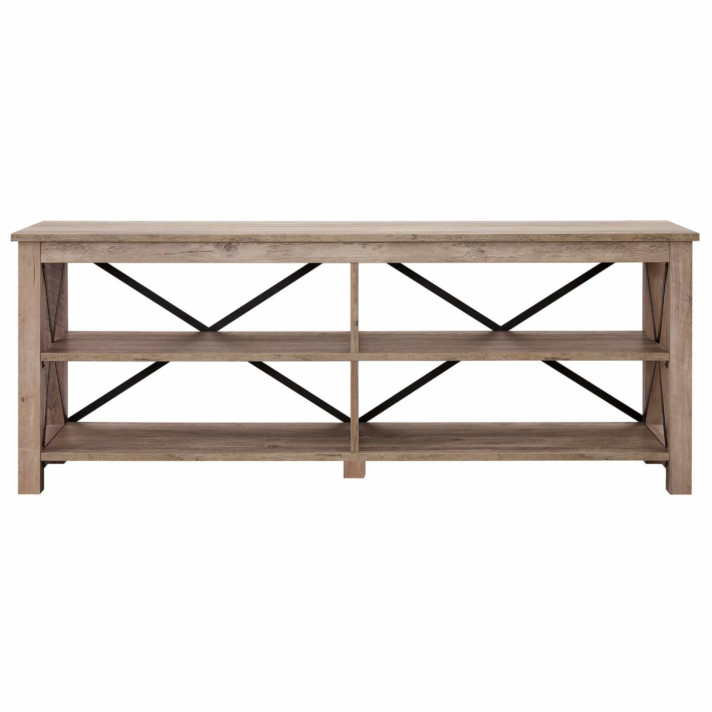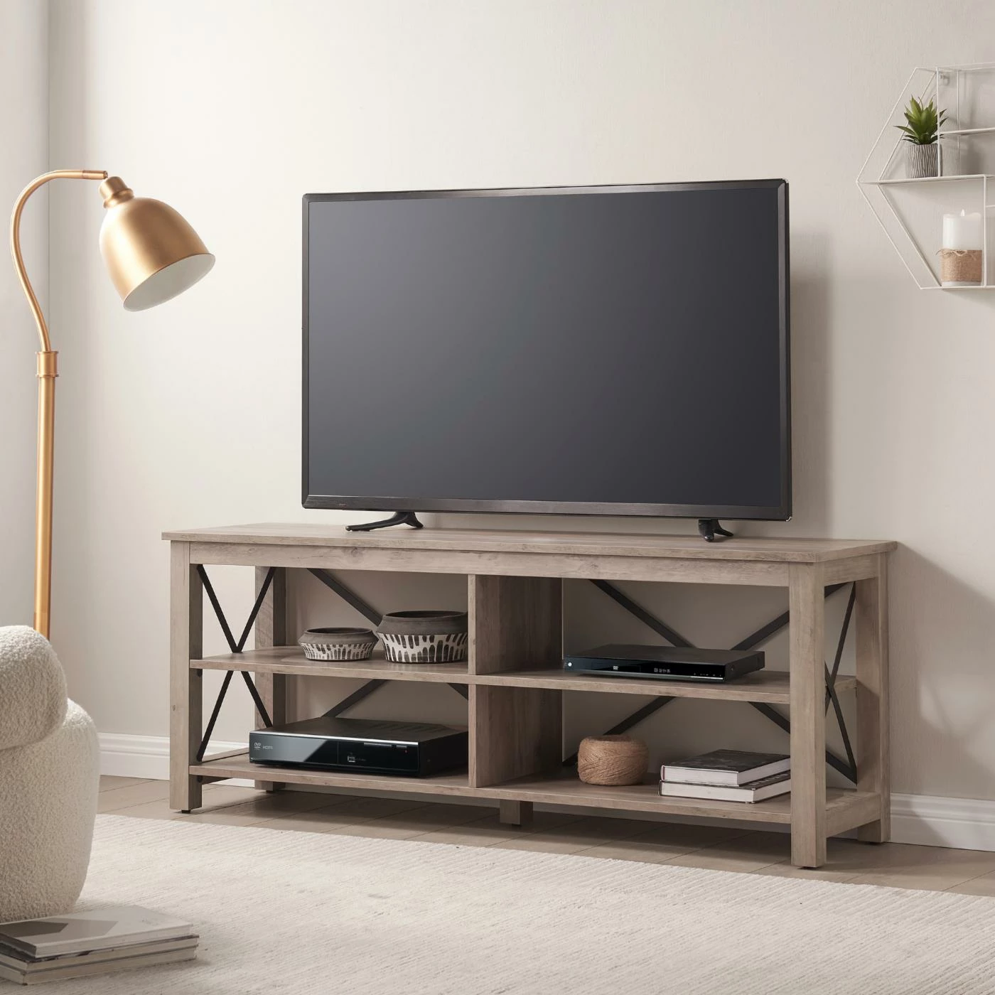 Strong geometric lines set this modern farmhouse-inspired TV stand apart. Its X-shaped black metal accents offset the rich wood tone, creating a warm neutral color palette that will blend seamlessly into any design scheme. A must-have for living areas and entertainment spaces, this TV stand sets the stage for the big game, a movie marathon, or that season finale everyoneβs been talking about.