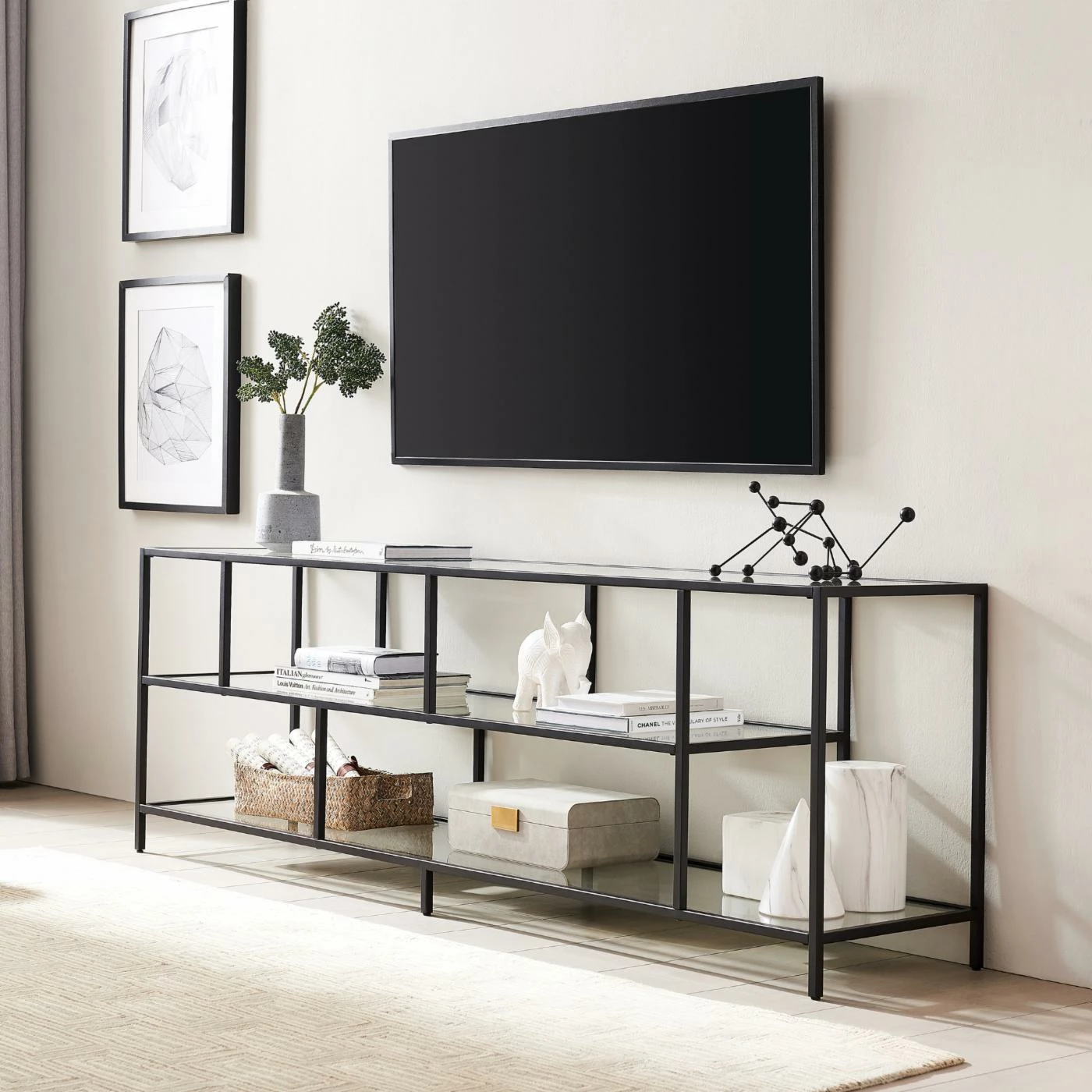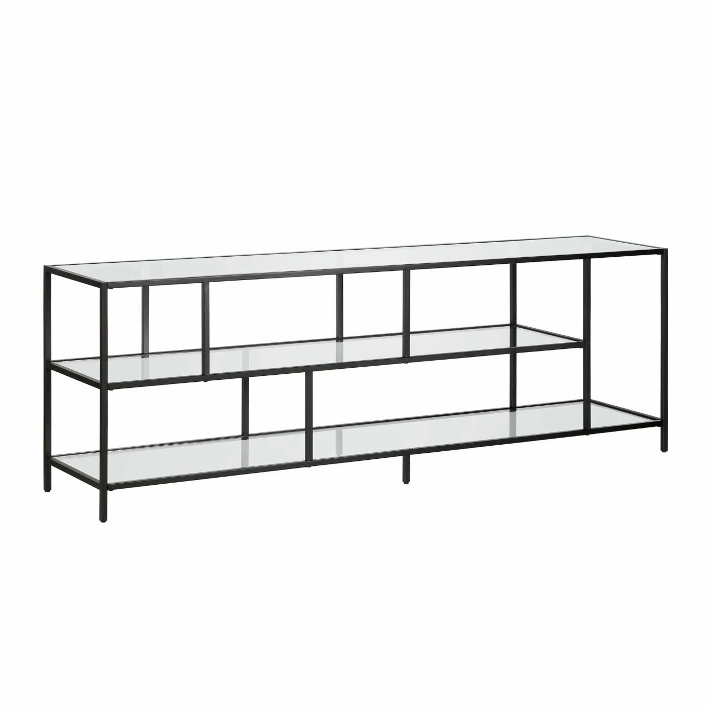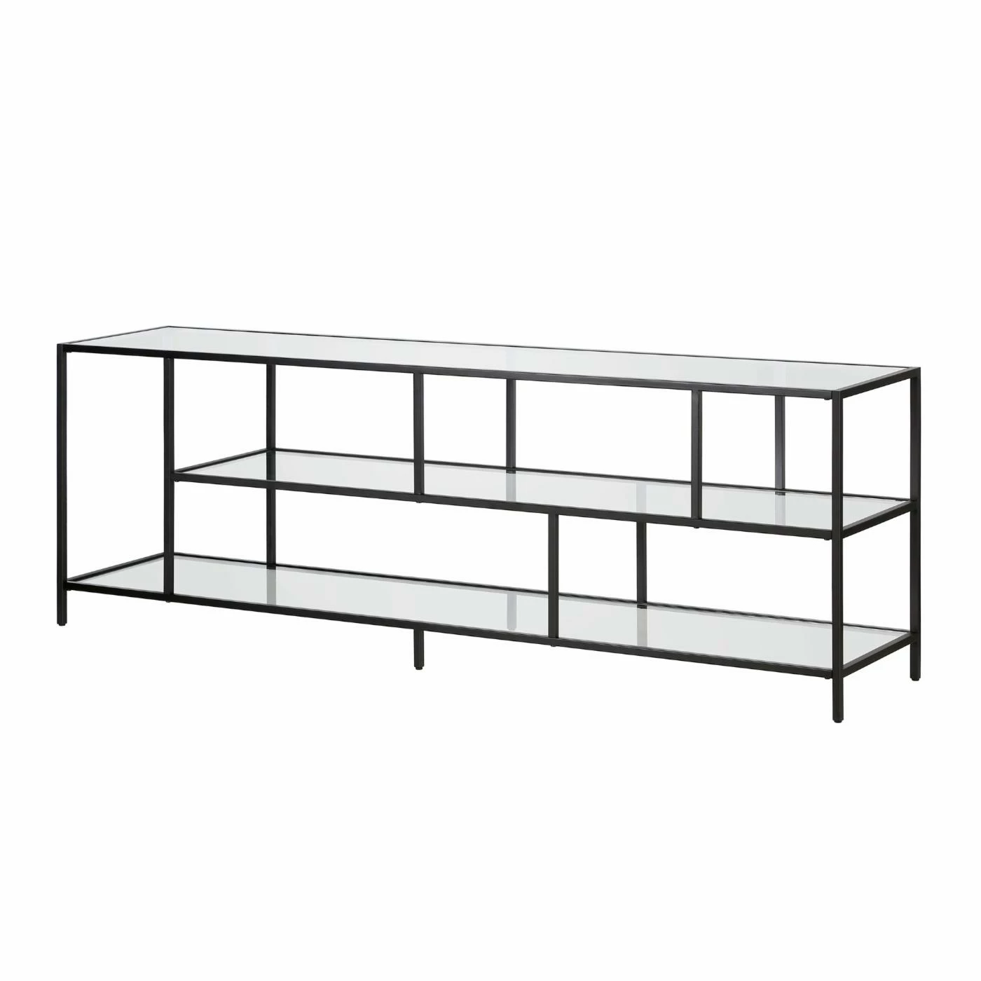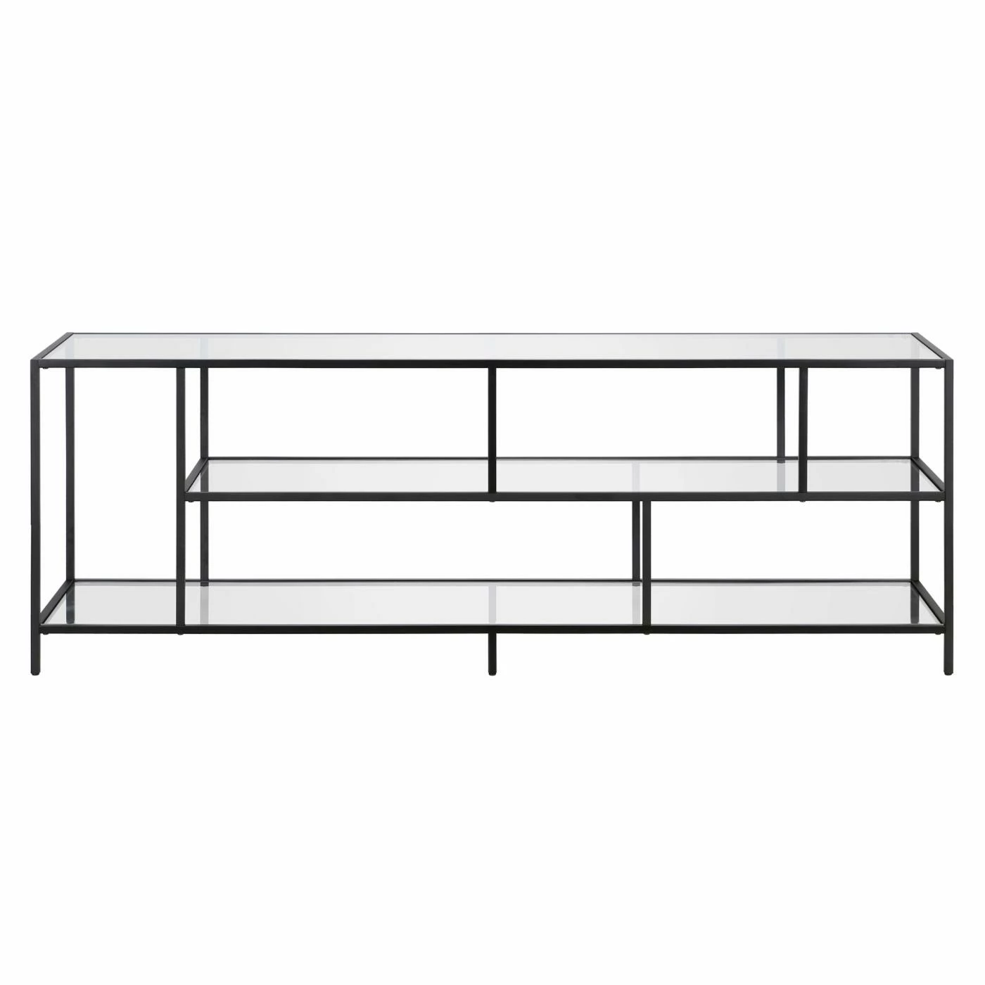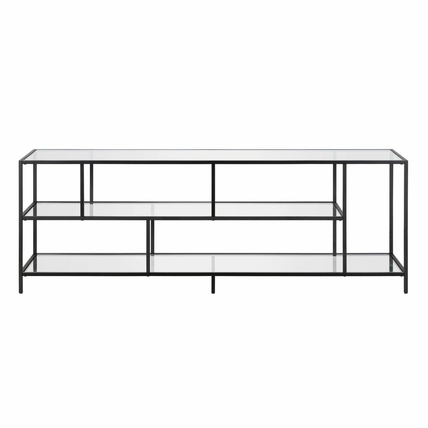 A must-have for living areas and entertainment spaces, this TV stand sets the stage for the big game, a movie marathon, or that season finale everyoneβs been talking about. Crafted from steel, it strikes a clean-lined silhouette and boasts a metallic finish and glass shelves for a look that blends with nearly any color palette.