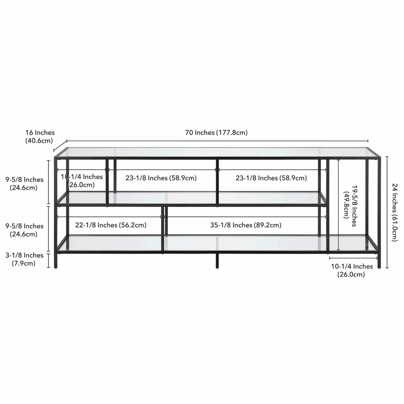 - Measures 70W x 16D x 24H in.