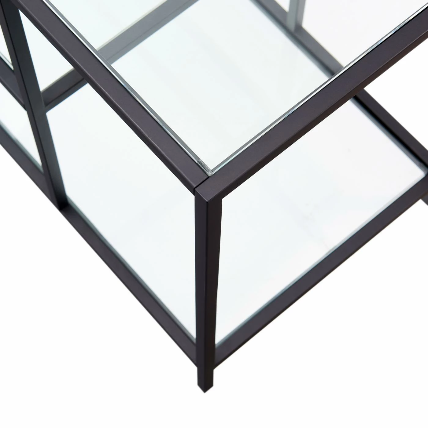 - Constructed of sturdy metal and glass materials in a handcrafted Blackened Bronze finish.
