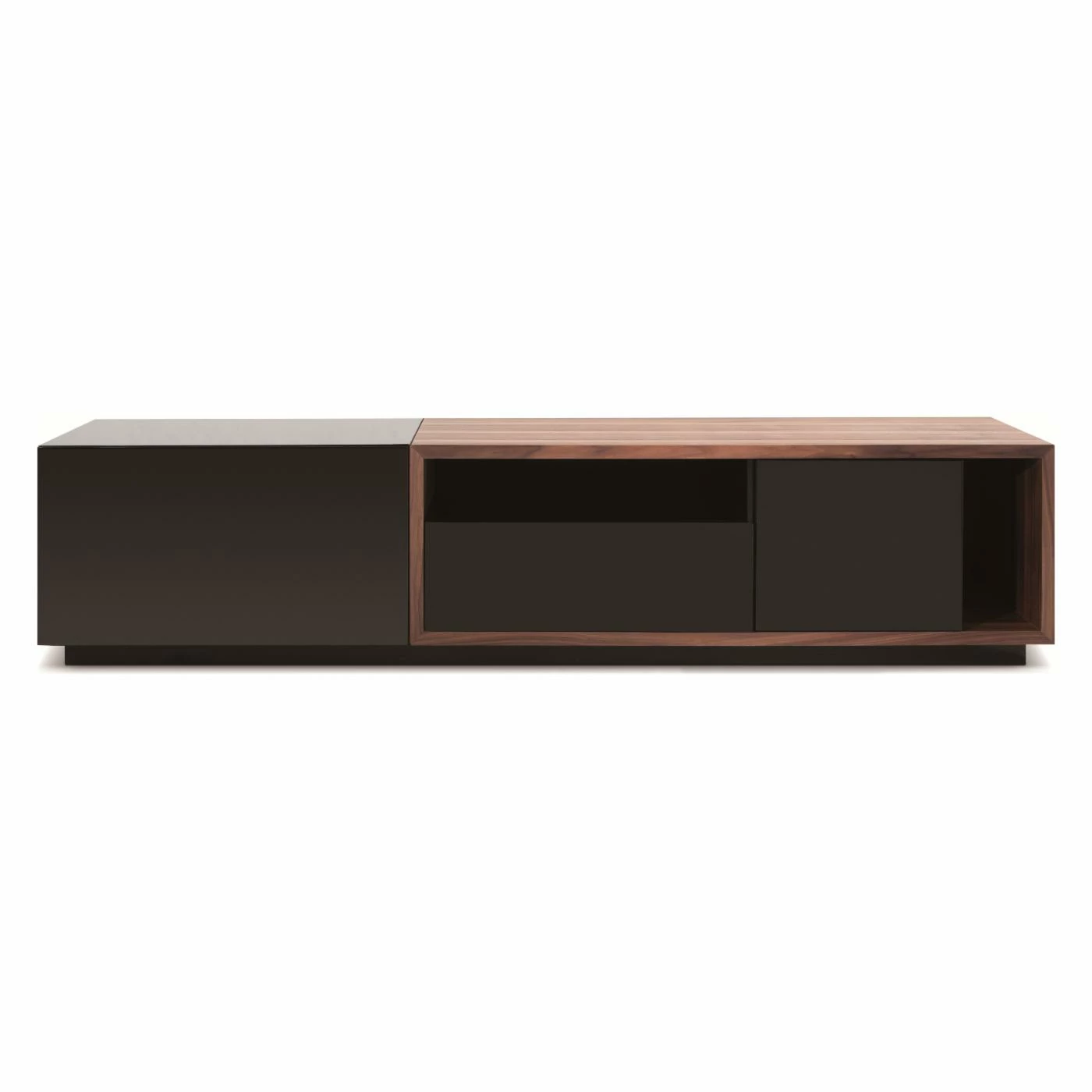 Luscious modern styling makes the J&M Furniture W TV047 TV Stand a centerpiece for your living room or den, one that quietly makes a statement while emphasizing a clean, uncluttered atmosphere. Drawers feature German-made hardware and soft-closing tracks. This piece offers a two-tone effect that showcases the natural beauty of walnut veneers against a black high-gloss lacquer finish. The horizontal open shelf can store media devices, while the vertical open shelf can display a small selection of vinyl LPs, a vase, or a few art books.