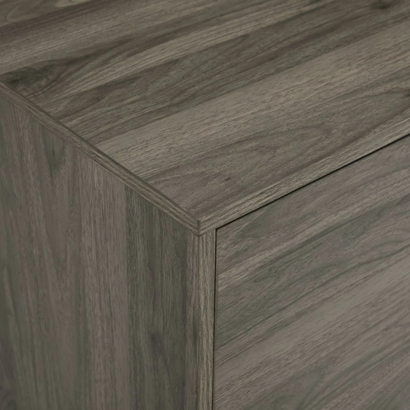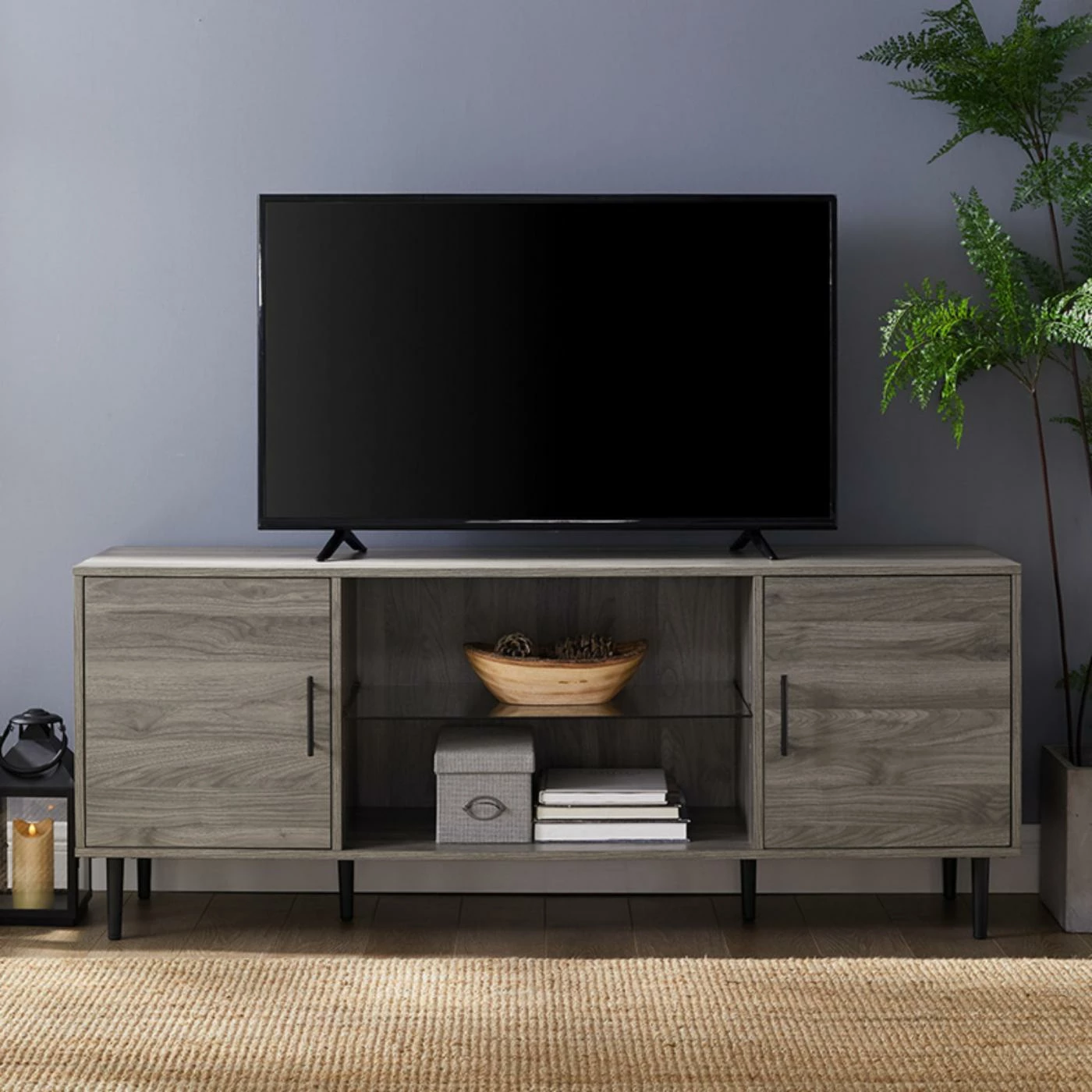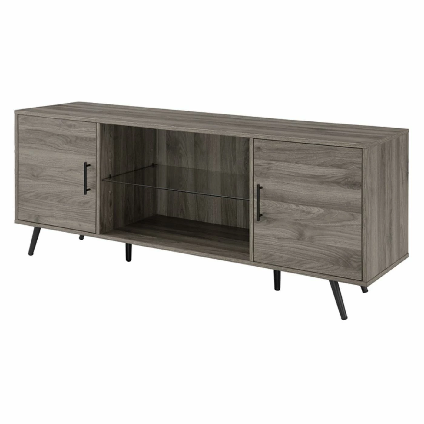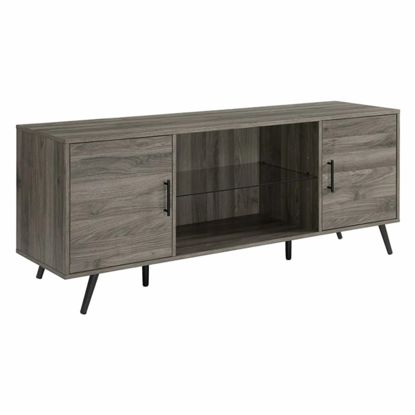 Indulge in the mid-century modern style you love with the Manor Park 60 in. Dark Walnut 2-Door Console TV Stands. Featuring sleek, angled legs and a tempered glass center shelf, this TV stand adds an air of elegance to any setting. Adjustable shelves behind the cabinet doors give you ample space for holding your media devices, gaming consoles, and more. With its slate gray finish and high-grade engineered wood construction, this piece blends seamlessly with any decor.
