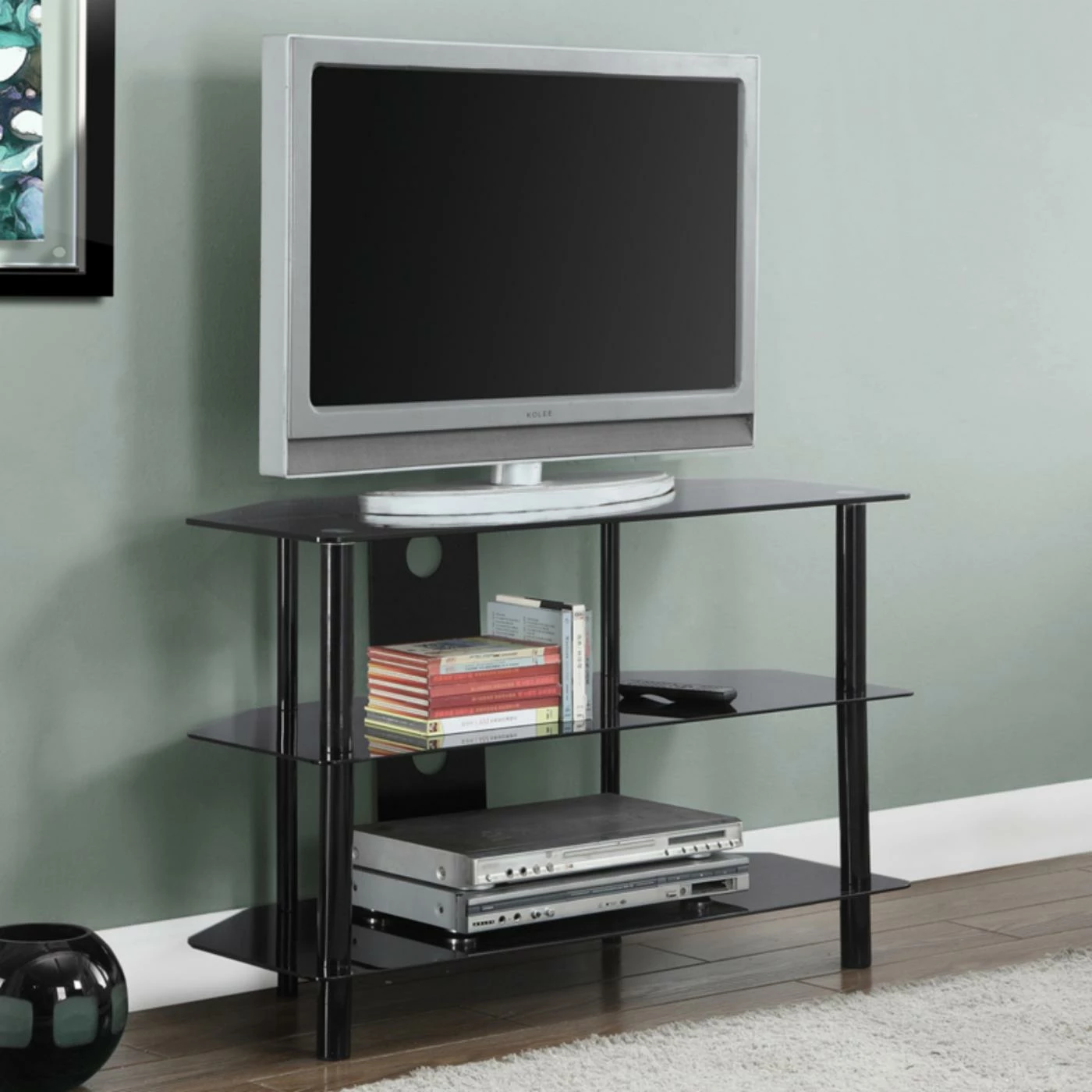 The sleek and modern Monarch 36 in. TV Stand with Tempered Glass – Black is the perfect fit for the minimalist-loverβs space. This contemporary-style TV stand is constructed of glass and has a metal frame with a high-gloss black finish. The three open, tempered-glass shelves offer plenty of space to store electronics, games, remote controls, and even your favorite decorative items without overpowering your space. Choose whether to place the stand against a wall or tuck it neatly in the corner of the room. Its low profile makes it an ideal addition to smaller spaces with a flair for contemporary design.